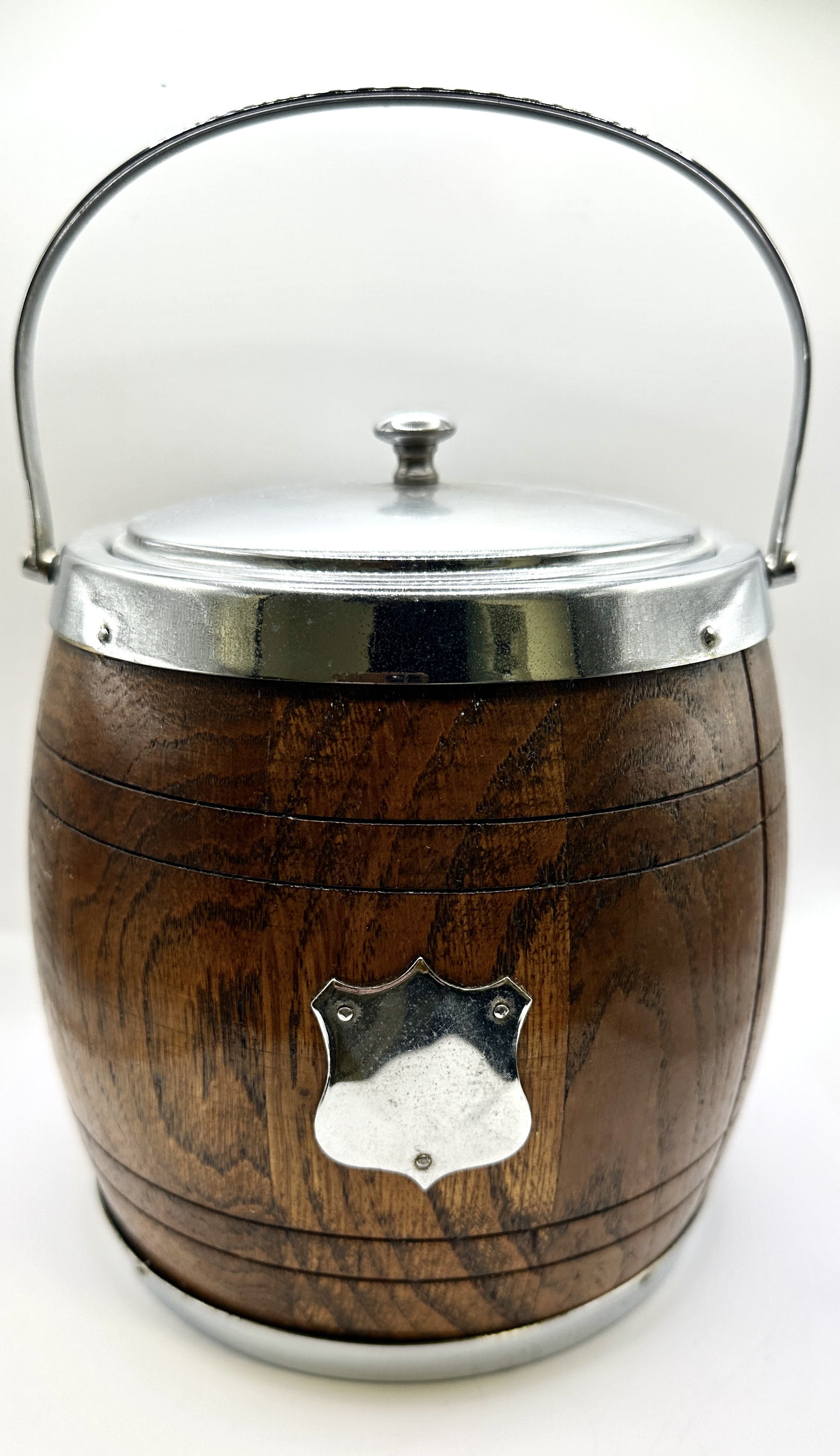 A traditional English coopered oak biscuit barrel featuring wooden staves bound by silver-toned metal hoops at the top and base. The barrel is fitted with a matching silver-toned lid featuring a central turned knob and a wire swing handle. A blank shield-shaped metal cartouche is mounted to the front elevation. The interior contains a removable off-white ceramic liner. Accompanying the barrel is an assortment of five small, turned, and hand-painted wooden miniature fruits, including representations of an apple, lemon, lime, pear, and a grooved bulbous form. The base of the ceramic liner displays remnants of a blue printed mark, including the numeral 7 and other illegible characters.