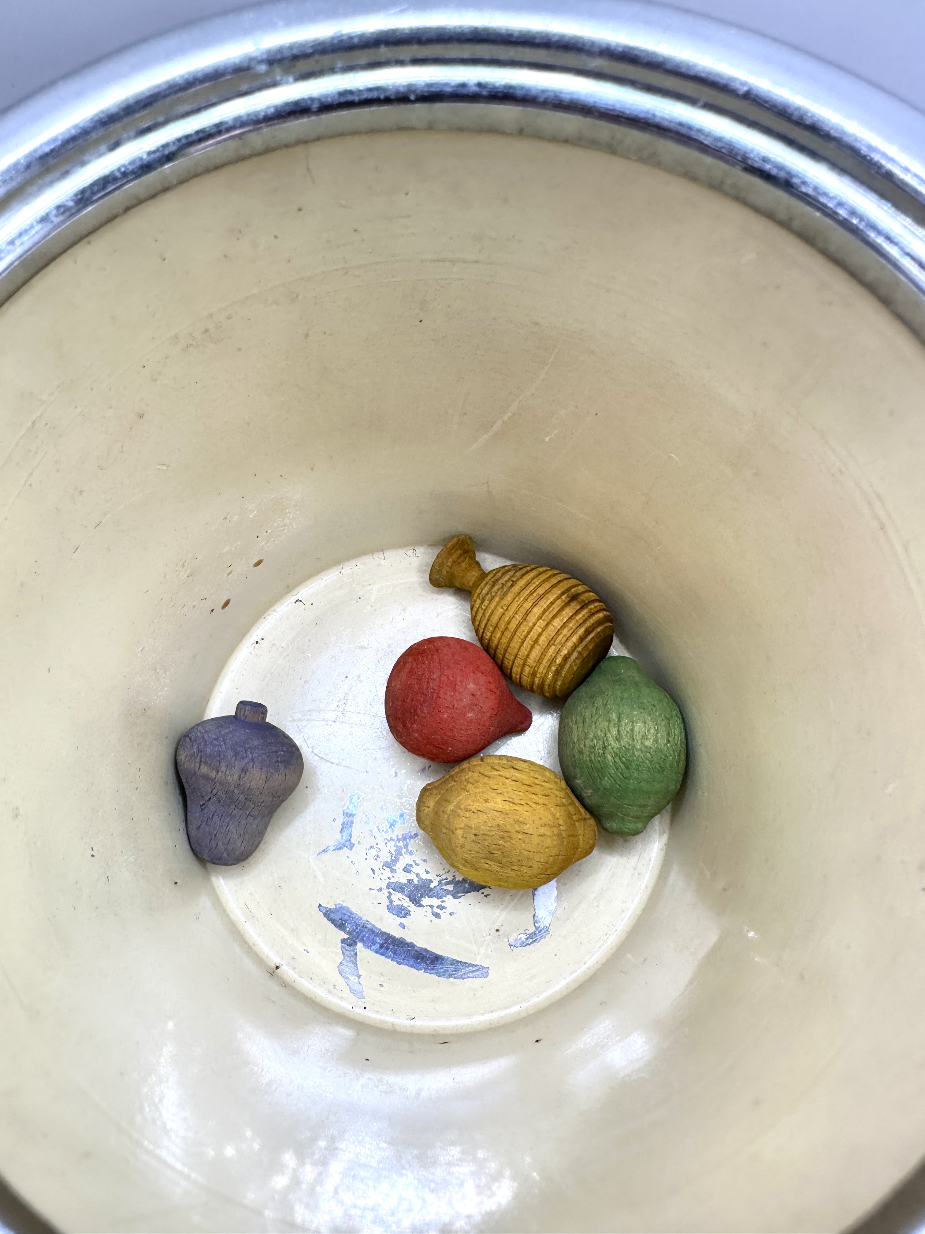 The oak body shows an aged patina and rich colour. The silver-toned metalwork exhibits significant wear, oxidation, and pitting, notably to the lid and upper rim. The ceramic liner shows fine surface crazing and some staining to the interior base. The miniature wooden fruits display minor scuffs and paint loss consistent with age and use.