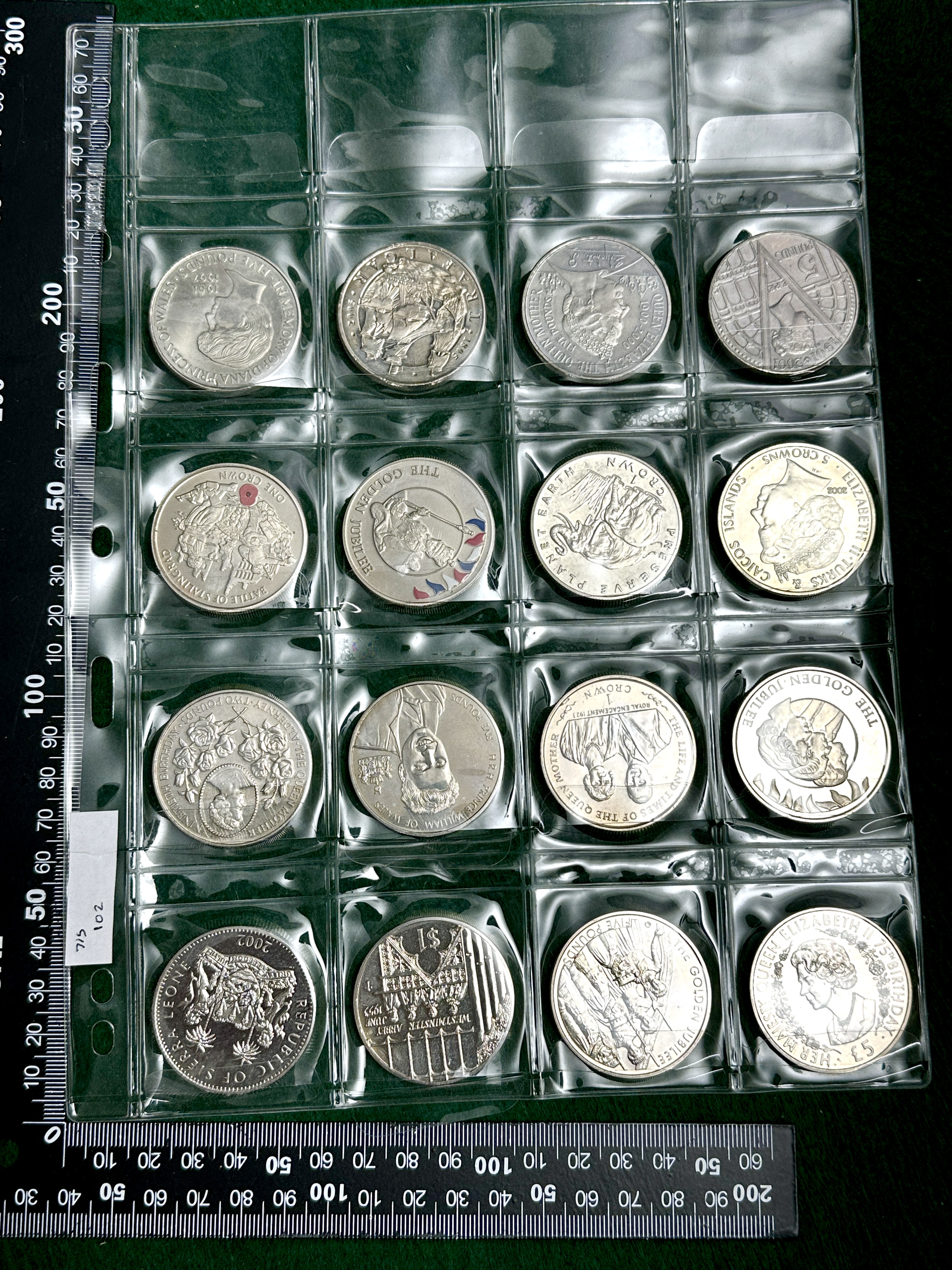 A collection of commemorative coins primarily in crown-sized denominations including Five Pounds, Five Crowns, One Crown, and One Dollar. Issuing nations and territories include the UK, Alderney, Turks and Caicos Islands, and the Republic of Sierra Leone. Commemorative subjects featured include the Golden Jubilee of Queen Elizabeth II, the 100th Birthday of the Queen Mother, Memorial to Diana Princess of Wales, the 200th anniversary of the Battle of Trafalgar, and the 1801-1901 Victoria centenary. Obverse portraits include Queen Elizabeth II, the Queen Mother, Diana Princess of Wales, and Prince William. The collection includes a Preserve Planet Earth series coin and a Battle of Stalingrad commemorative with selective red colour application on the reverse. The coins are presented in a clear plastic folder page.