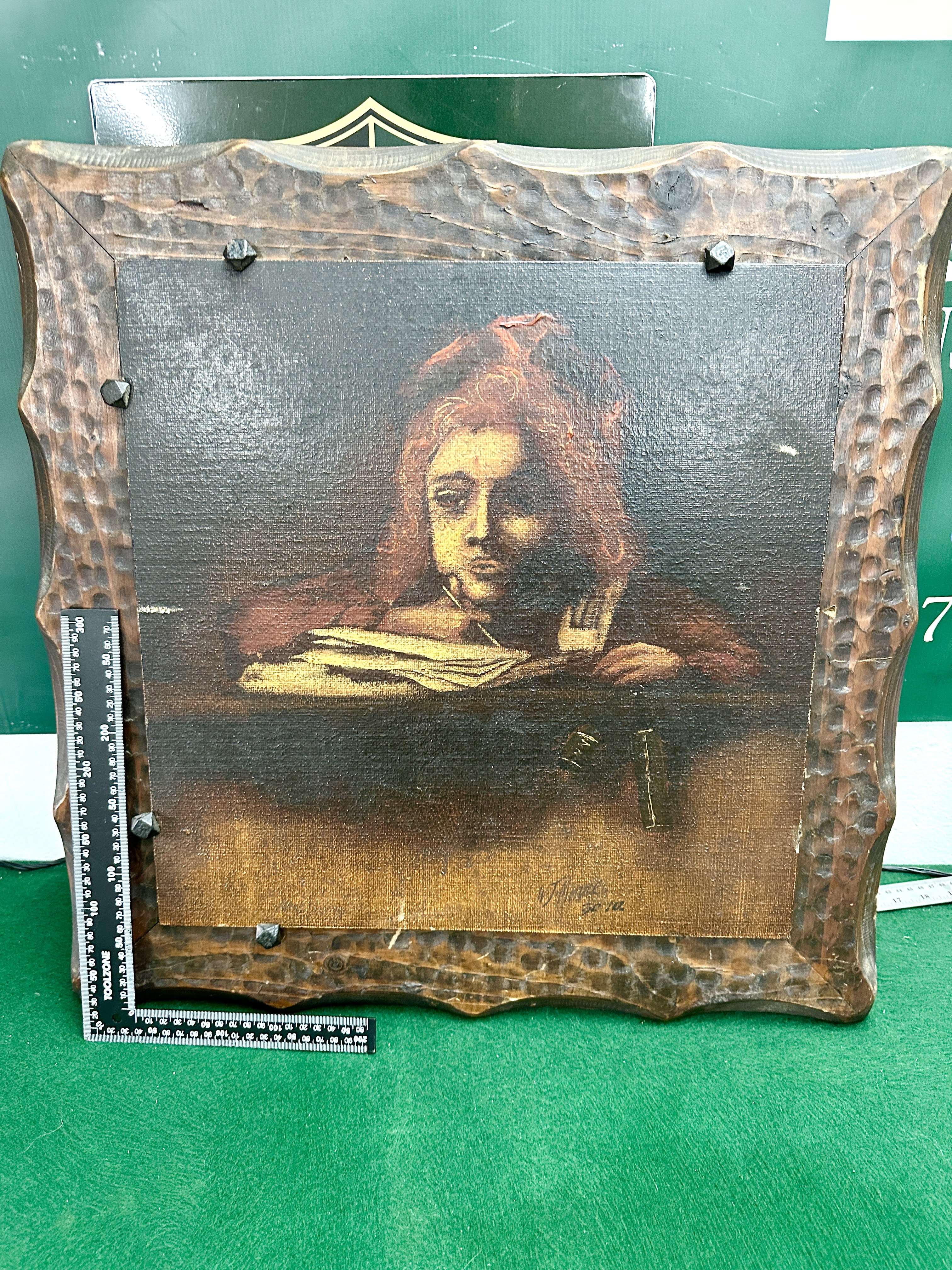 A contemporary oil or acrylic painting on canvas by the artist W Marks, dated 2010. The work is a stylistic interpretation after Rembrandt van Rijn’s 1655 painting Titus at his Desk. The composition depicts a young figure with reddish-brown hair leaning over a desk with open papers, rendered with a dramatic chiaroscuro effect that focuses light on the face and foreground. The brushwork is expressive and loose, featuring visible impasto in the highlights. The piece is signed W Marks and dated 2010 in the lower right-hand corner. It is mounted within a heavy, rustic wooden frame with a hand-carved, scalloped profile and is secured to the front with six decorative black metal studs.