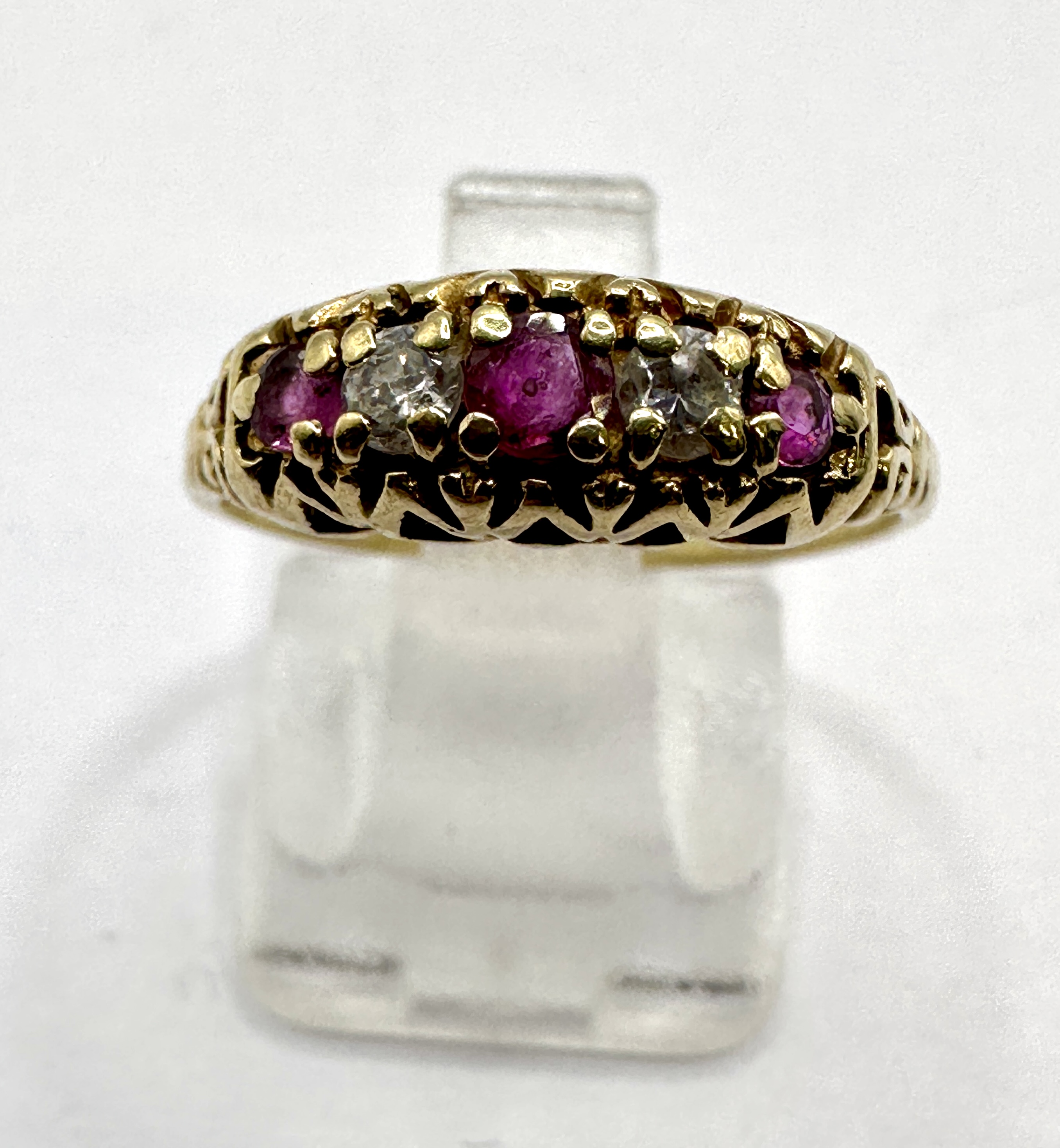 A five-stone carved half-hoop ring crafted in 9 carat yellow gold. The design features three graduated round-cut rubies alternating with two old-cut diamonds. The gemstones are claw-set into a decorative mount with a pierced and scrolled gallery, which tapers to a plain polished band. The central ruby is the largest, flanked by diamonds, with two smaller rubies at the outer terminals. Indistinct hallmarks are present on the interior of the band.