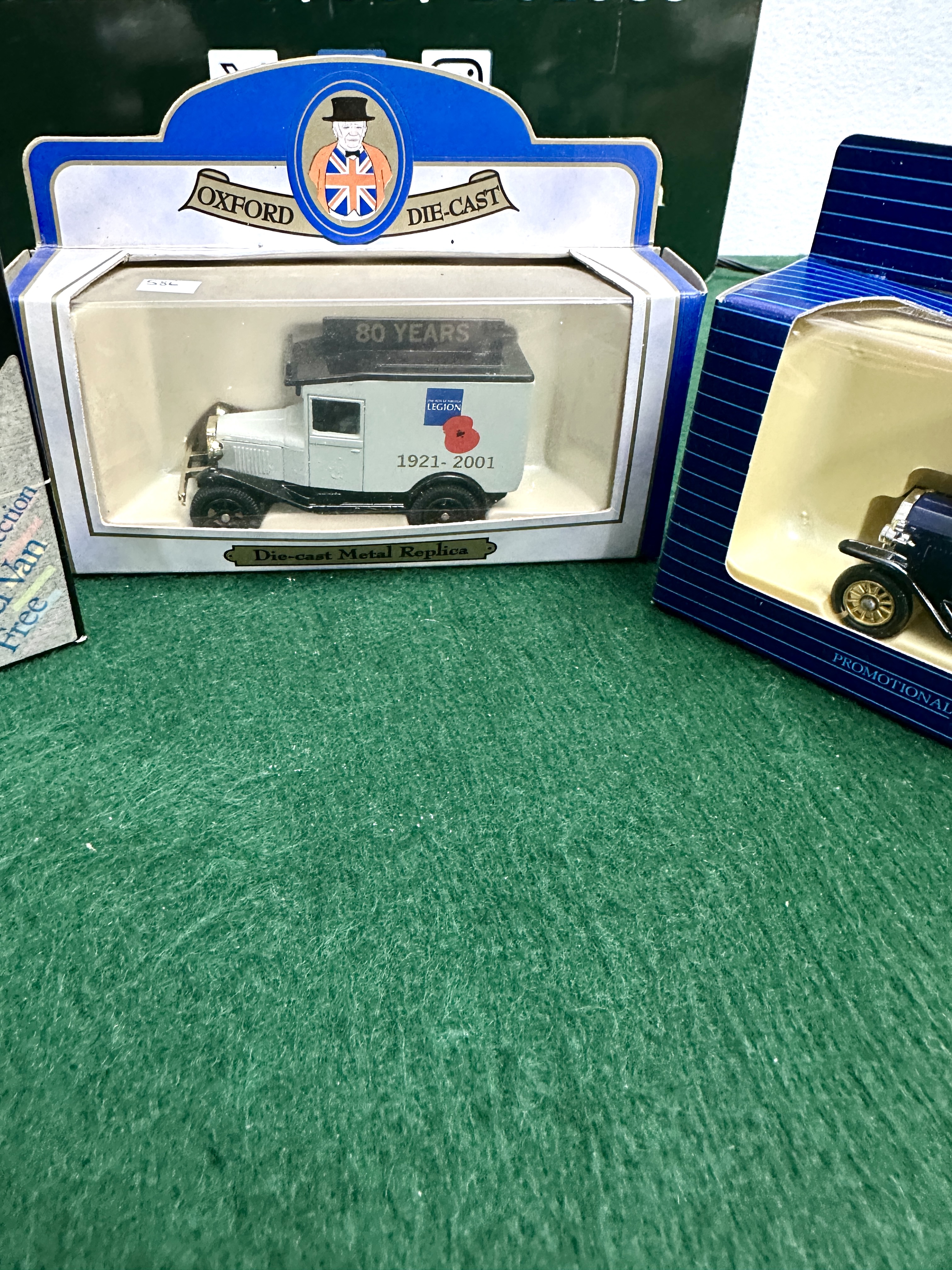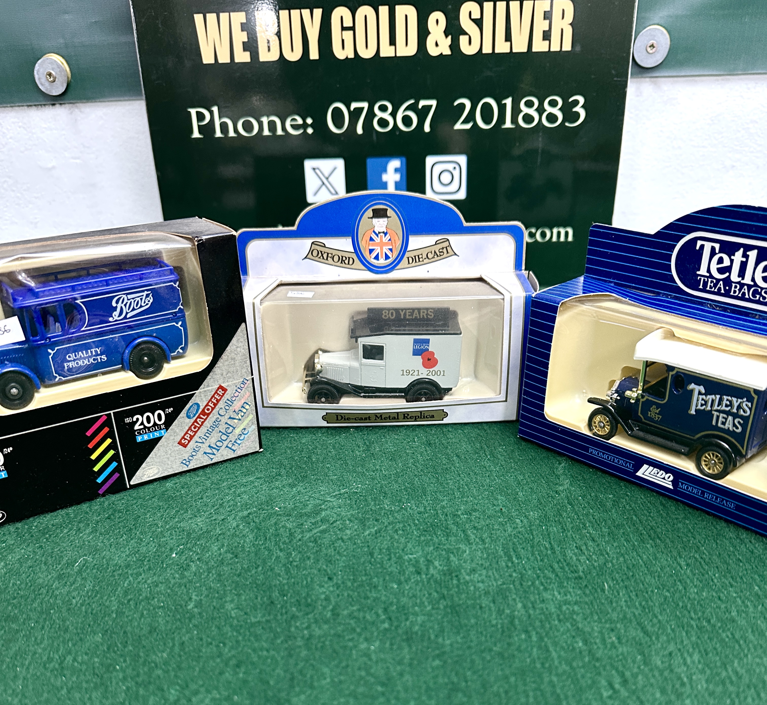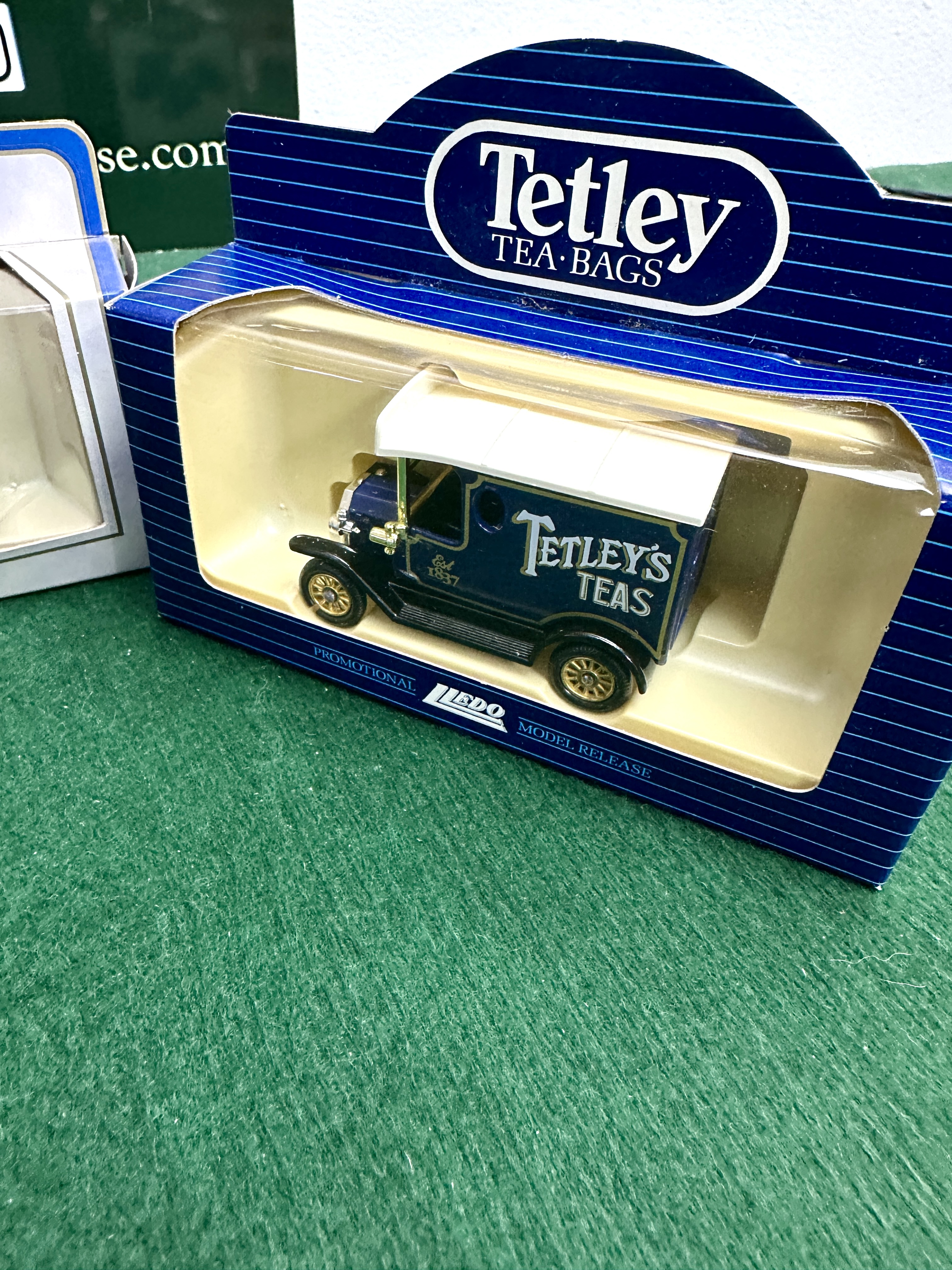 A collection of three die-cast metal promotional delivery vans, each housed in its original manufacturer window display box. The first model is a Lledo promotional release for Tetley’s Teas, finished in dark blue livery with gold and white script and a white plastic roof section. The second is an Oxford Die-Cast commemorative vehicle for the Royal British Legion 80th anniversary (1921-2001), presented in a white and grey colour scheme with a poppy motif. The third model is part of the Boots Vintage Collection, finished in bright blue with the Boots script logo and Quality Products text. This item was originally a special offer associated with Boots colour print film processing. All models are constructed from die-cast metal with plastic detailing and representative period branding.