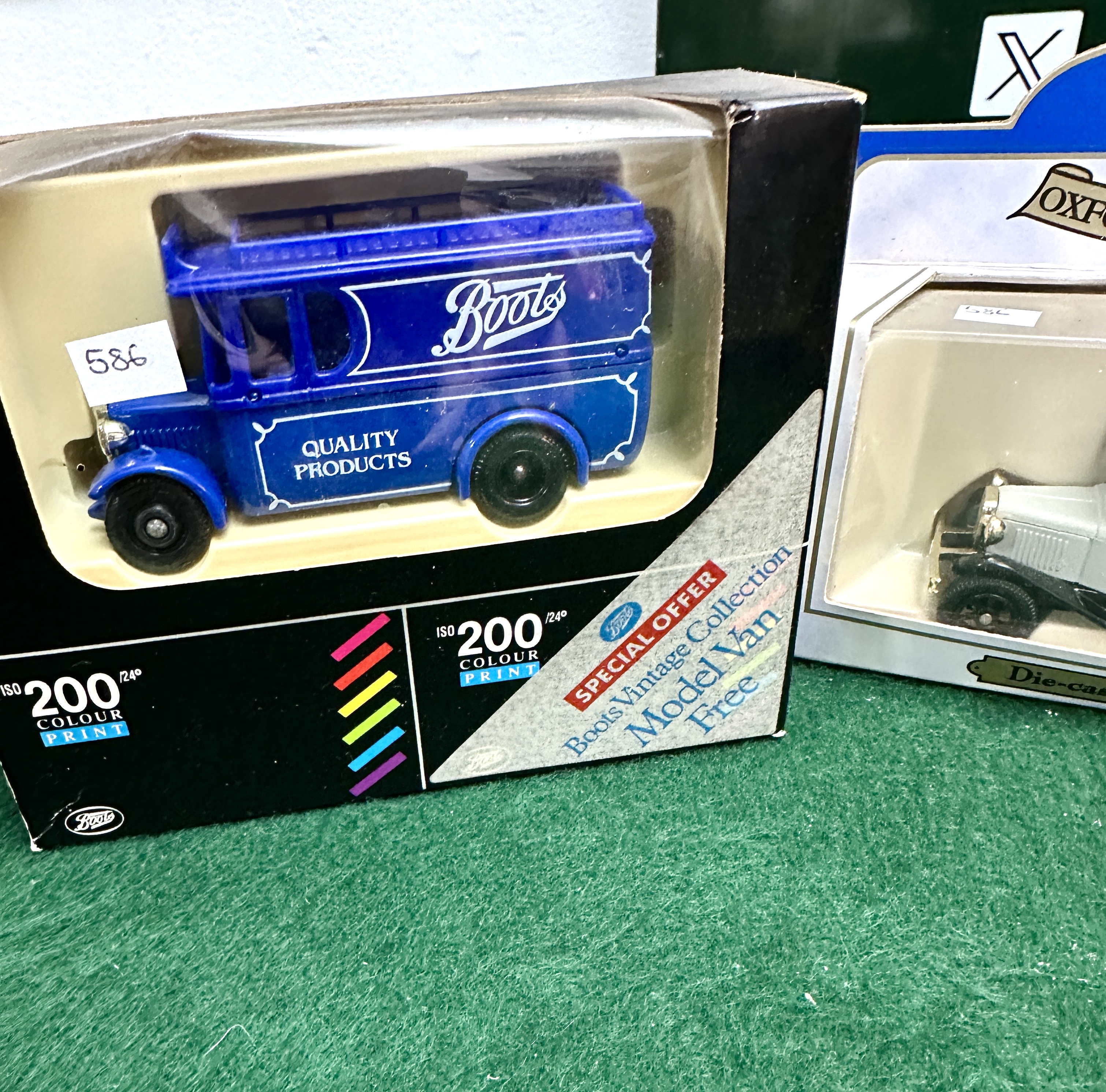 The models appear to be in good, original, and unused condition. The cardboard window boxes show light signs of shelf wear, including minor creasing and surface scuffs to the plastic windows. A small adhesive lot label is affixed to the front of the Boots packaging.