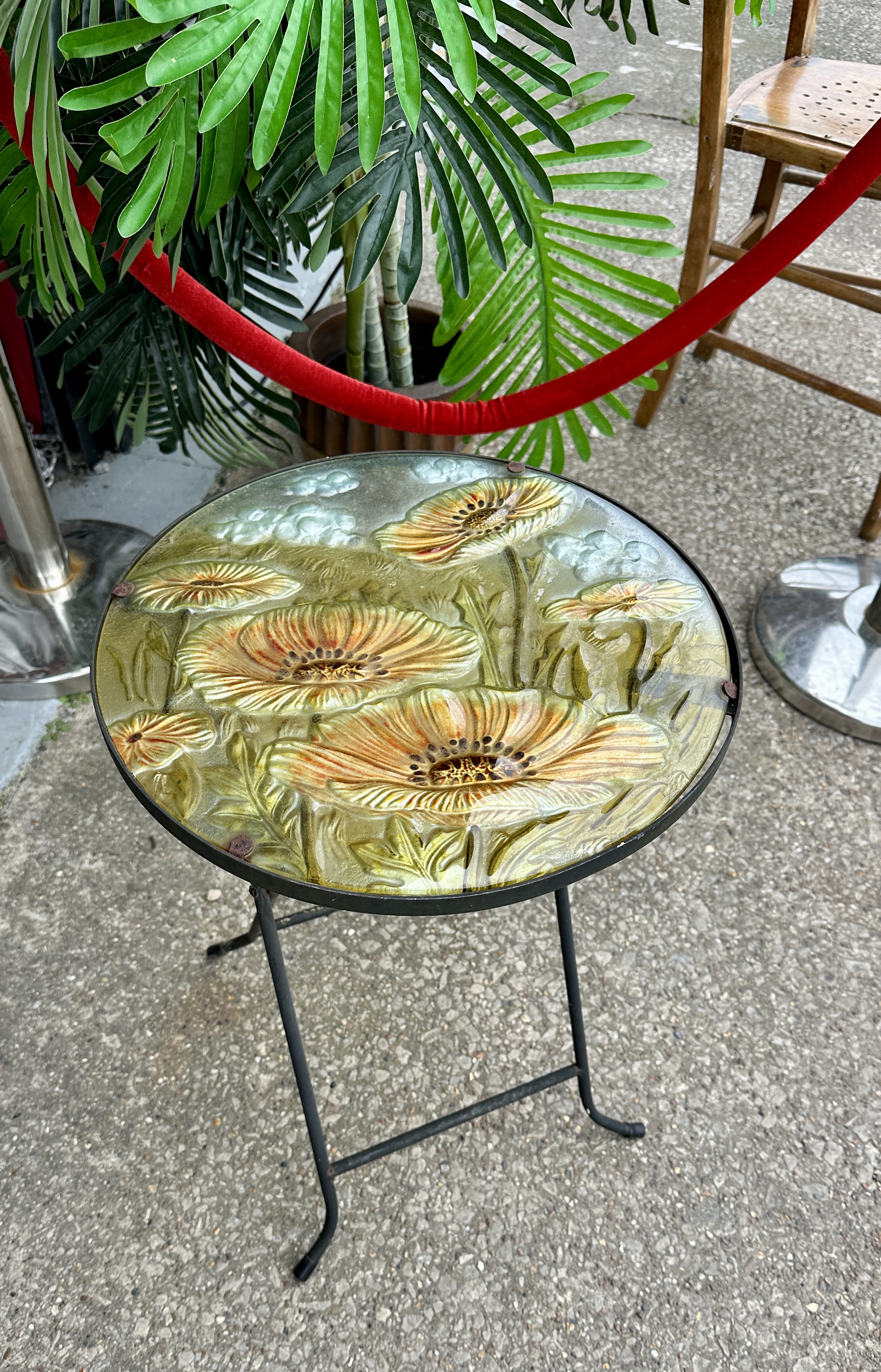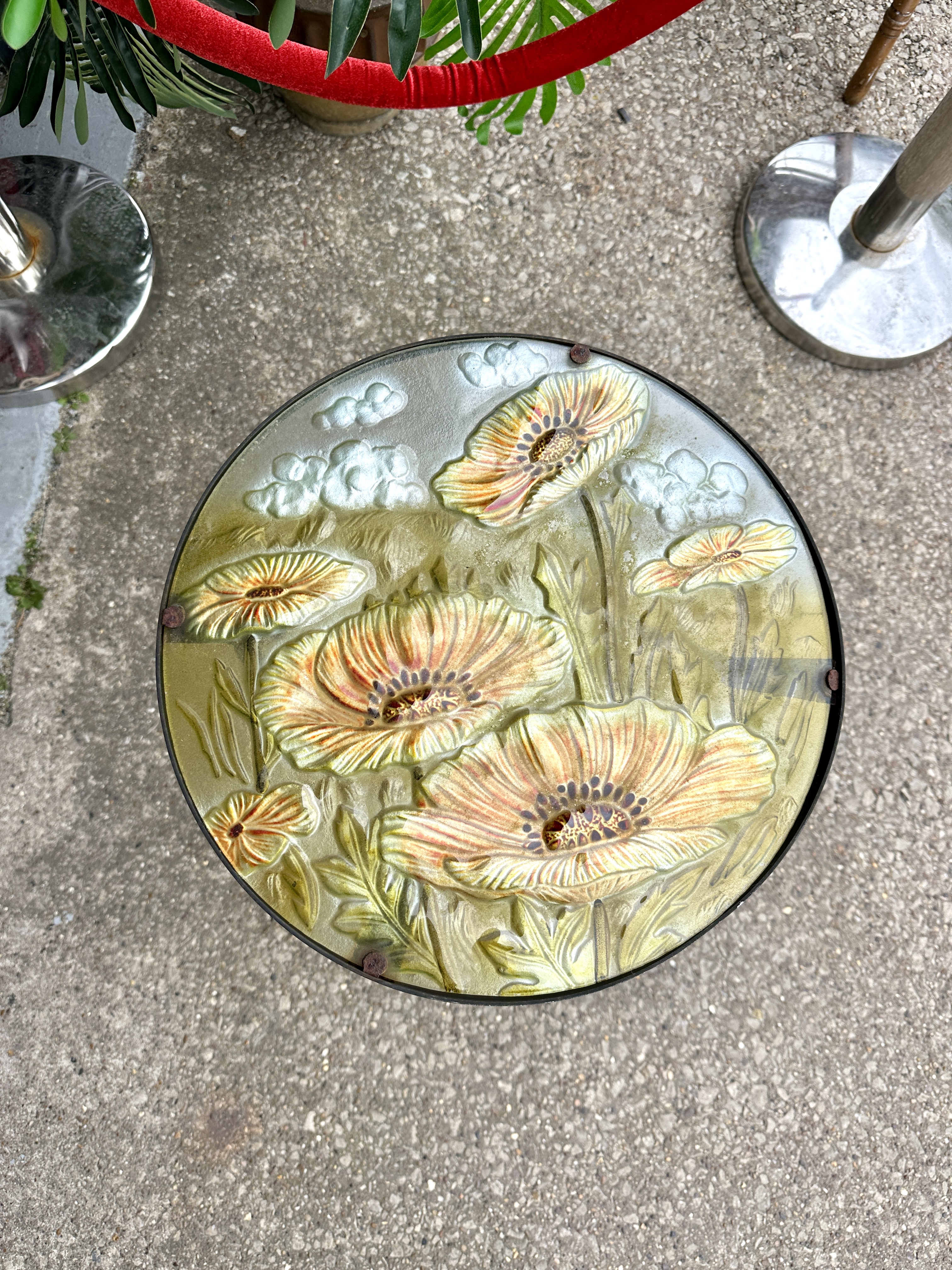 A circular garden side table featuring a moulded glass top and a black-painted metal frame. The top consists of a thick cast glass disc with a textured bas-relief design depicting a field of poppies beneath a clouded sky. The floral decoration is finished in a palette of orange, yellow, and green against a pale blue and translucent background. The glass top is secured to the base by four metal retaining clips. The supporting frame is constructed from slender black-painted metal, likely steel or iron, featuring four legs joined by a cross-stretcher and terminating in small out-turned feet.