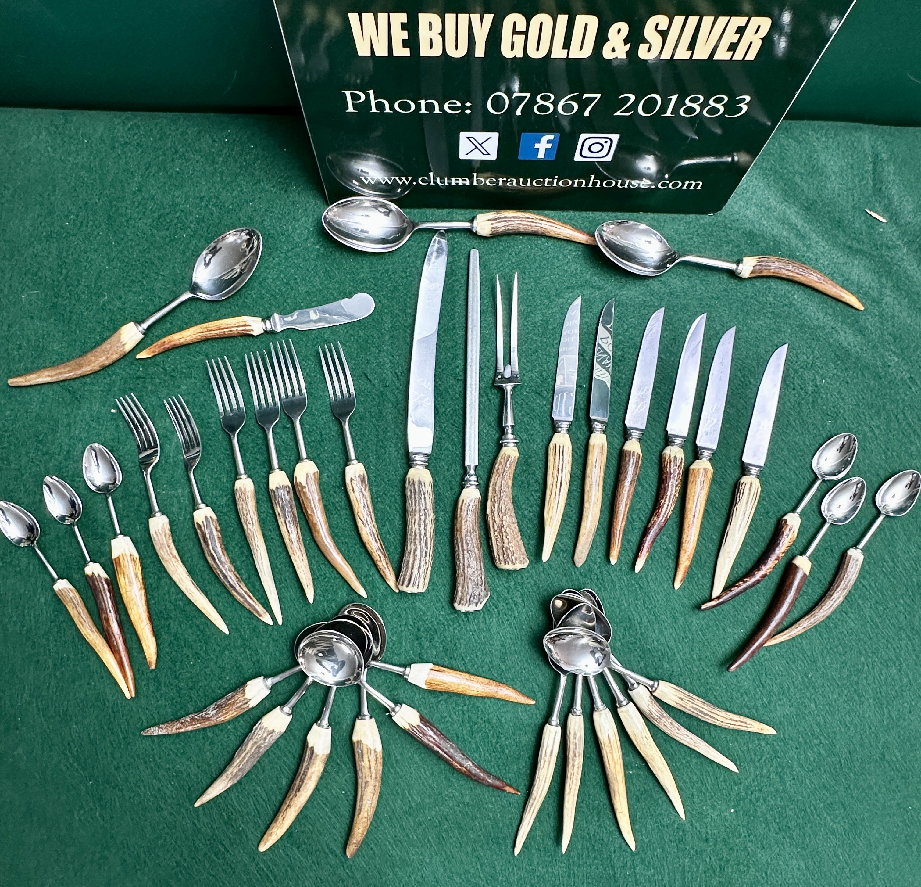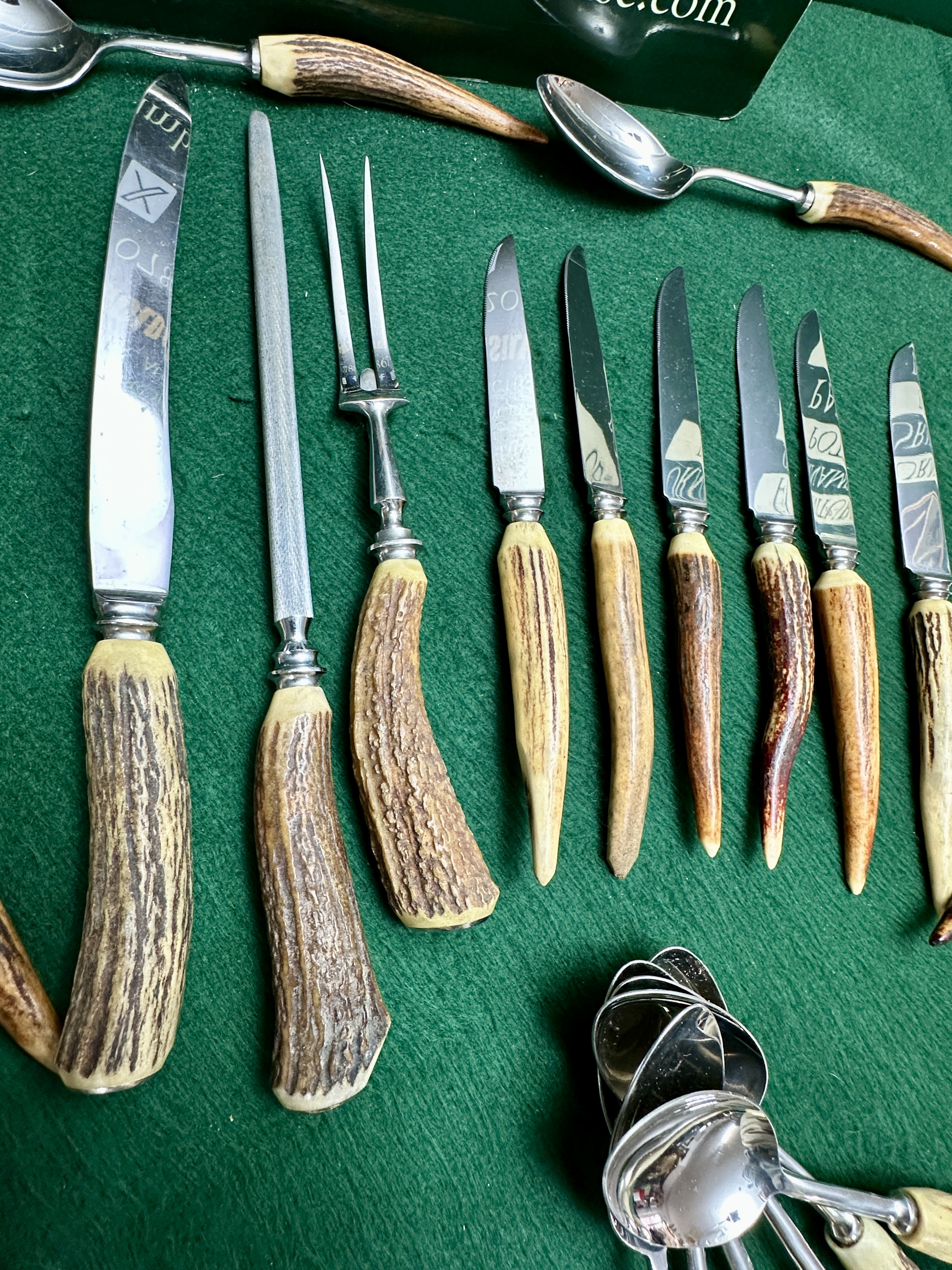 A collection of stag horn handled flatware and serving pieces by Anton Wingen Jr of Solingen, Germany. The set features handles crafted from natural deer antler in varying tones and textures, fitted with polished stainless steel blades, tines, and bowls. The assembly includes table knives, steak knives, table forks, dessert spoons, and smaller spoons. Included is a three-piece carving set comprising a large carving knife, a two-pronged meat fork with a safety guard, and a sharpening steel. The blades are marked Stainless. The construction incorporates polished metal bolsters.