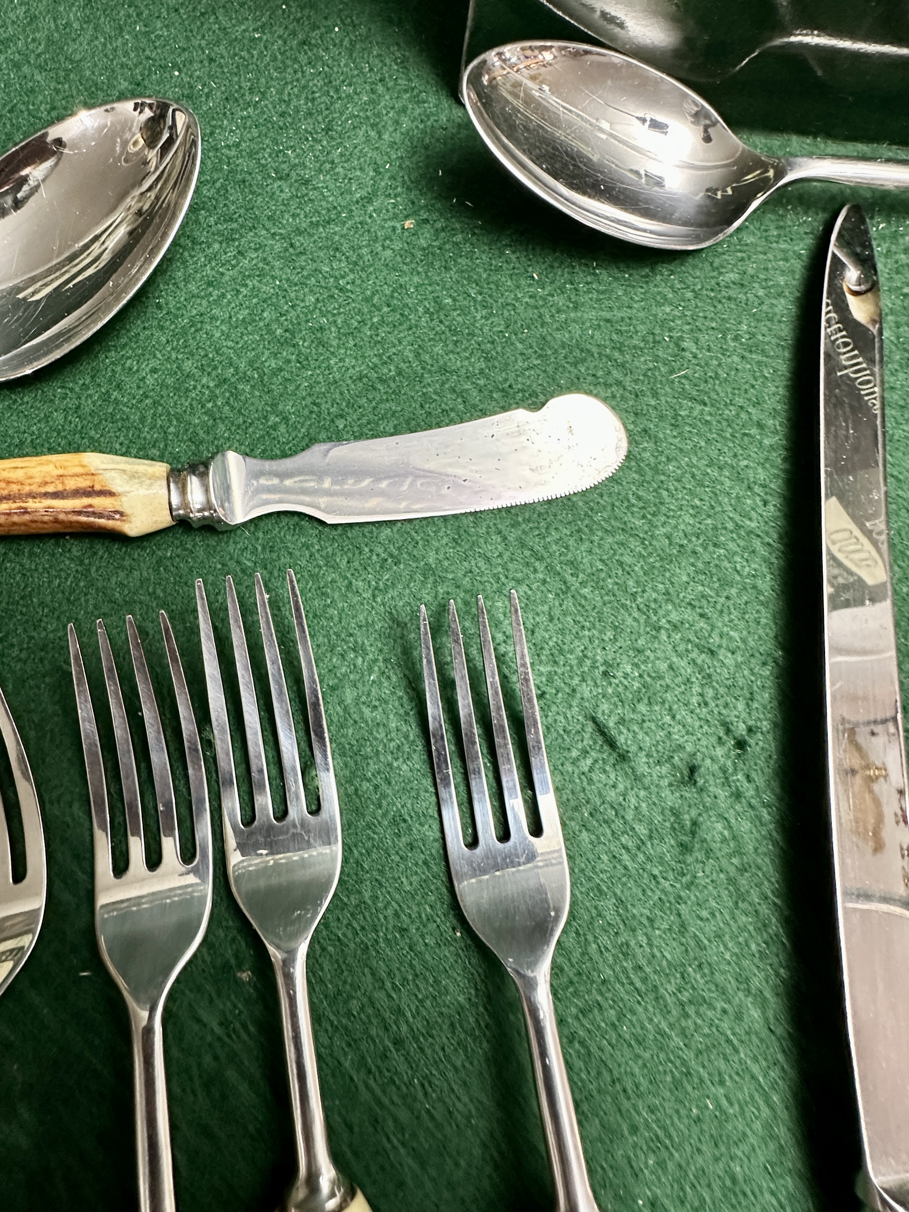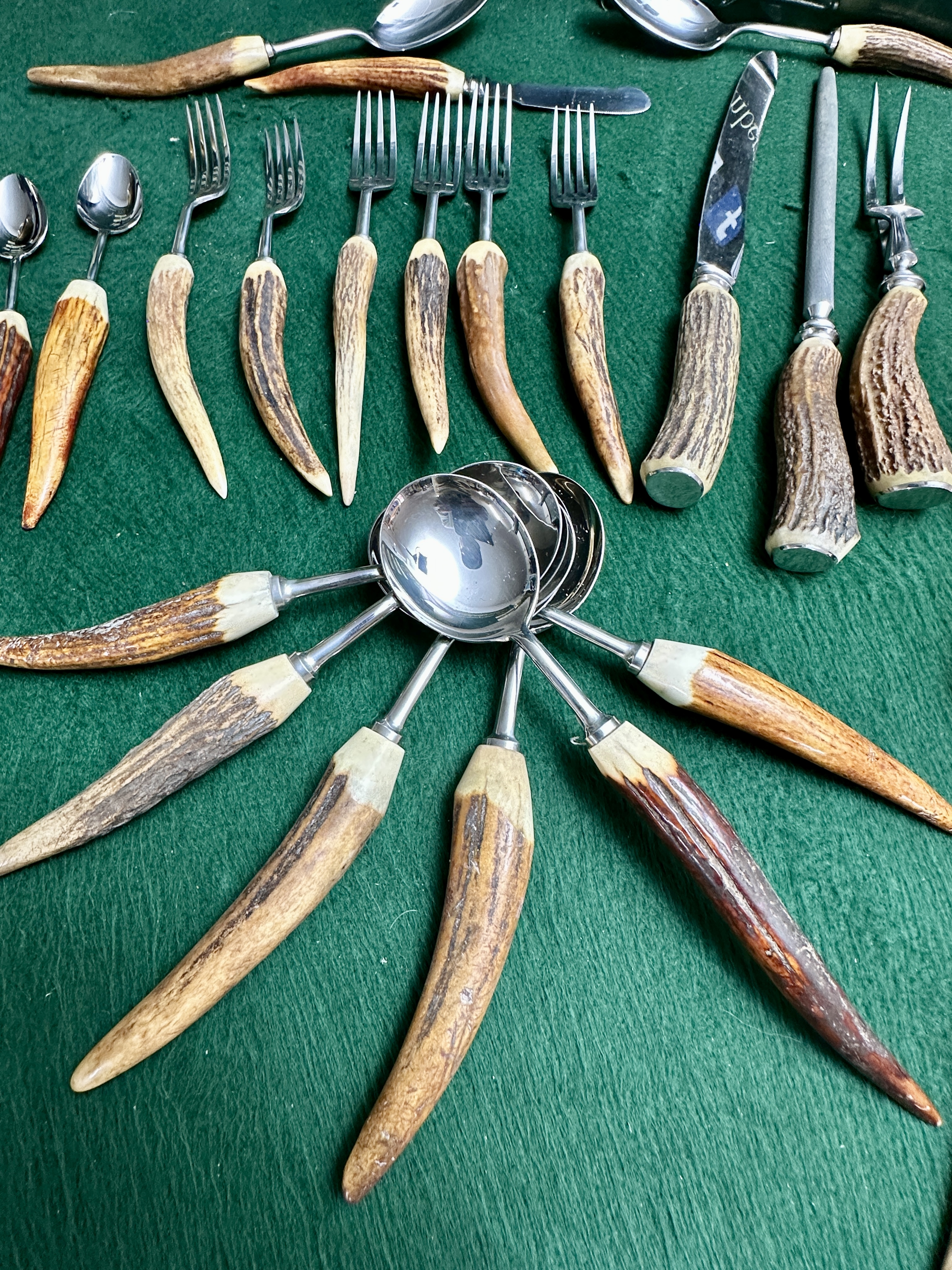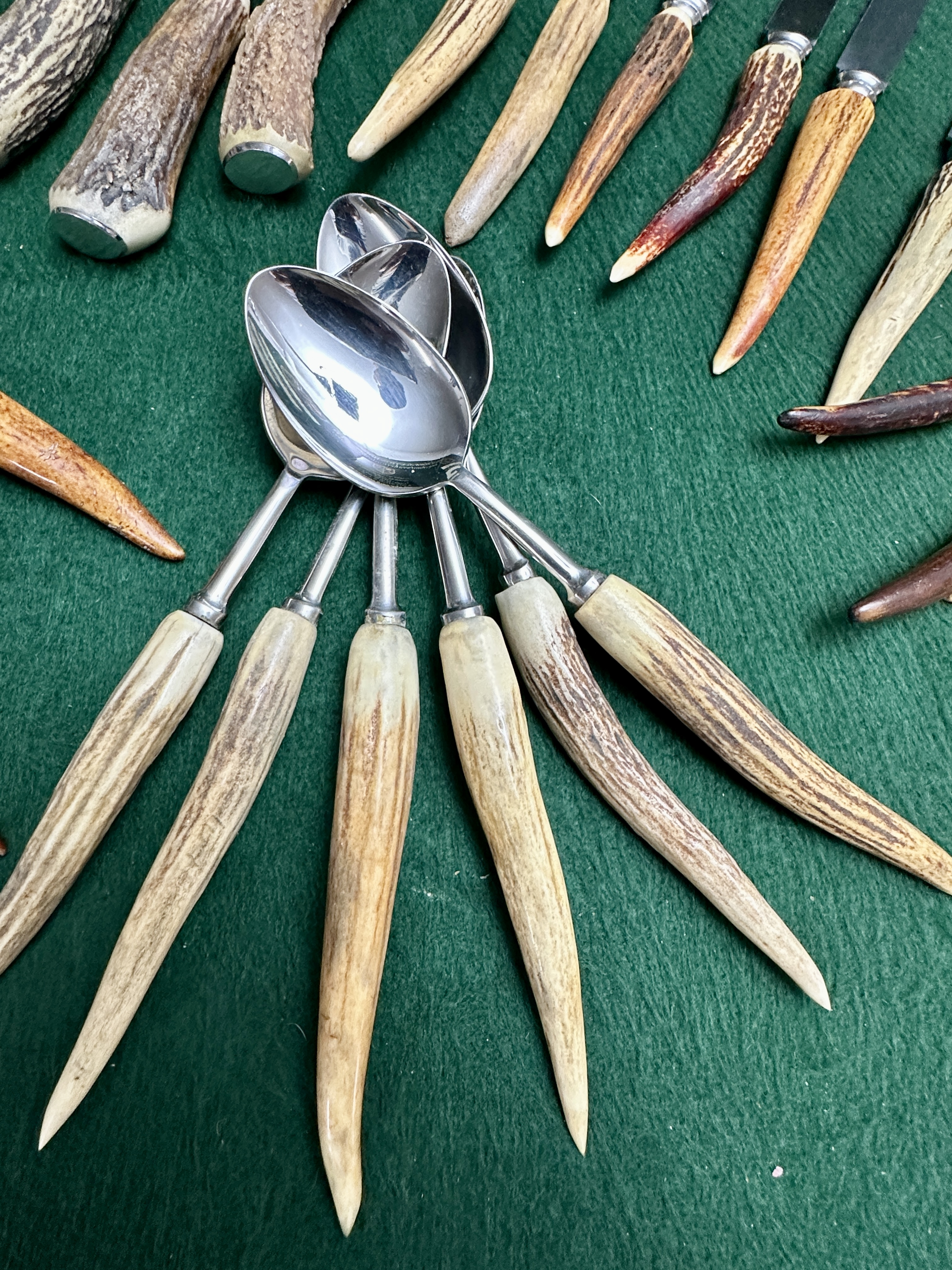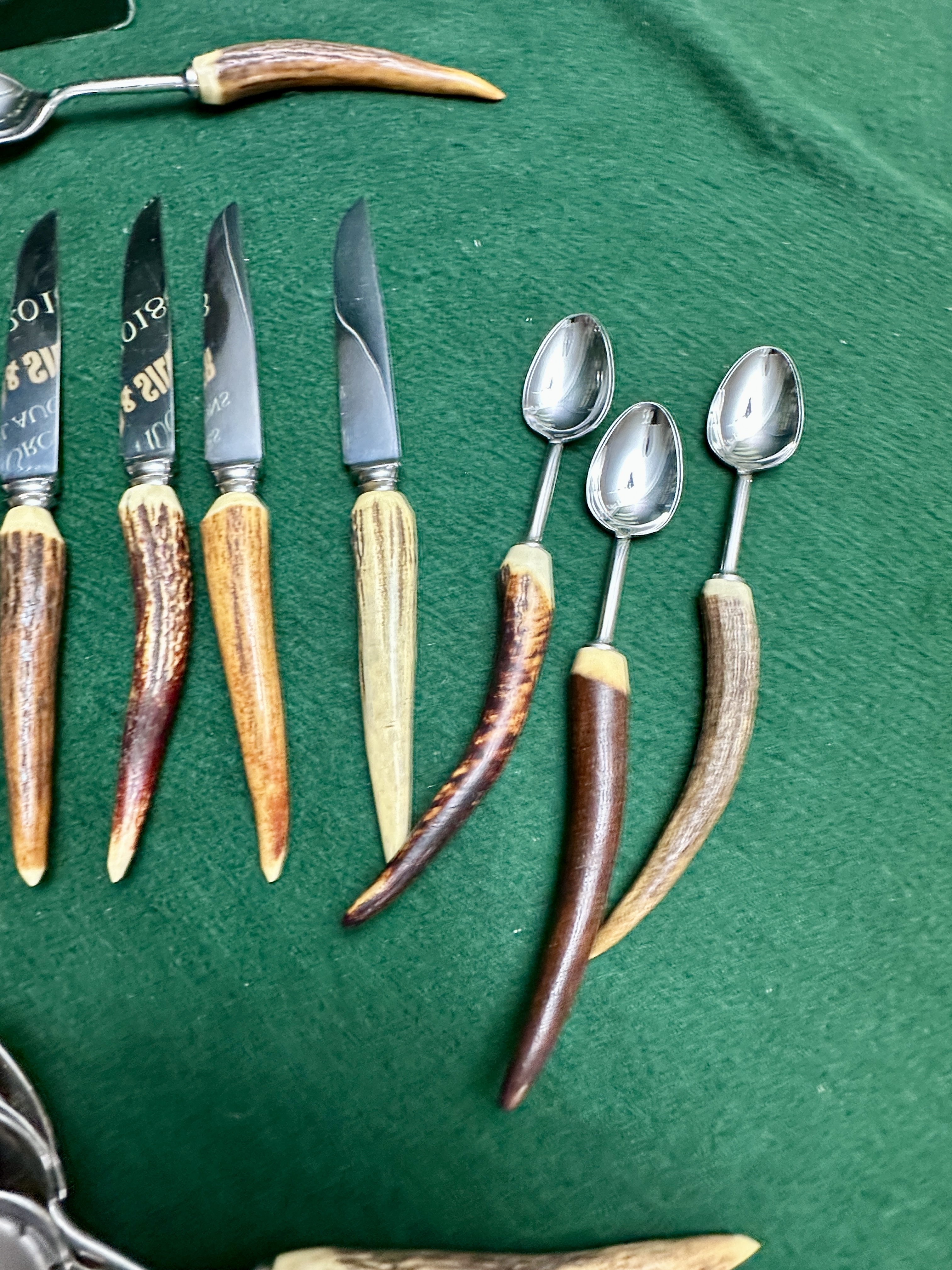 The collection is in good used condition overall. The stainless steel components show minor surface scratching and light signs of wear consistent with use. The natural horn handles exhibit expected variations in colour, texture, and shape.
