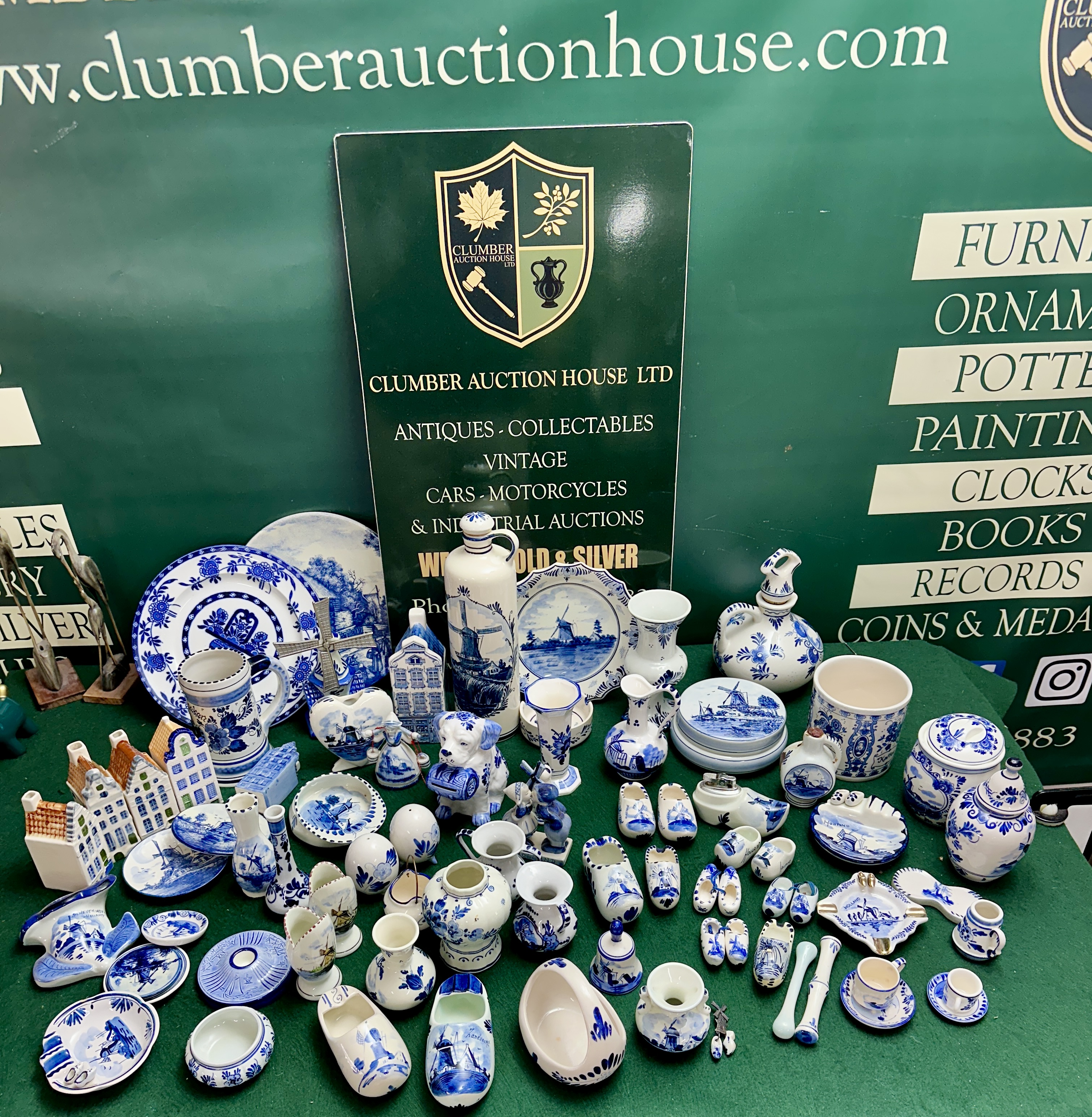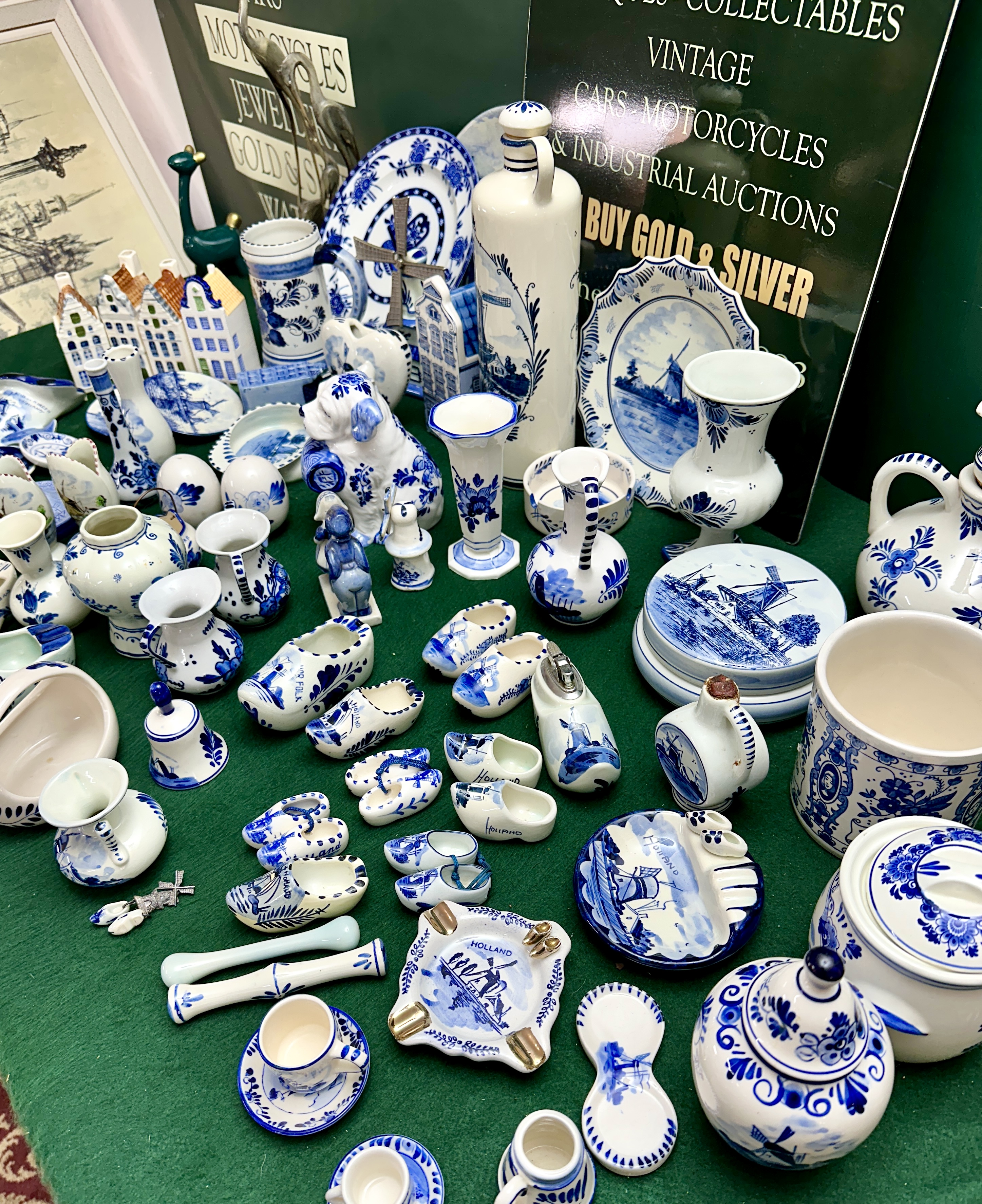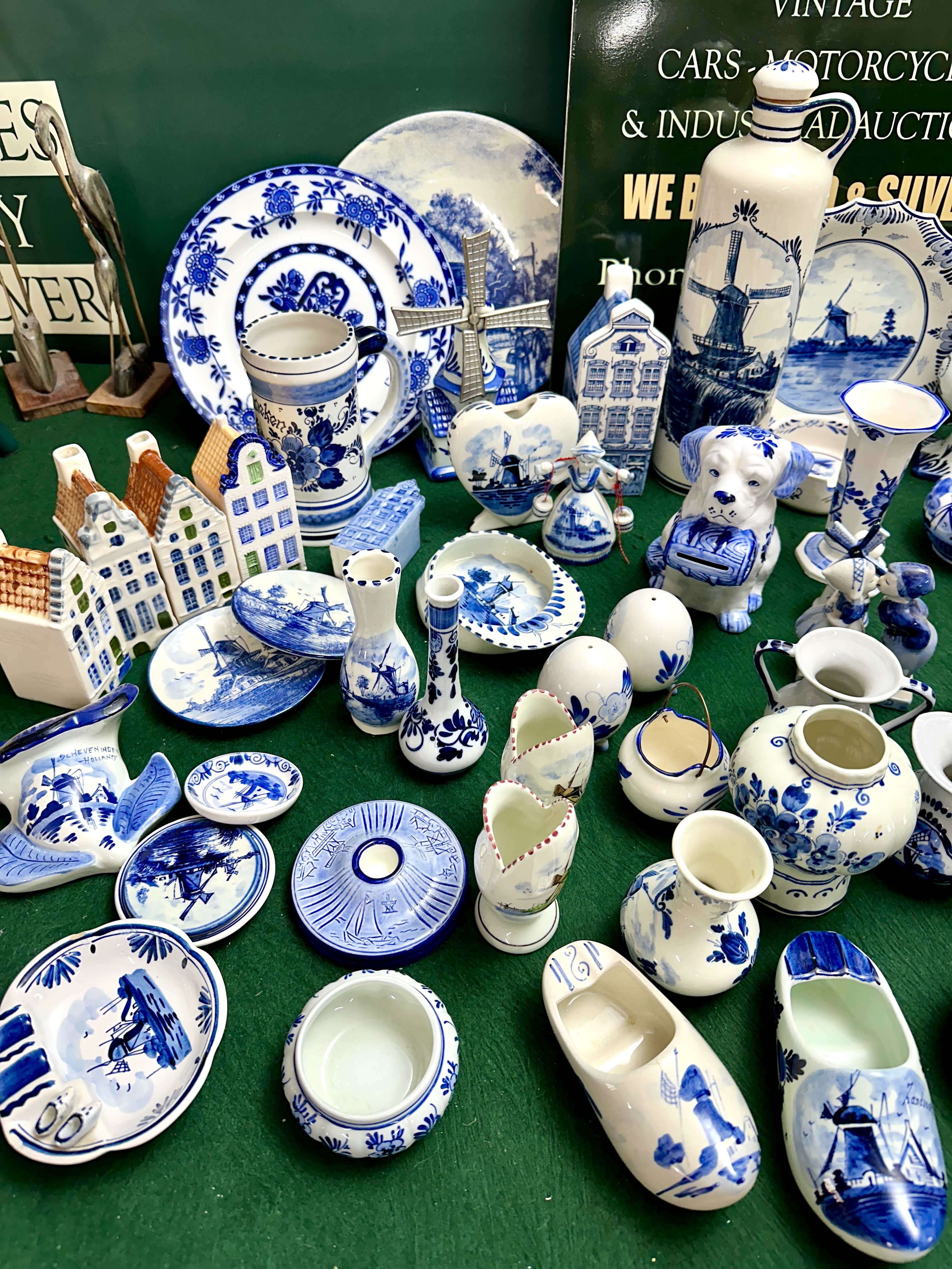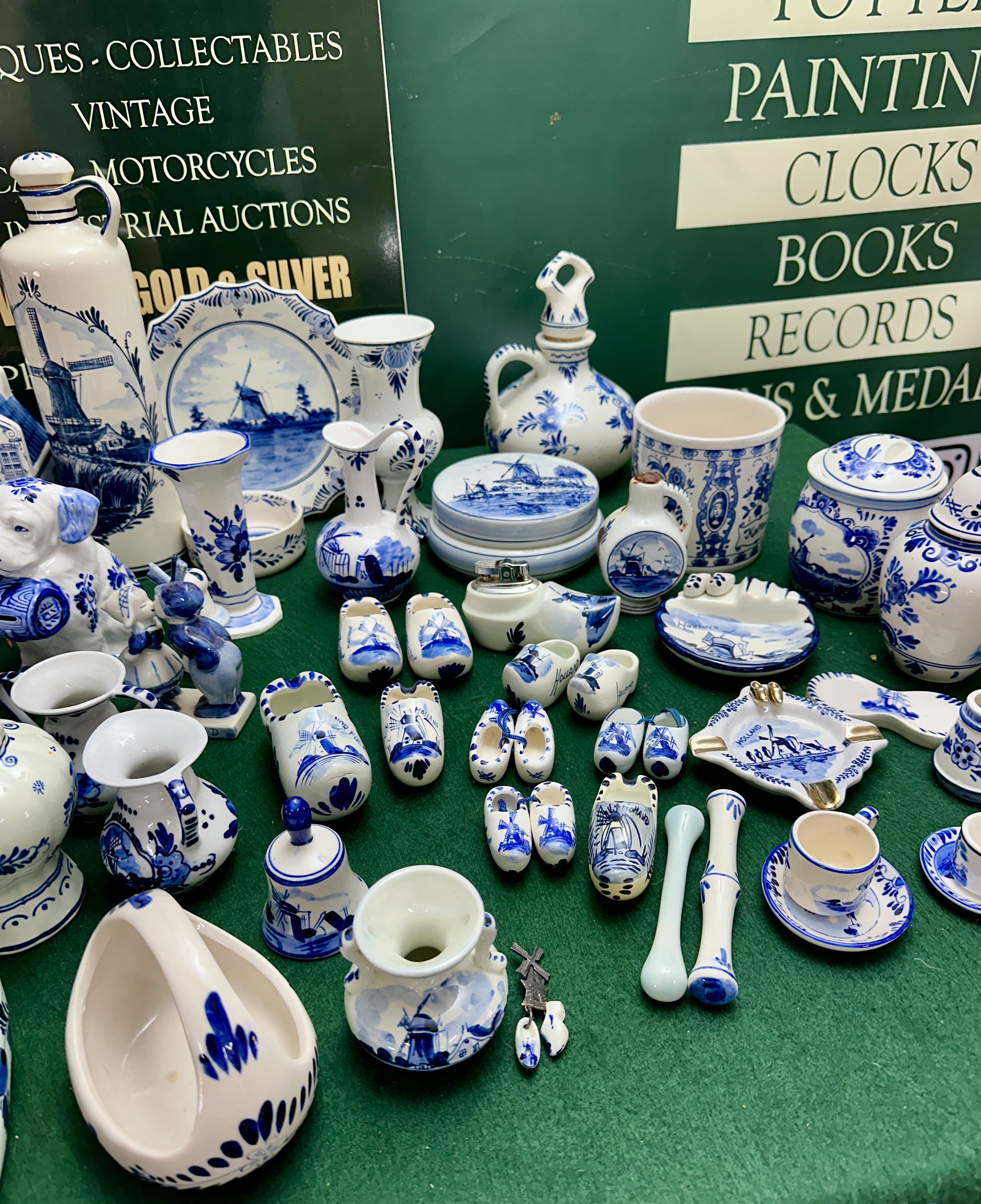 An extensive collection of blue and white glazed ceramics, primarily earthenware, decorated in the traditional Delft style with cobalt blue designs on a white ground. The group comprises a wide variety of decorative and miniature forms, including multiple pairs and single miniature souvenir-style clogs; several miniature Dutch canal houses; a figural money box in the form of a seated dog; figurines depicting children in traditional Dutch attire; and miniature windmills, one featuring metal sails. Tableware and vessels include a large tankard with floral decoration; a tall decanter with a stopper depicting a windmill; various vases including bud, flared-rim, and baluster shapes; lidded ginger jars and storage pots; a set of graduated round lidded boxes; several ashtrays; egg-shaped salt and pepper shakers; and a small cream jug. The collection also features decorative bells, a basket-shaped dish, and wall-hanging plaques. Decoration is achieved through both hand-painted and transfer-printed techniques, featuring traditional Dutch landscapes with windmills, sailing vessels, canal buildings, and floral motifs. Notable markings include a dish base marked Delfts Handwerk and a shaped plaque marked Delfts Handpainted with a crown over S mark, associated with Schoonhoven.