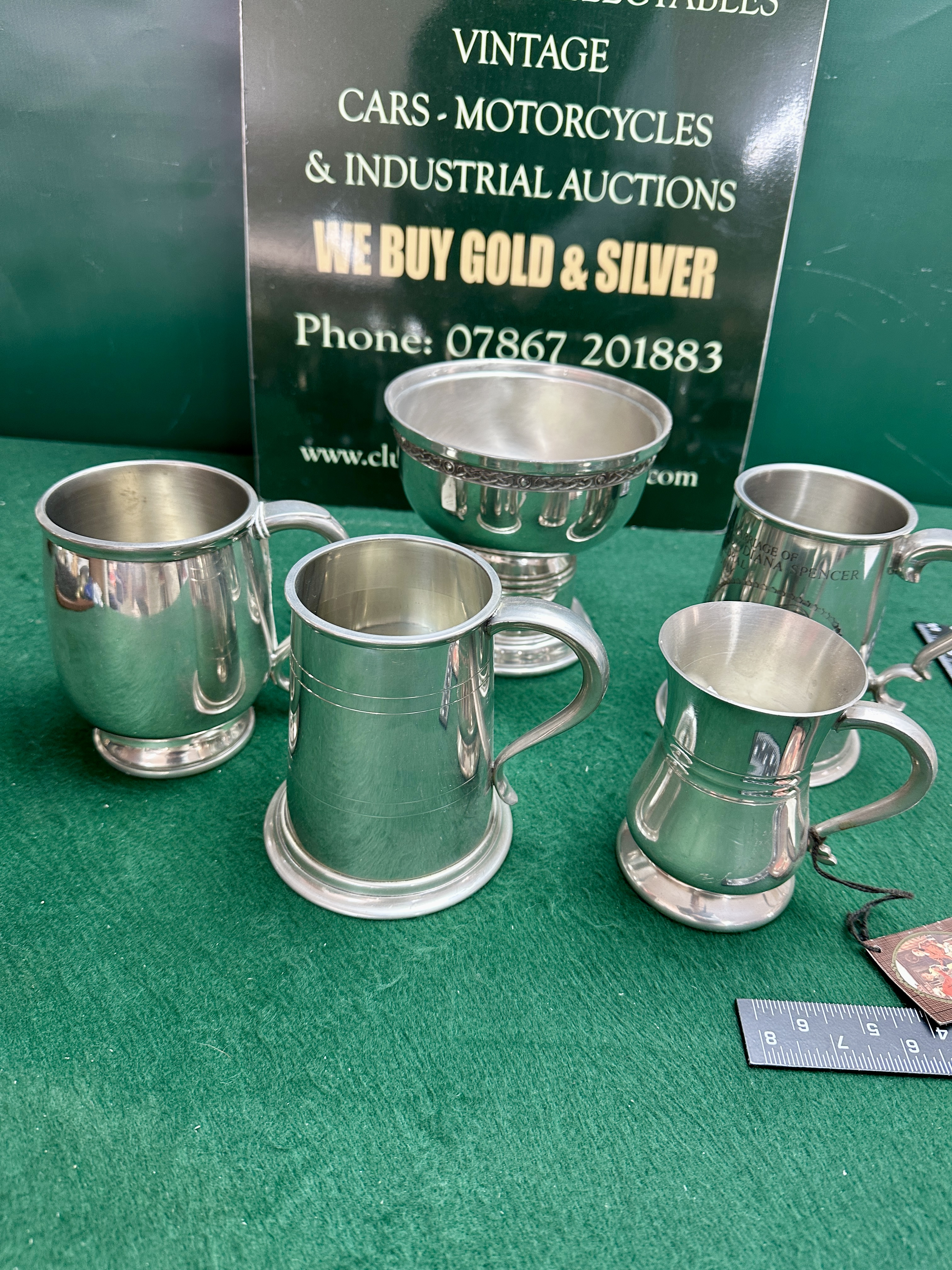 A collection of pewter metalware items comprising four tankards and a footed bowl. The group includes a cylindrical tankard featuring two horizontal incised lines to the upper body, a design associated with the English Pewter Company. Also present are two bulbous-bodied tankards of varying sizes and a cylindrical commemorative tankard. The commemorative piece is engraved with the inscription MARRIAGE OF DIANA SPENCER, produced to mark the 1981 royal wedding. The footed bowl features a decorative relief band depicting a Celtic knot-work motif and is supported by a multi-tiered spreading foot. All items are constructed from pewter, displaying a characteristic matte grey lustre. No British silver hallmarks are present on the exterior surfaces.