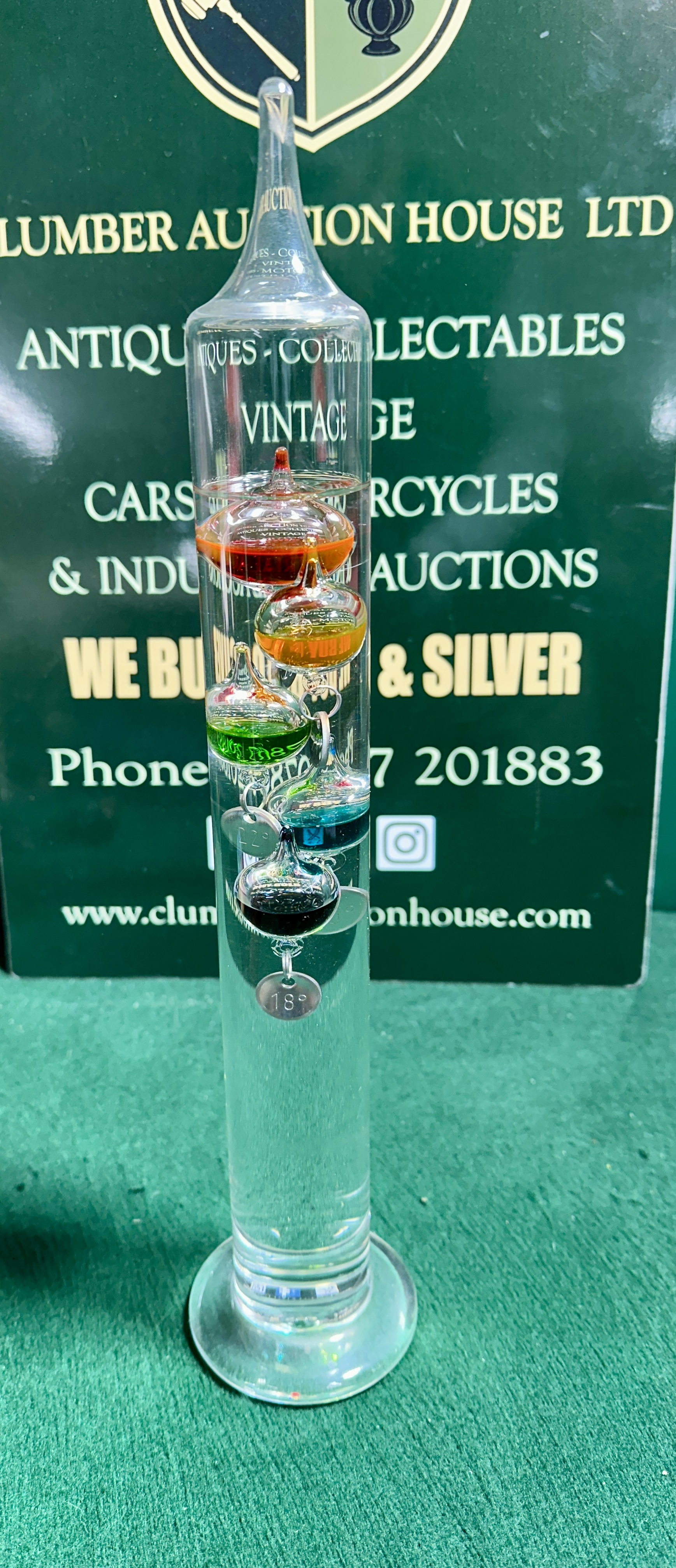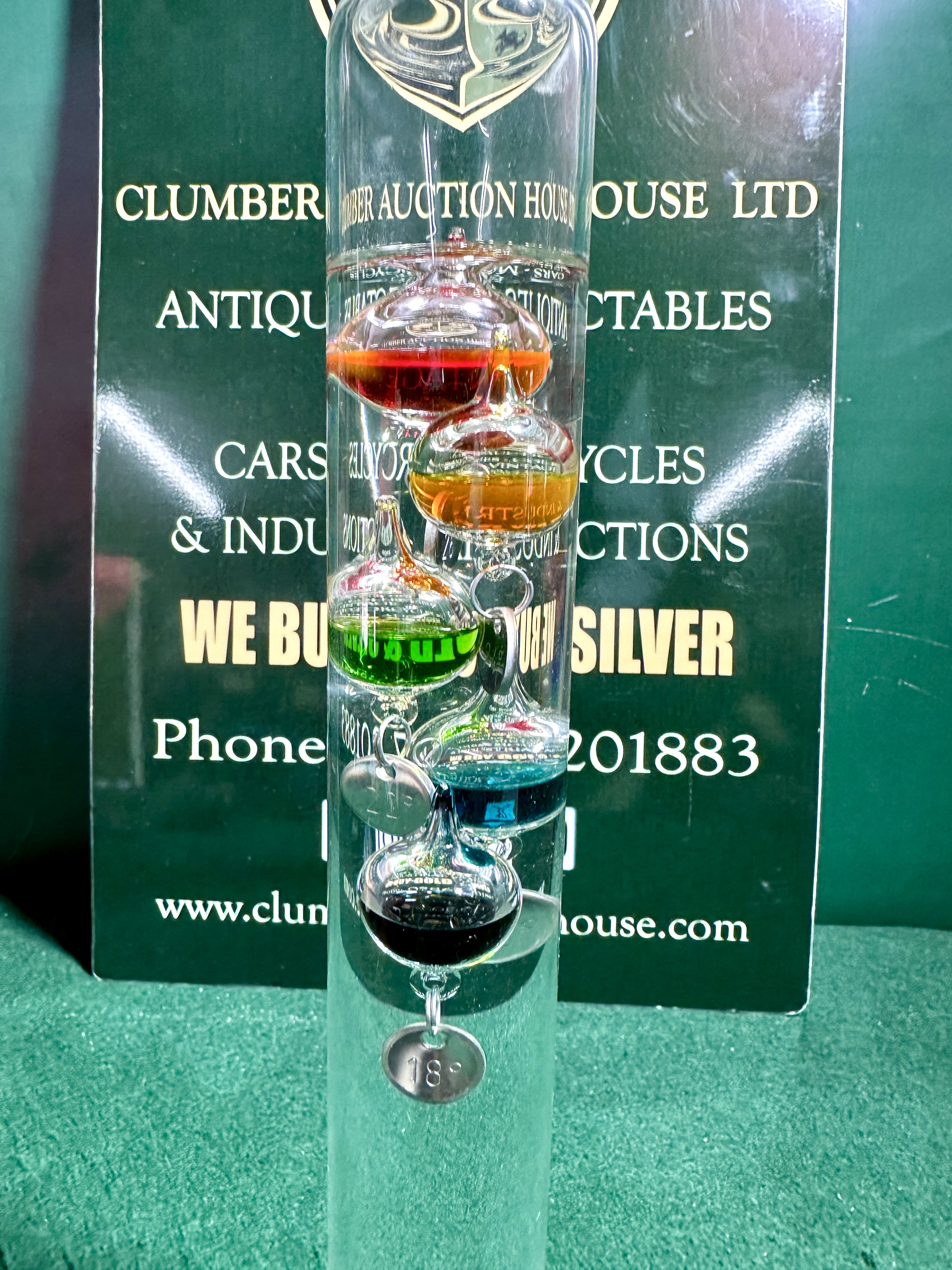 The thermometer is in good condition. The glass appears free from chips, cracks, or surface scratches. The internal liquid remains clear and the weighted bulbs are suspended at varying heights, suggesting functional operation.