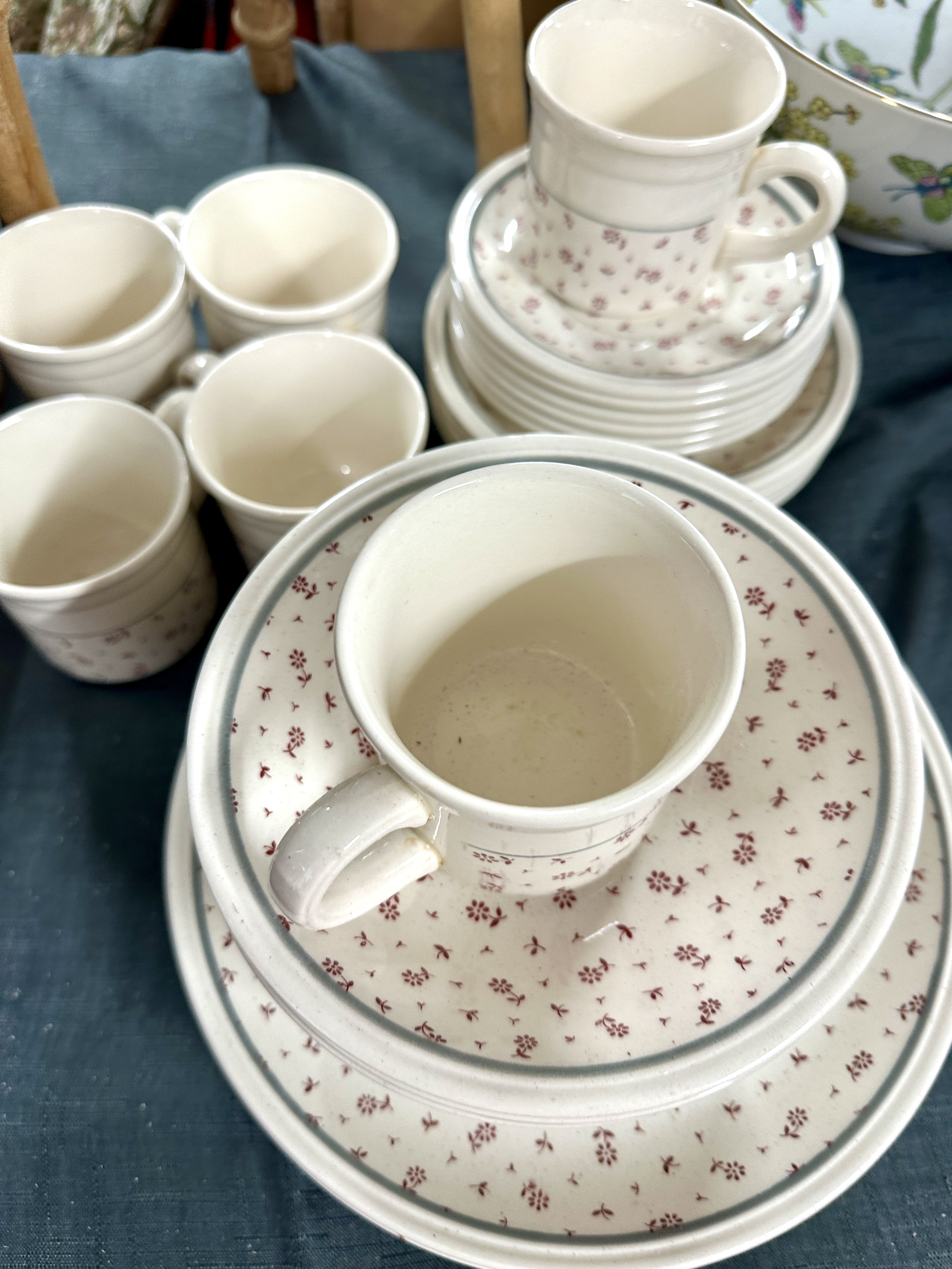 The set is in fair to good vintage condition with signs of age-appropriate use. There is light shelf wear and some discoloration to the unglazed foot rings. Faint staining is visible to the interior of at least one mug. A small mark or minor chip is noted on the rim of one large plate. No significant cracks or professional repairs are evident.
