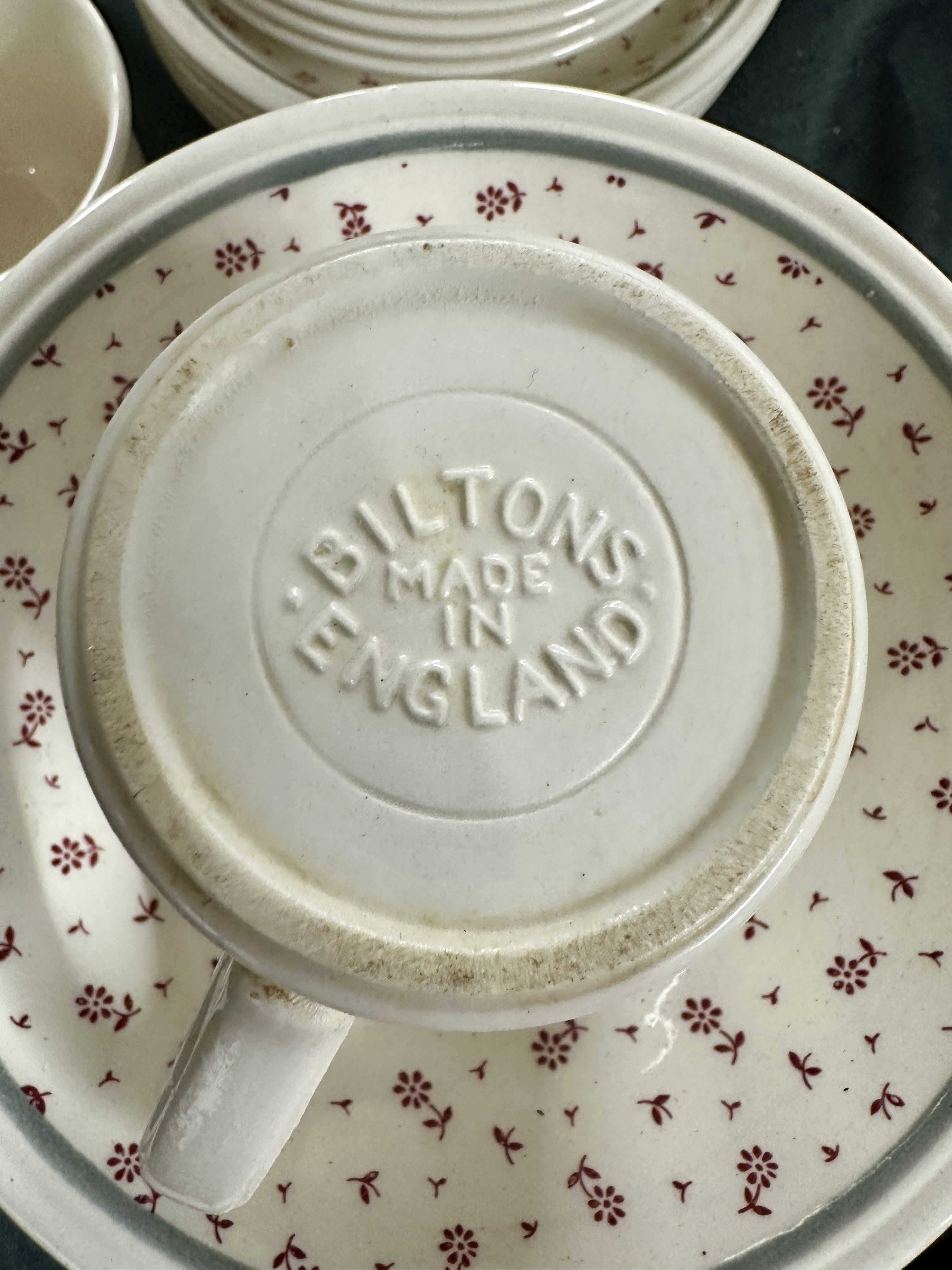 This assortment of British earthenware is manufactured by Biltons, a pottery based in Staffordshire, England. The pieces feature a transfer-printed country-style decoration consisting of small, stylized maroon floral sprigs scattered across a cream ground. Each item is finished with a single thin, blue-grey band near the rim. The collection includes dinner plates, side or dessert plates, bowls, and mugs. The underside of the pieces bears an embossed mark reading BILTONS MADE IN ENGLAND.