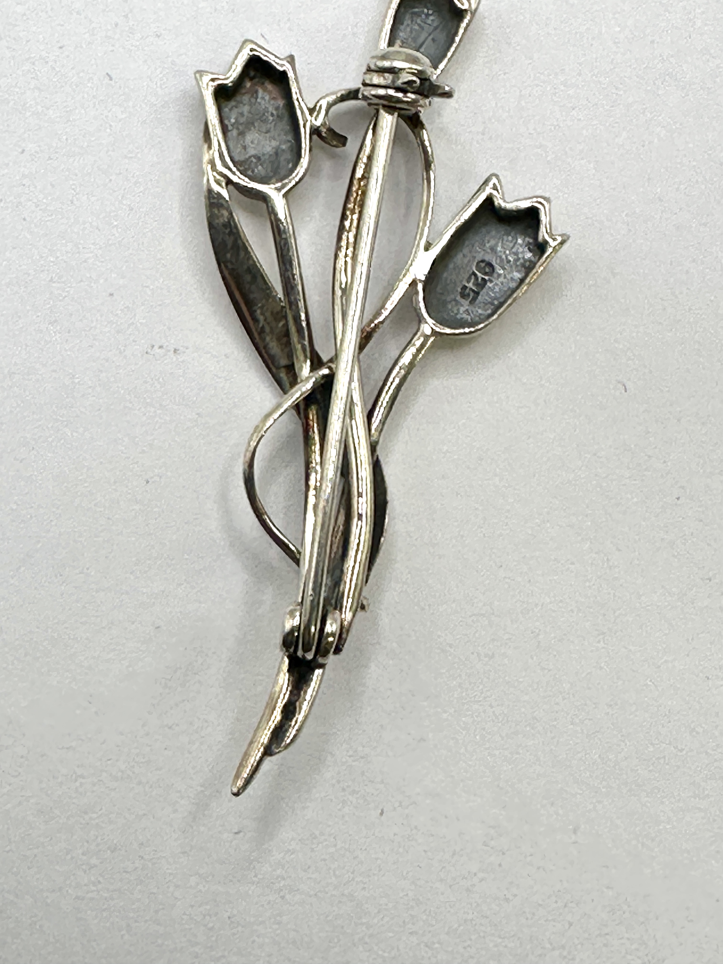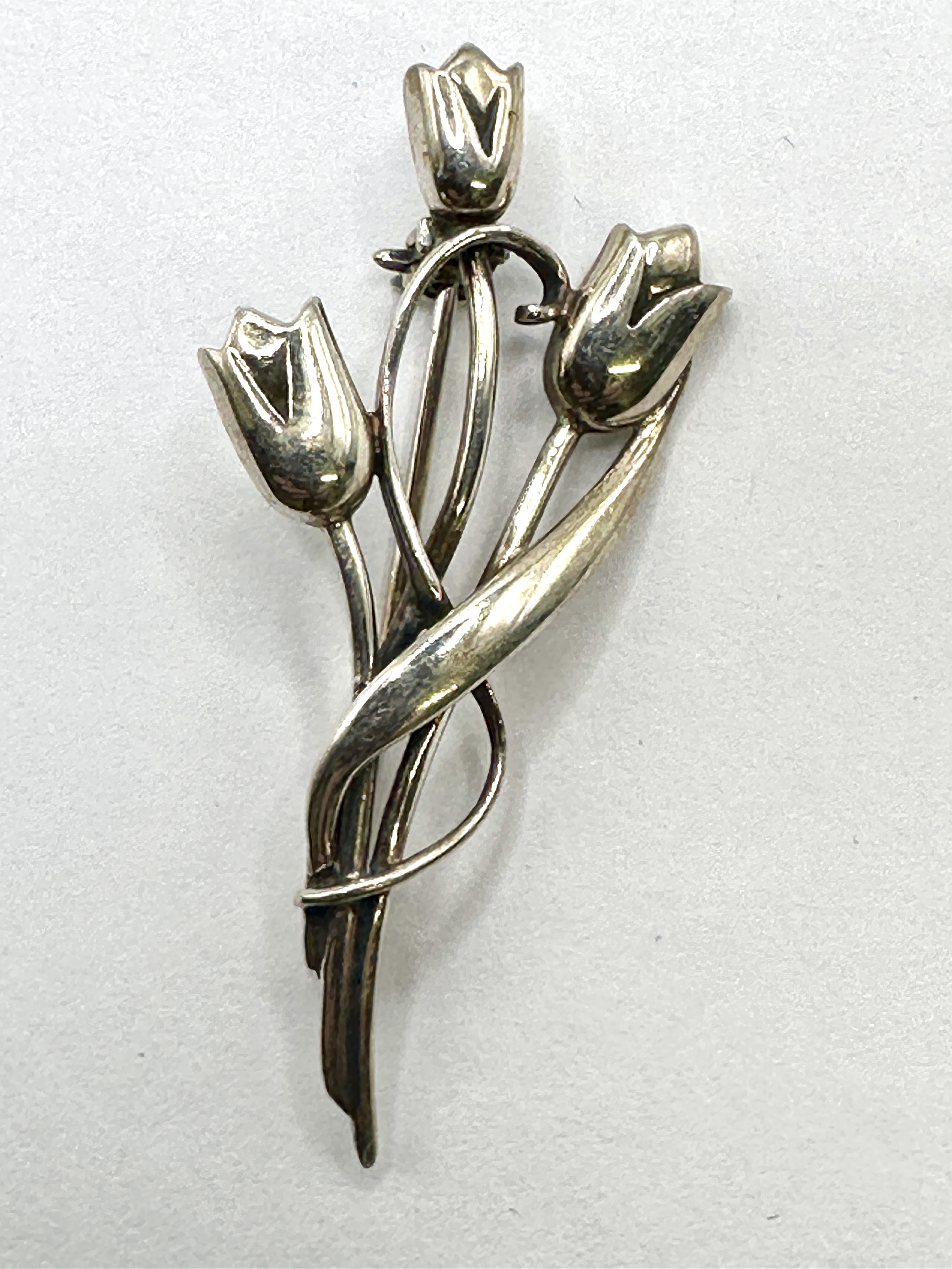 A 925 silver brooch designed in the stylised Rennie Mackintosh floral manner. The design depicts a bouquet comprising three tulip flower heads on slender stems, gathered and bound by a wide, scrolling ribbon band. The reverse of one flower head is stamped with the fineness mark 925. A secondary mark is present on the reverse of the uppermost flower head but is not clearly legible. The brooch is fitted with a hinged pin mechanism and a rollover safety clasp.