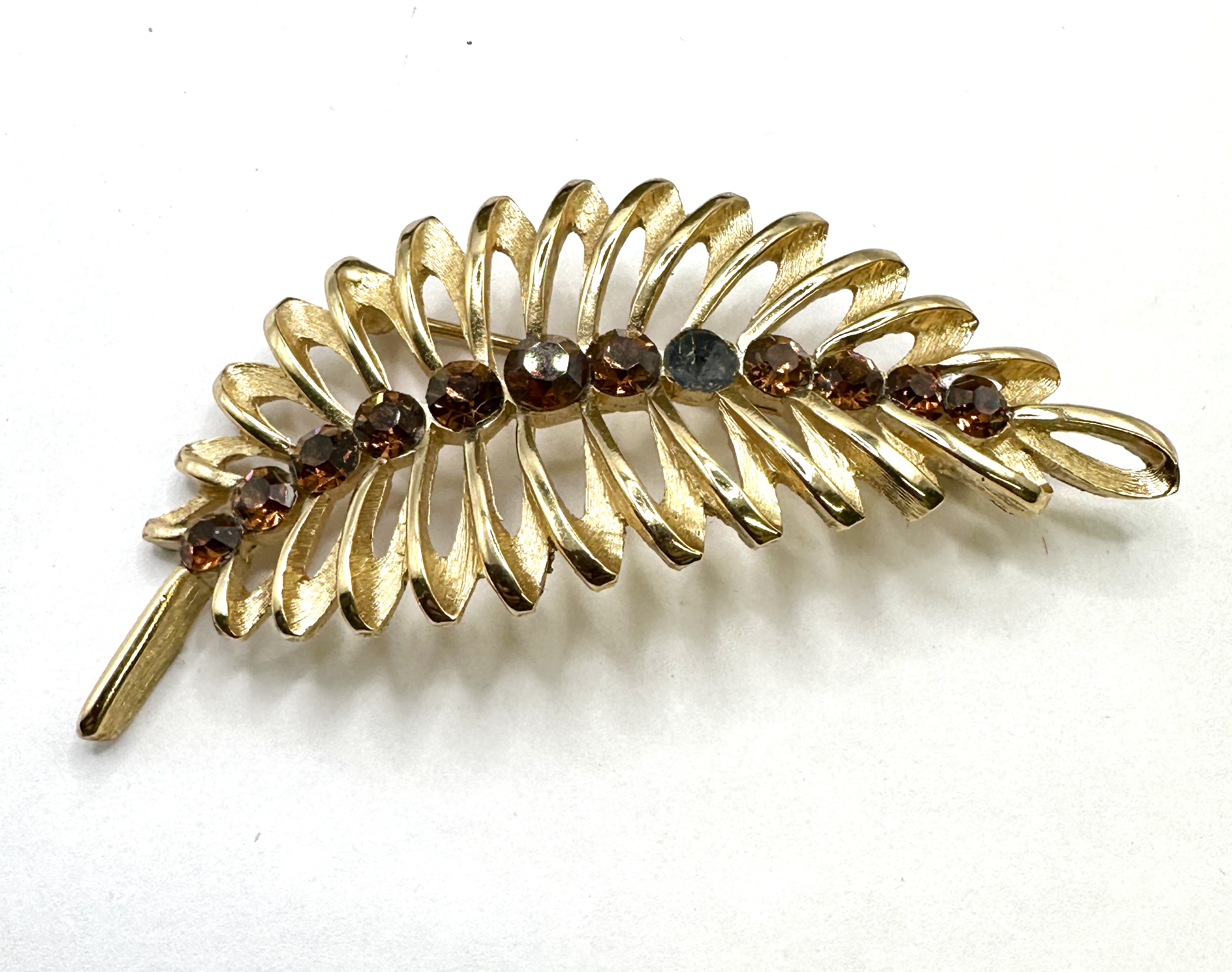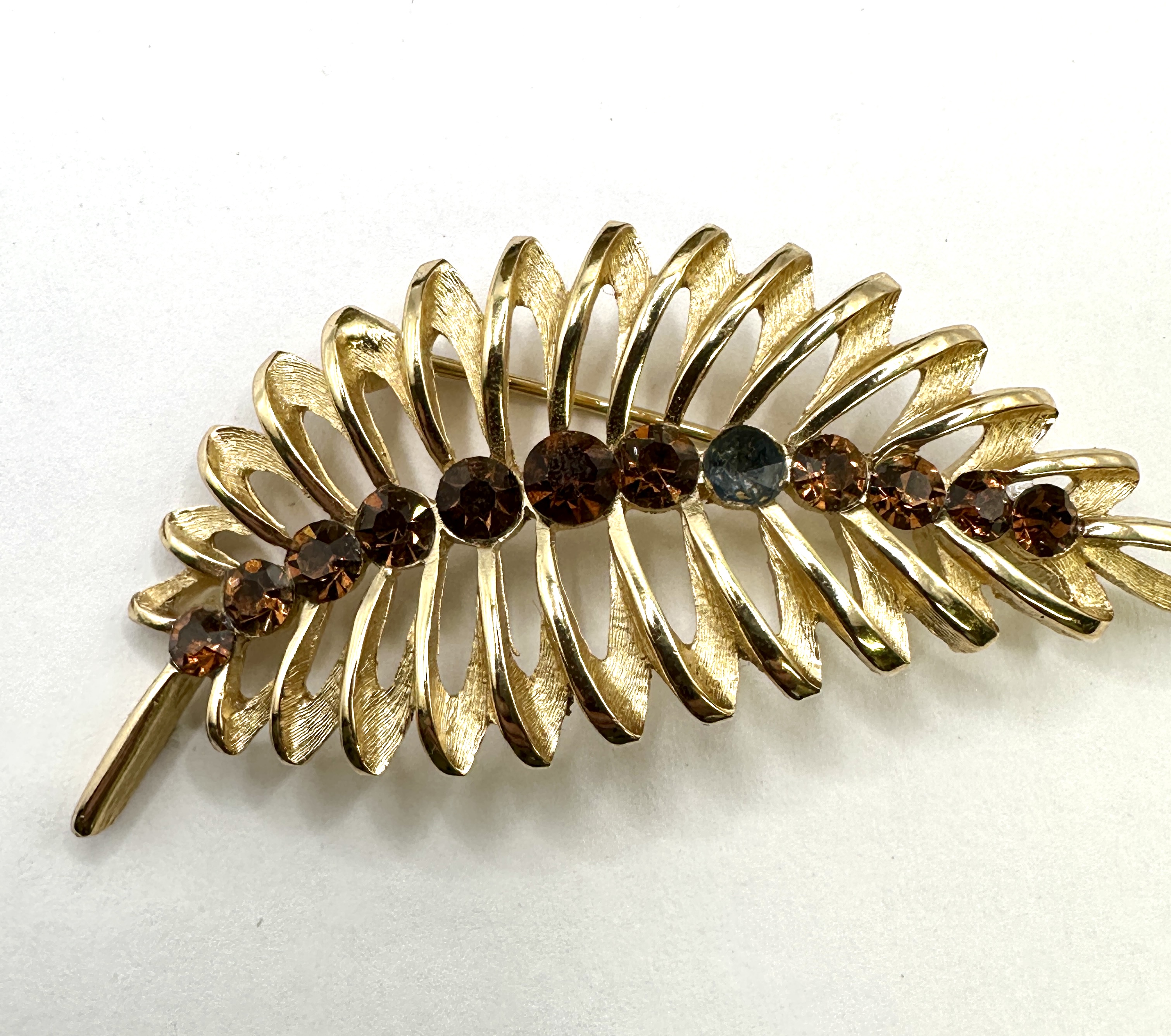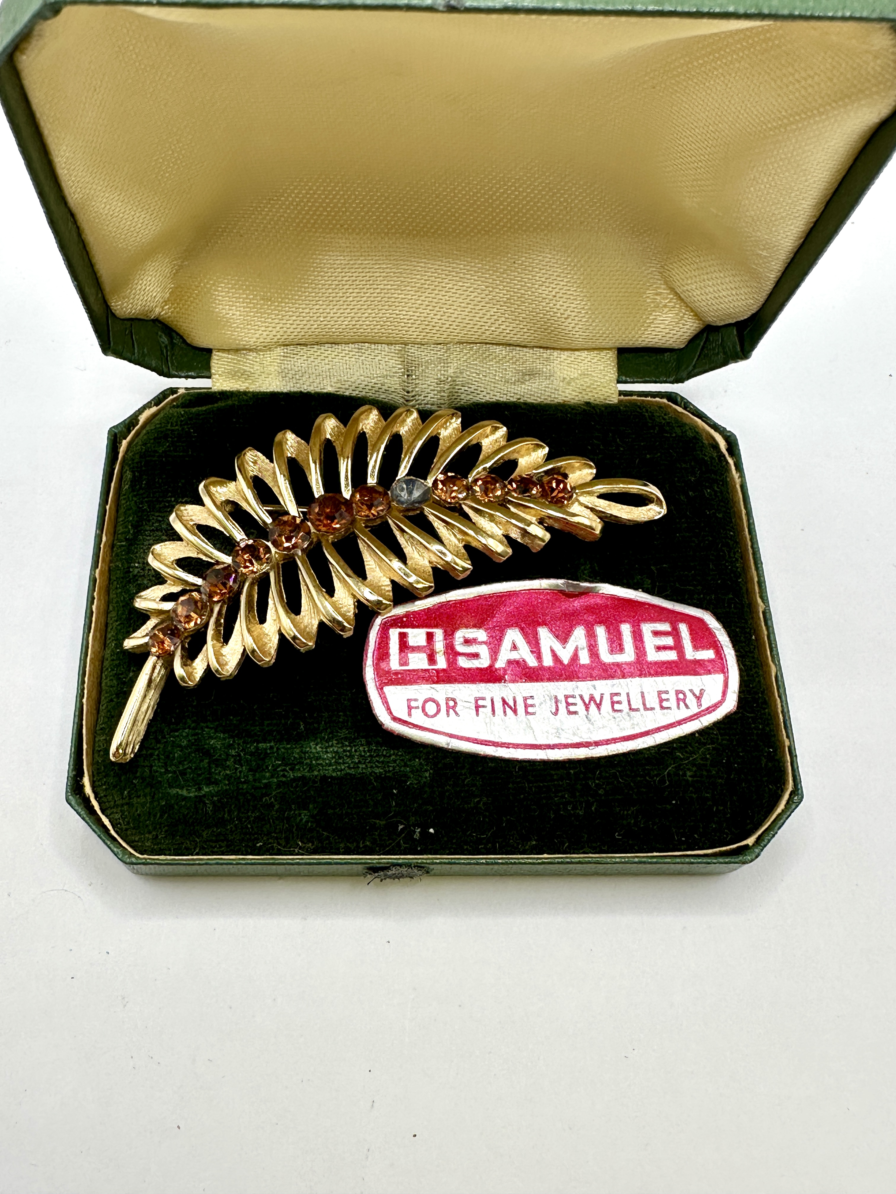 A vintage costume jewellery brooch associated with the British retailer H. Samuel. The piece is designed as a stylized leaf or feather, constructed from gold-tone base metal with a combination of brushed and polished finishes. The design features a series of curved, openwork ribs radiating from a central spine. Set along this spine is a row of eleven circular, faceted paste stones. Ten of these stones are amber in colour, while one stone positioned toward the centre-right is clear or grey. The brooch is presented in a green velvet-lined retailer’s box containing a red and white label printed with H. Samuel for Fine Jewellery. No maker’s marks are visible on the front of the item.