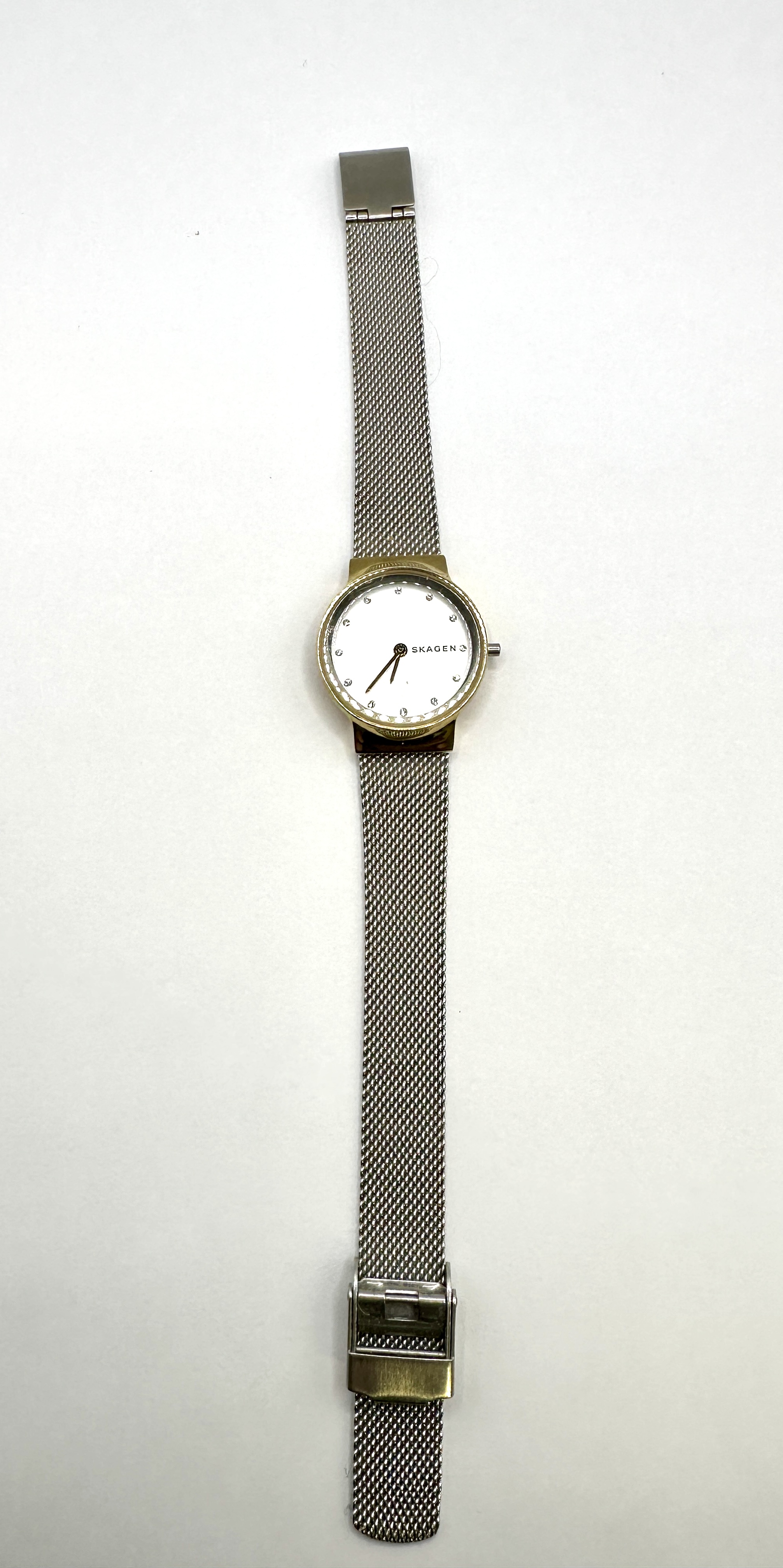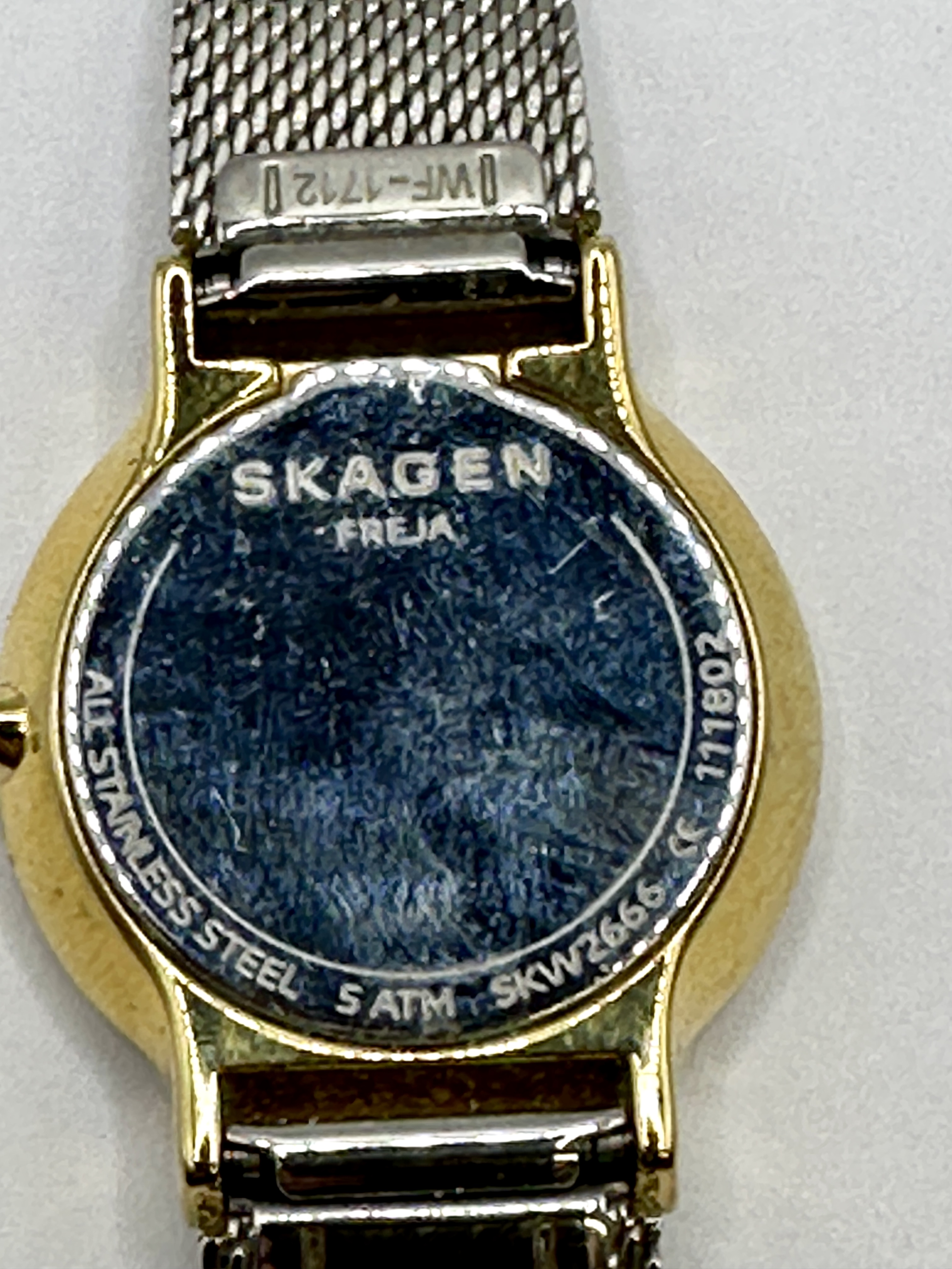 A ladies quartz wristwatch by Skagen, model Freja Lille, reference SKW2666. The timepiece features a gold-tone stainless steel case housing a white sunray dial with two gold-tone hands and twelve crystal-set indices at the hour positions. It is fitted with a silver-tone stainless steel mesh bracelet and a sliding fold-over clasp. The case back is inscribed with Skagen, Freja, All Stainless Steel, 5 ATM, SKW2666, CE, and the serial number 111802. A metal end-piece on the strap is marked WF-1712.