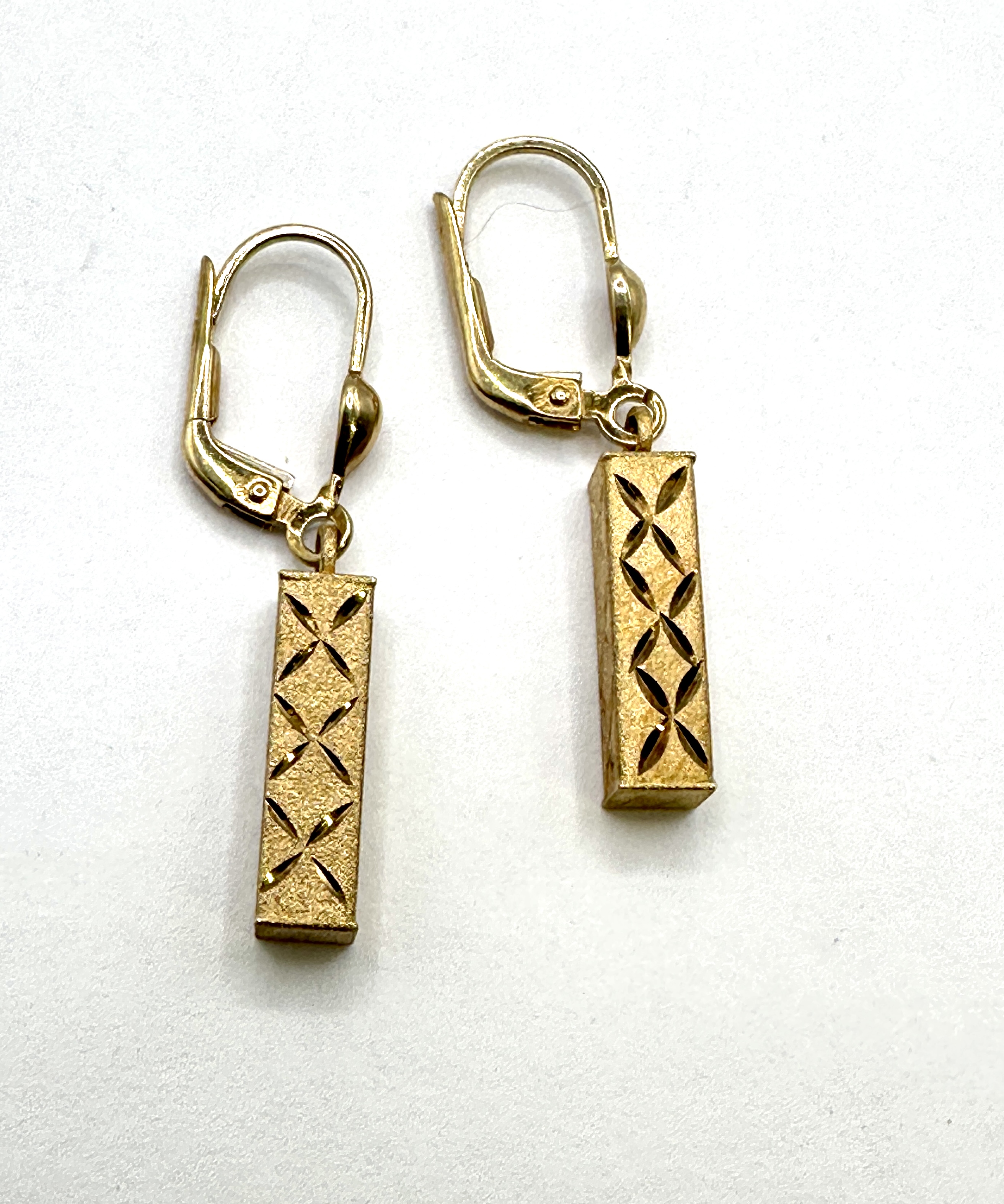 The earrings are in good overall condition. The diamond-cut detailing remains sharp and clear. The lever-back mechanisms are fully functional.