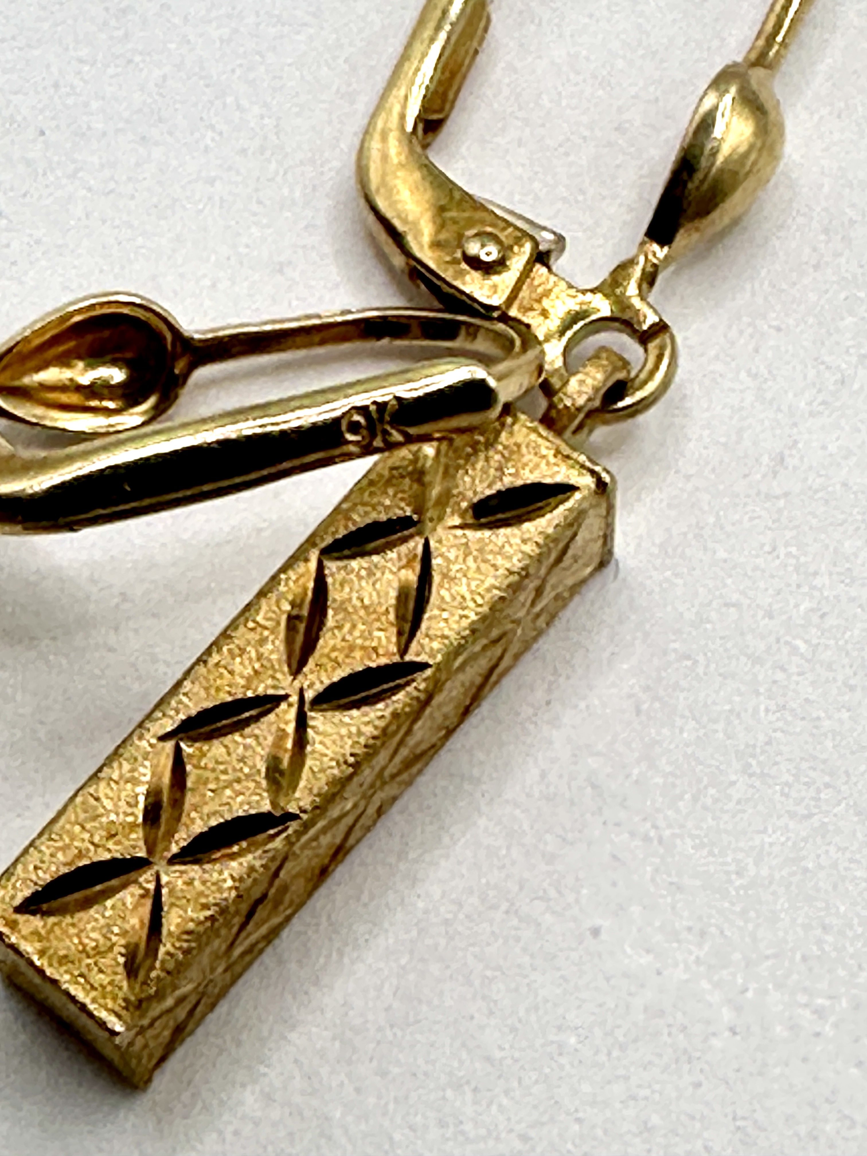 A matched pair of 9 carat yellow gold drop earrings. Each earring features a rectangular bar drop with a matte, sandblasted finish. The front surface of each bar is decorated with a vertical row of four diamond-cut star motifs. The rectangular drops are suspended from lever-back findings. The findings are marked 9K.