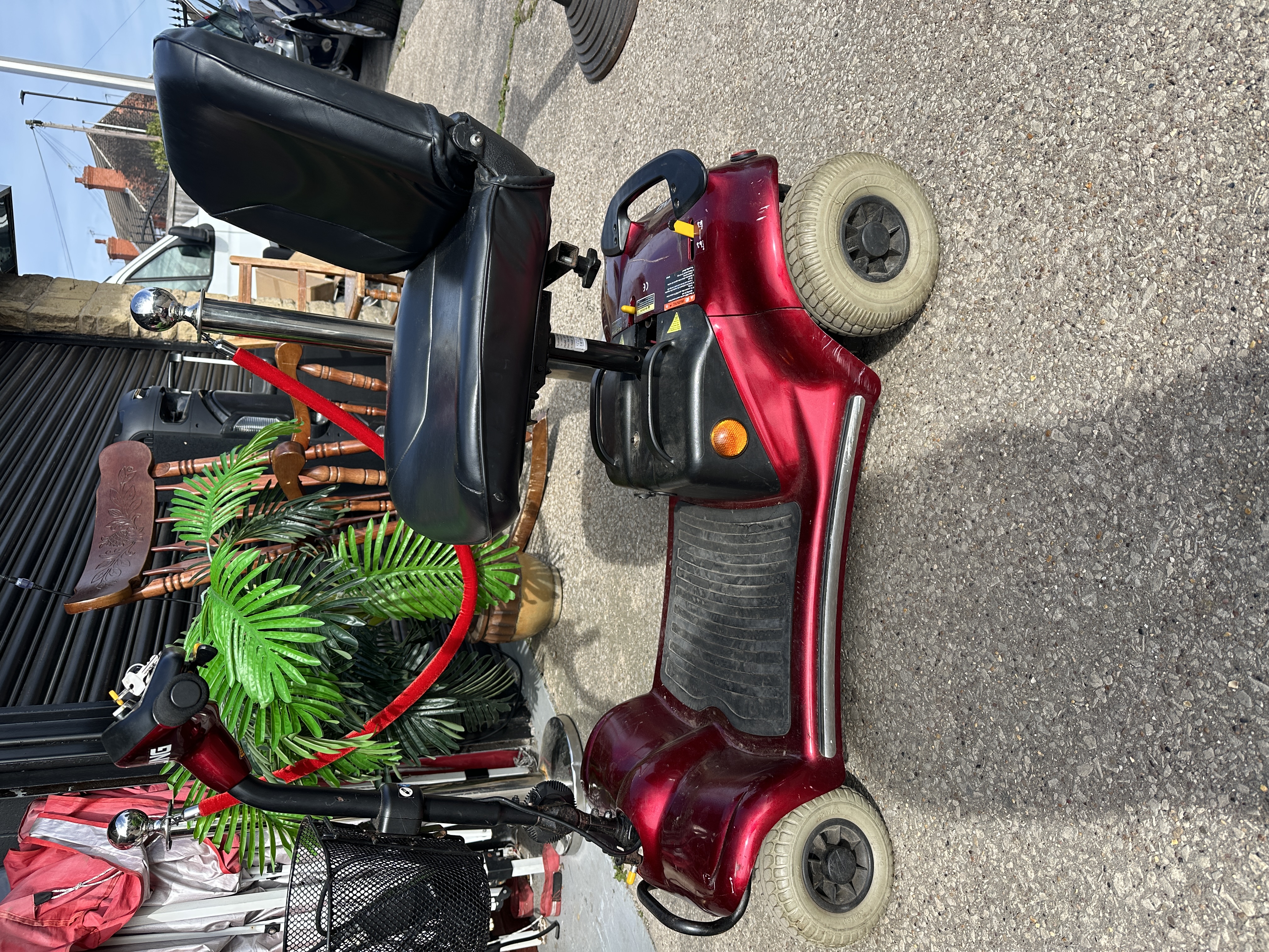The scooter shows signs of use consistent with age, including visible scuffs and scratches to the metallic red bodywork. The grey solid tyres show wear to the treads. The vinyl seat is intact. Mechanical and electrical components have not been tested.