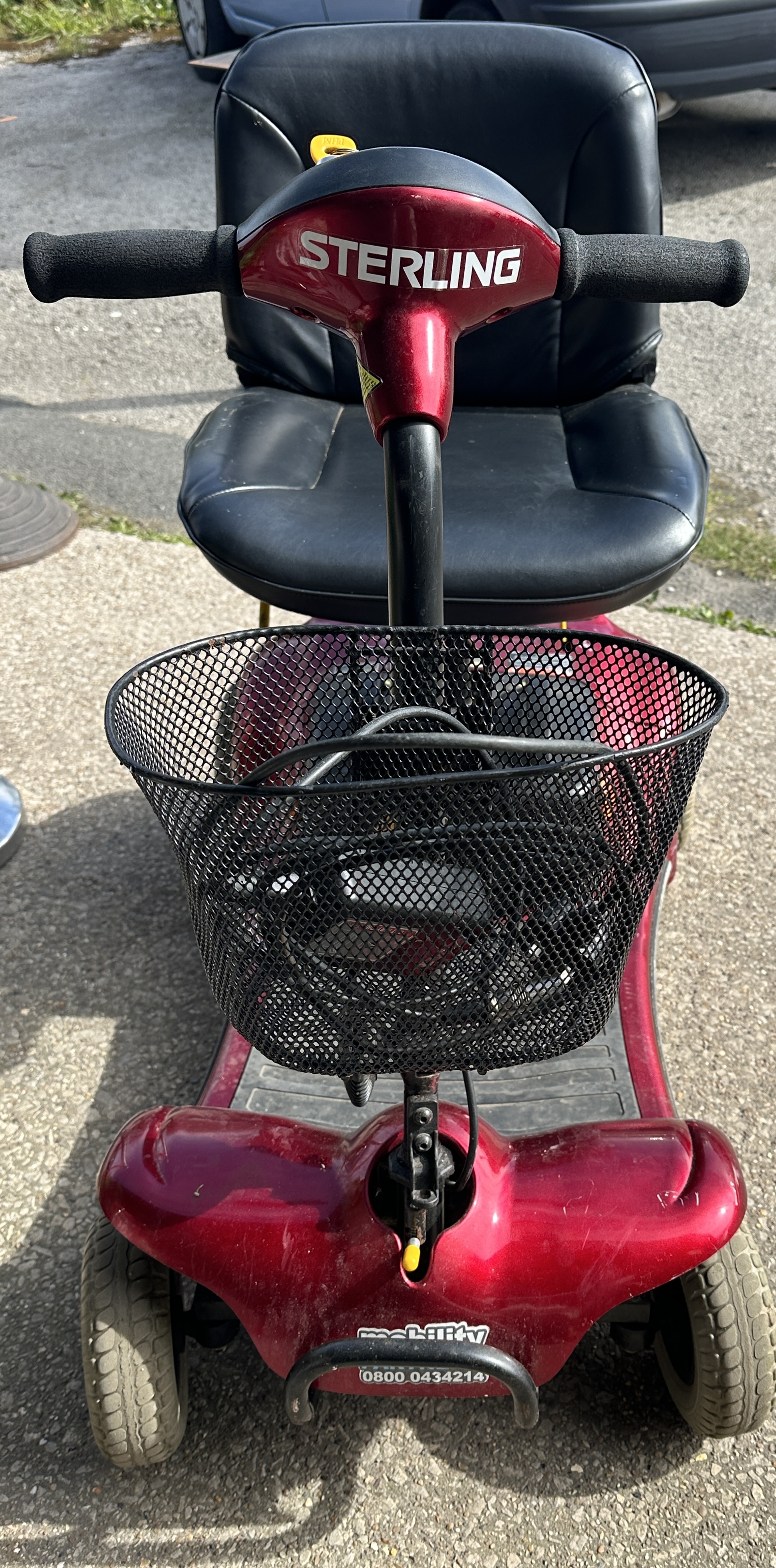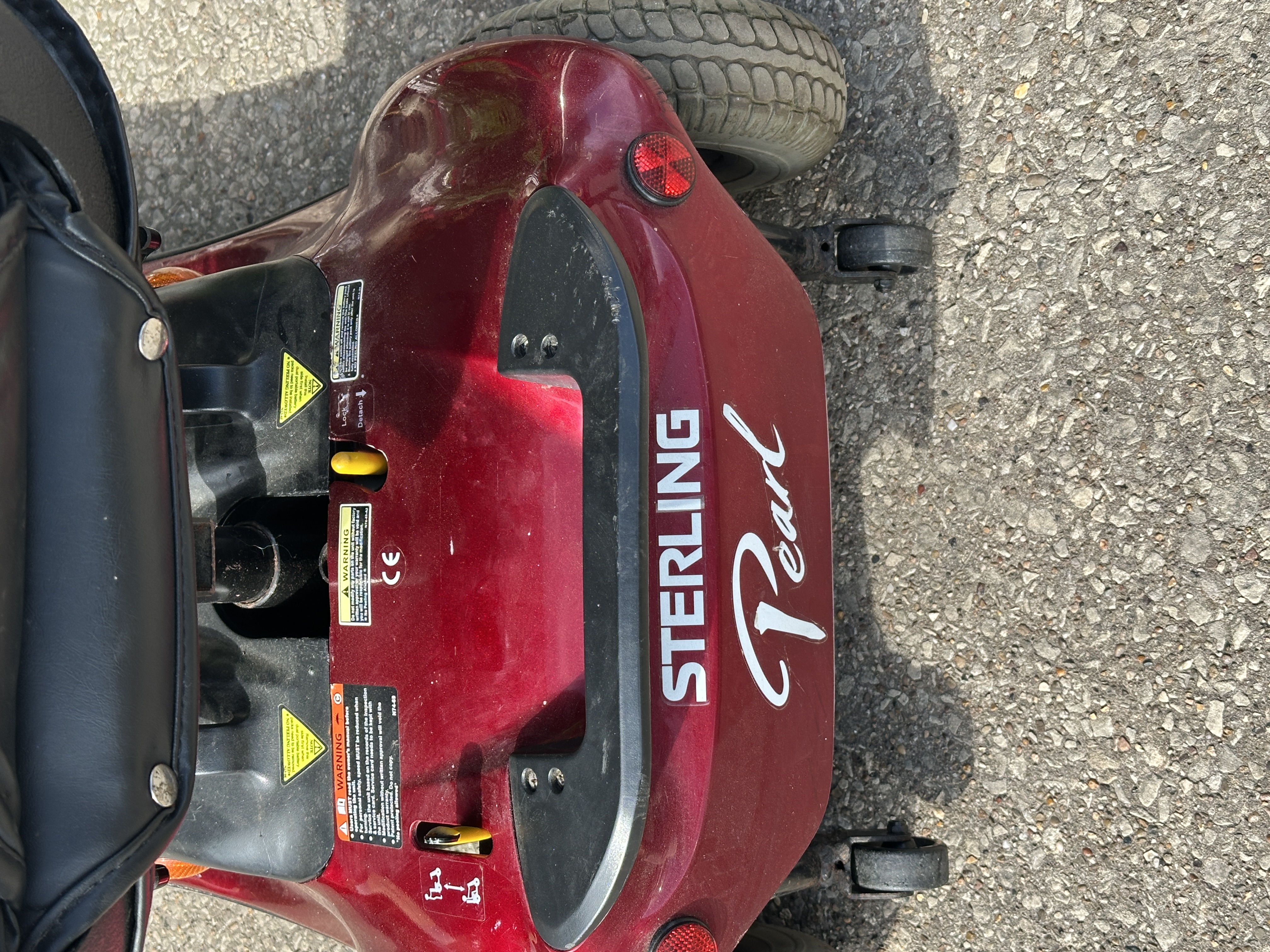 A Sterling Pearl four-wheel mobility scooter finished in a metallic red. The scooter features a black vinyl swivel seat with a folding backrest and a steering tiller with Sterling branding. To the front is a black wire-mesh basket containing a battery charging cable. The rear bodywork includes integrated lifting handles, rear reflectors, and anti-tip wheels, and is marked Sterling Pearl. The central housing is fitted with various warning labels and a CE mark. The front bumper displays a label for a mobility service provider with the UK telephone number 0800 0434214. The vehicle is mounted on four grey solid tyres.