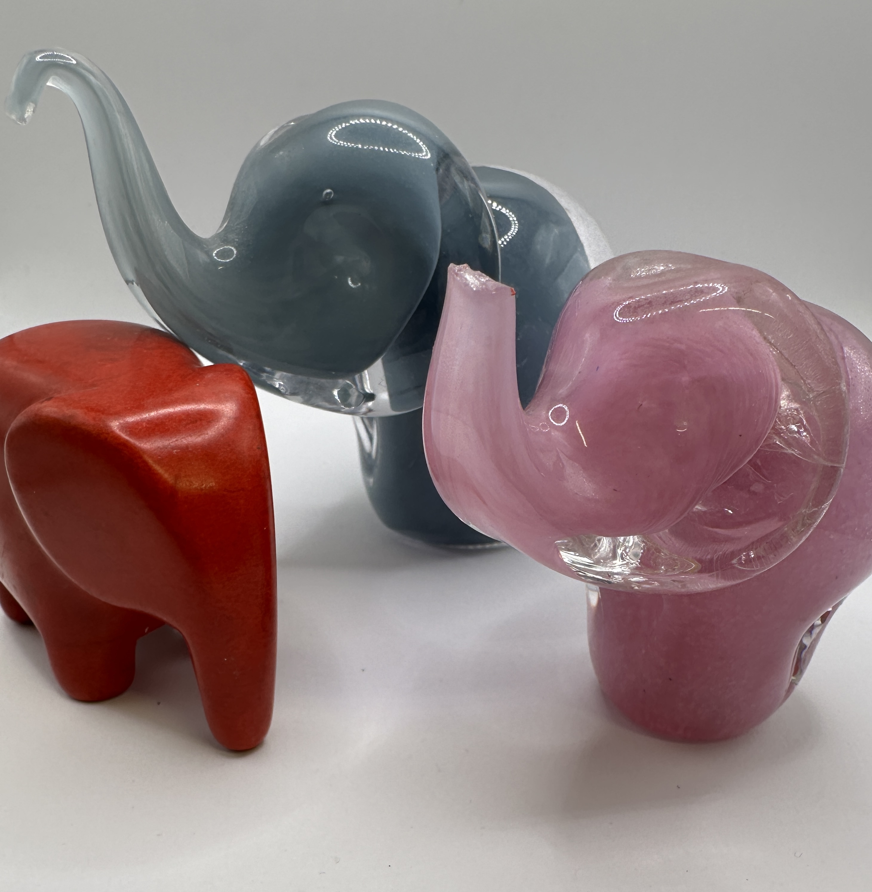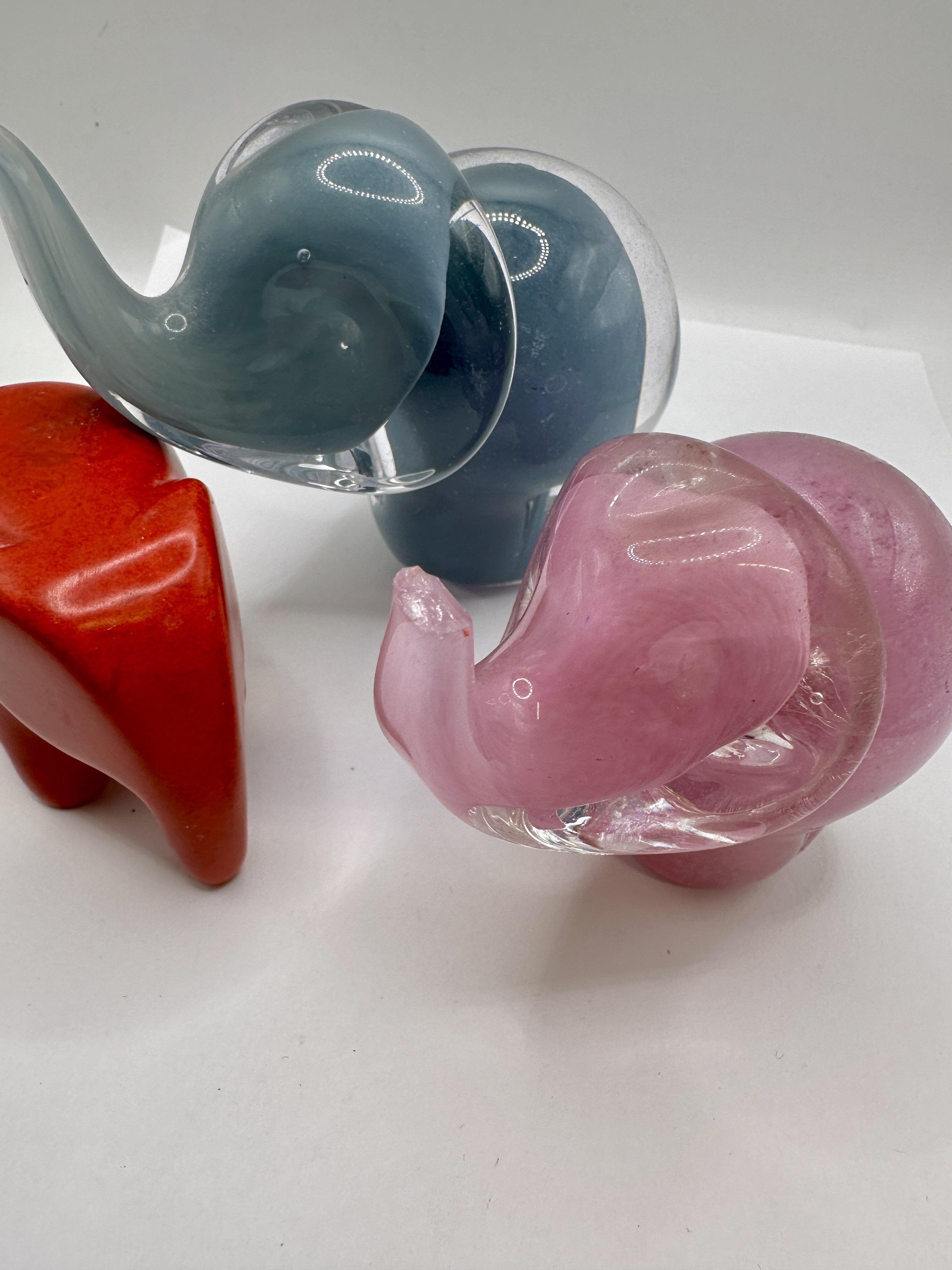The pink glass elephant has a clear break with loss to the tip of the trunk. The blue-grey glass elephant appears in good condition with some internal air bubbles present from the manufacturing process. The red stone elephant is in generally good condition with some minor surface scuffing.