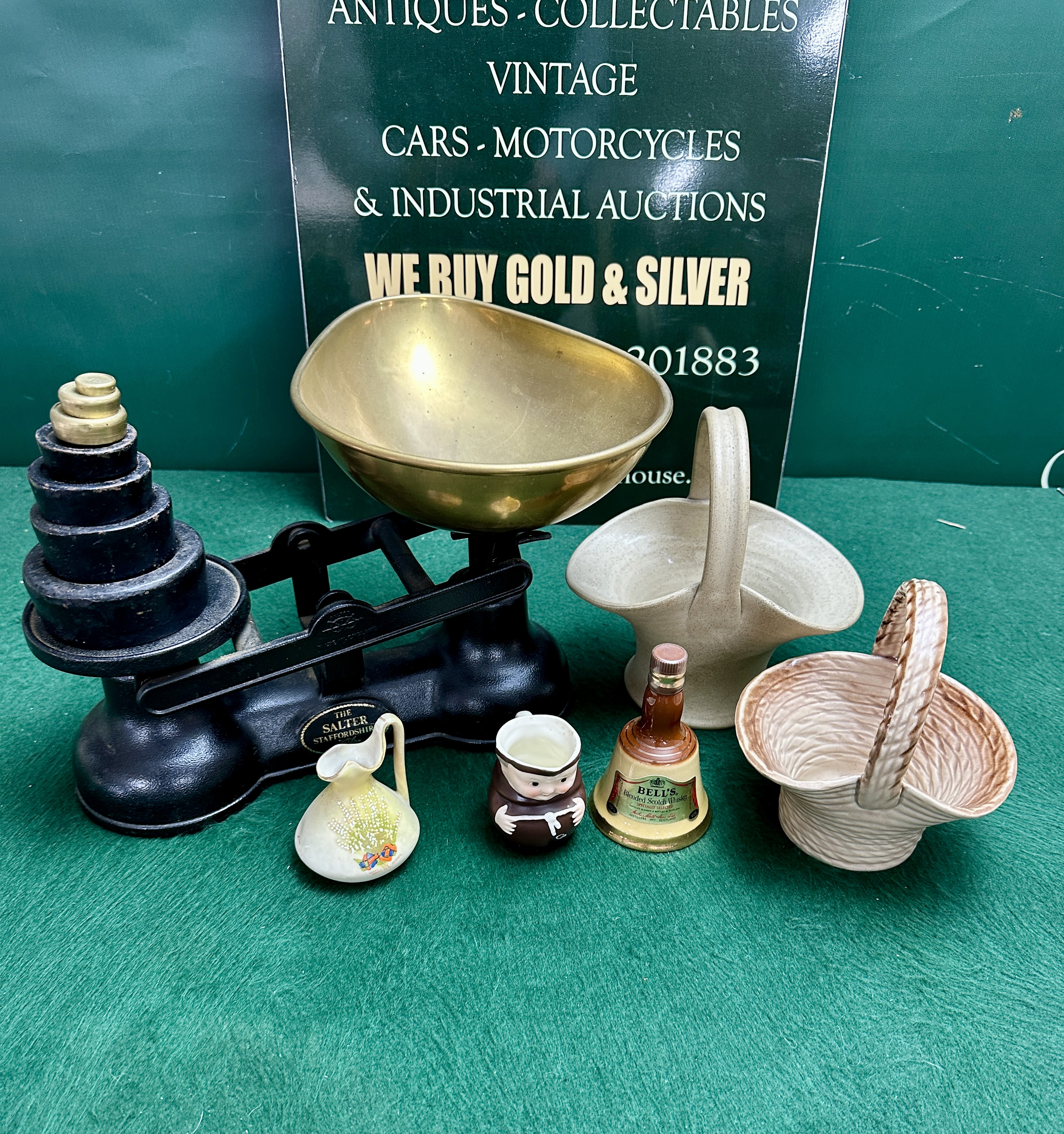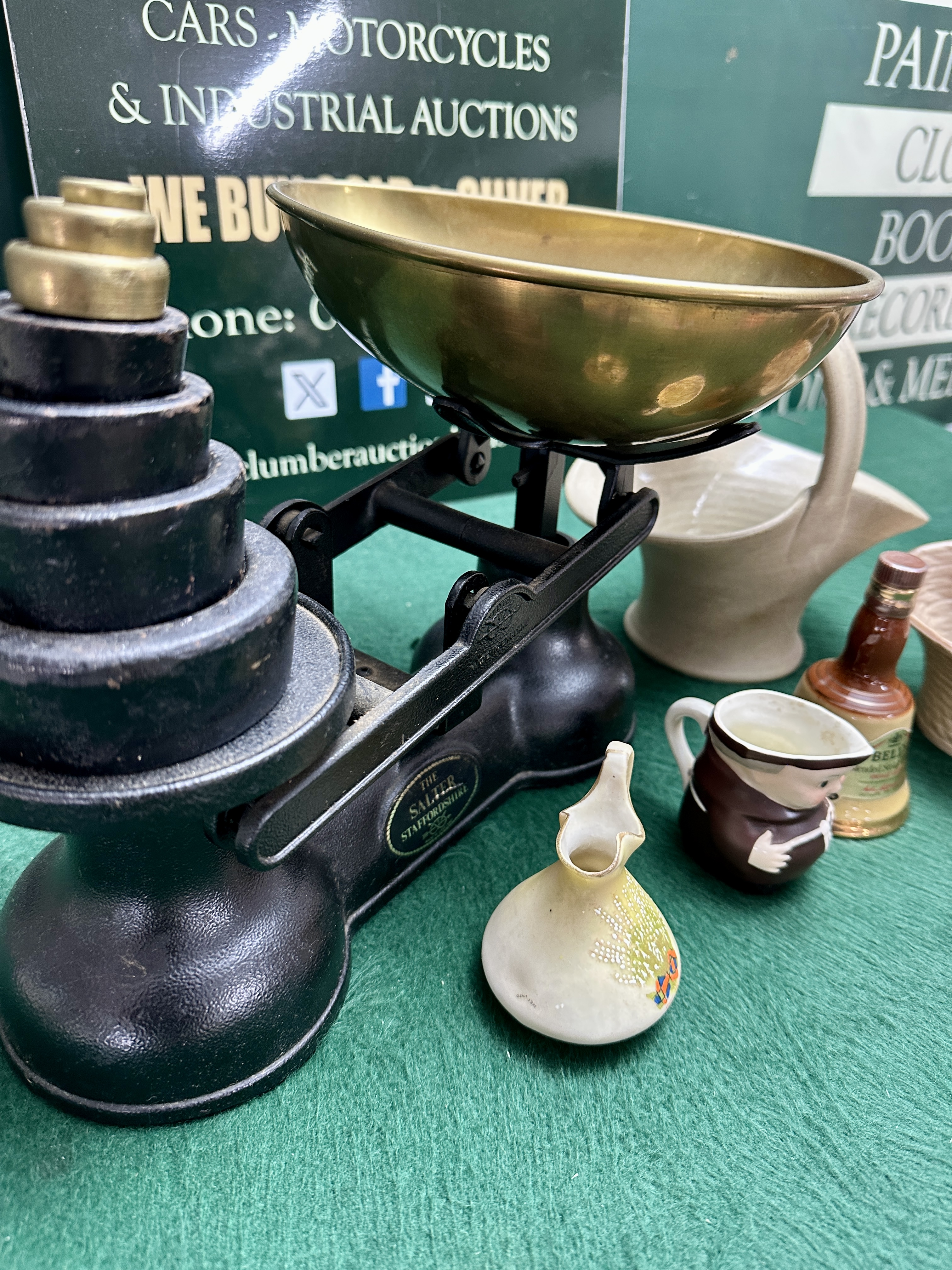 A collection of vintage household objects featuring a set of cast iron and brass balance scales by Salter of Staffordshire. The scales comprise a black-painted cast iron frame with a decorative oval label to the base reading The Salter Staffordshire. Accompanying the scales is a removable brass pan and a set of graduated weights in both cast iron and brass. The ceramic group includes a Bell’s blended Scotch whisky decanter in the form of a bell, a character creamer modelled as a monk in brown and cream glazes, basket-form vessels with moulded basketweave textures and single handles, and a small jug with hand-painted floral motifs on a white ground. The scales exhibit a traditional balance mechanism with a central pivot.