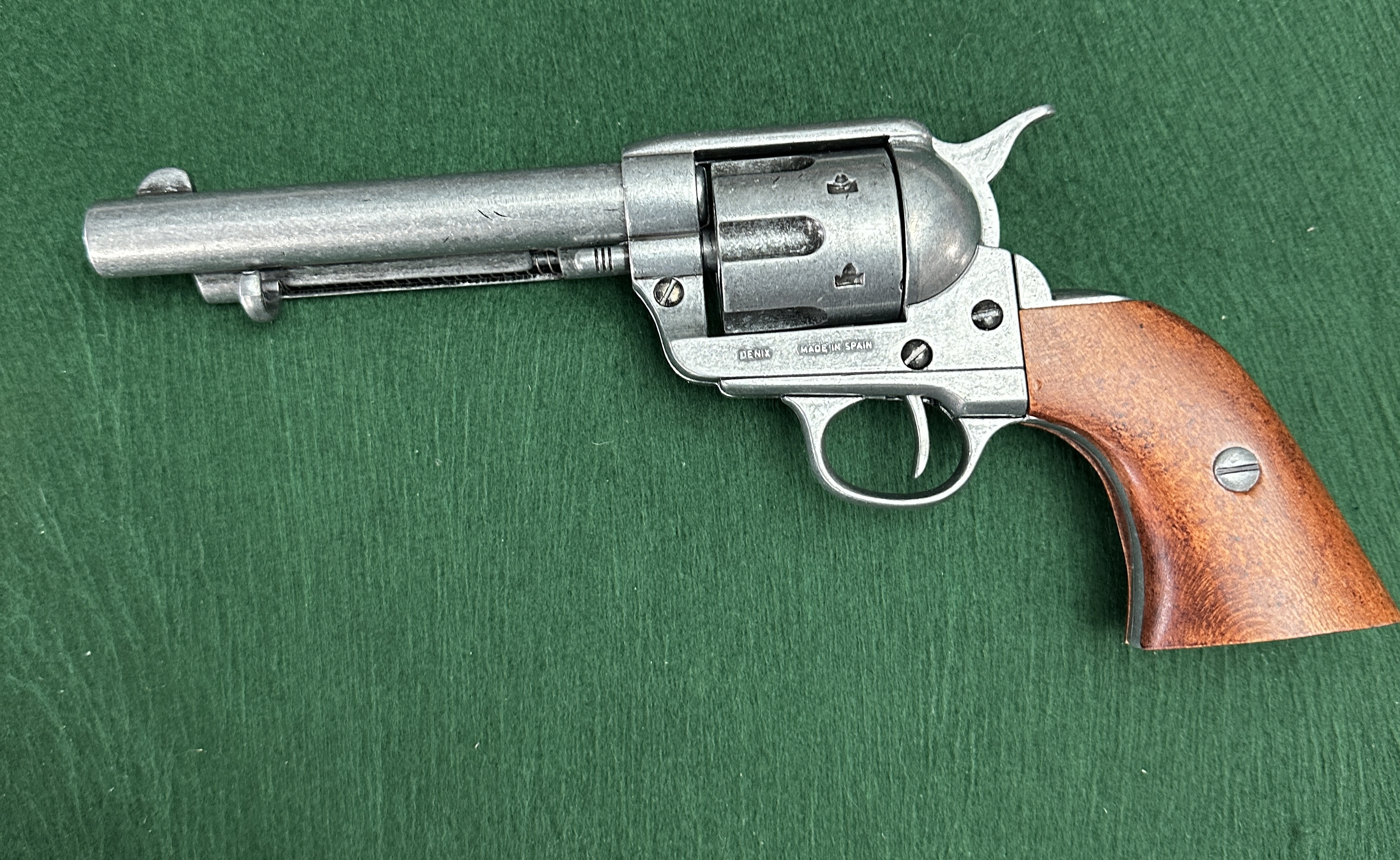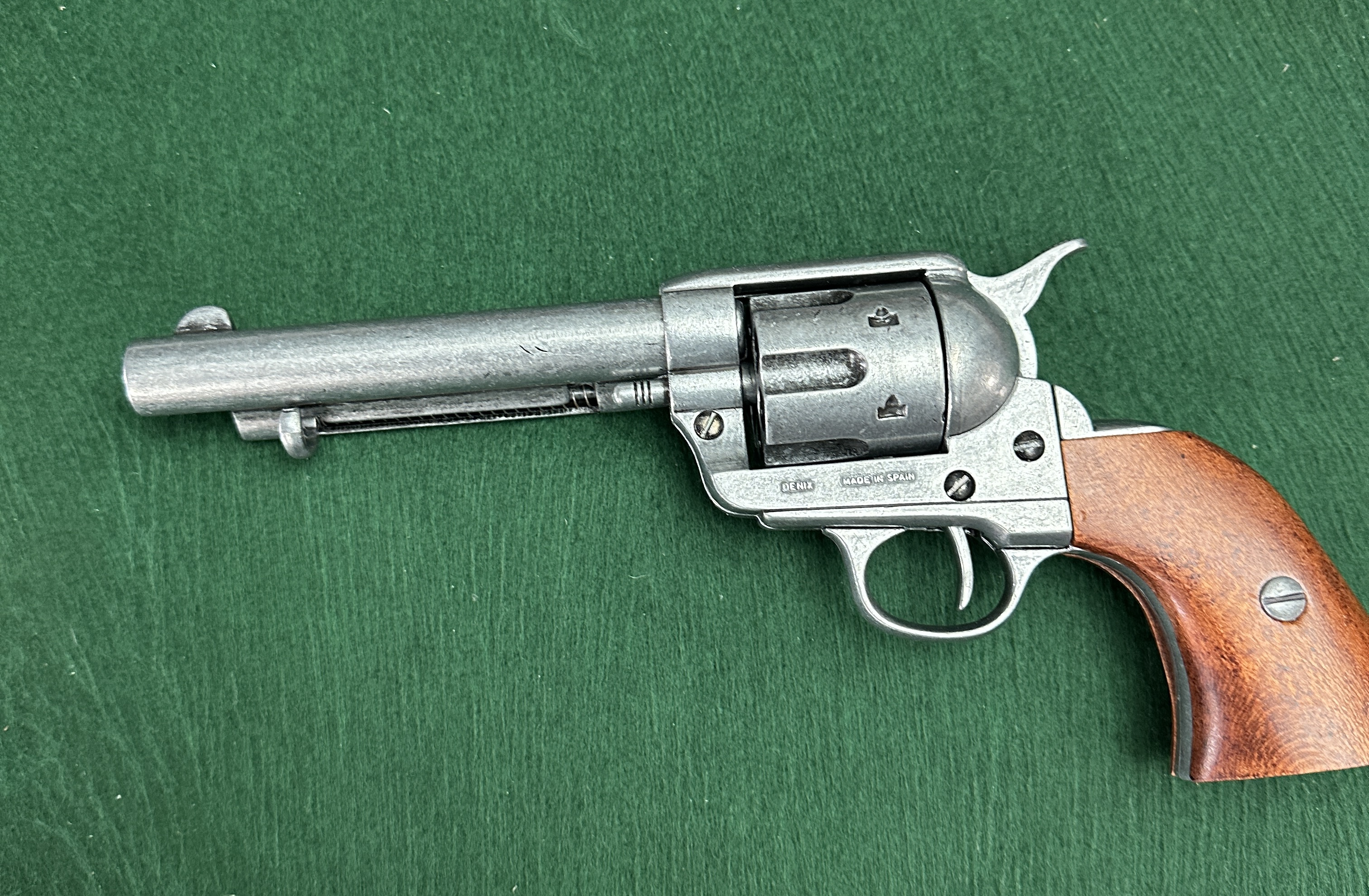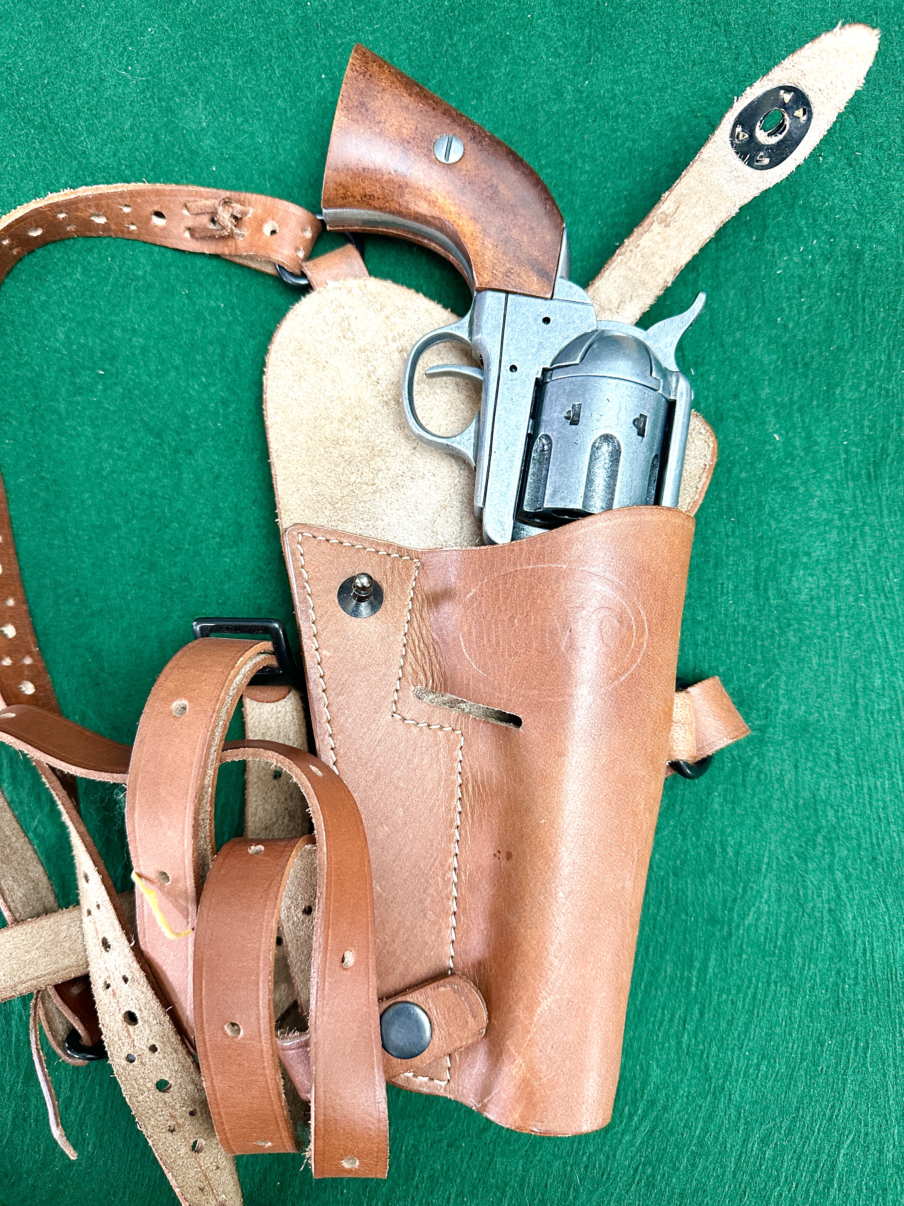 The replica is in good overall condition. The weathered appearance of the metalwork is consistent with the original manufacturing process. The wooden grips remain smooth with a high-gloss finish. The leather holster rig shows surface scuffs, creasing, and signs of handling consistent with use, but remains supple and functional.