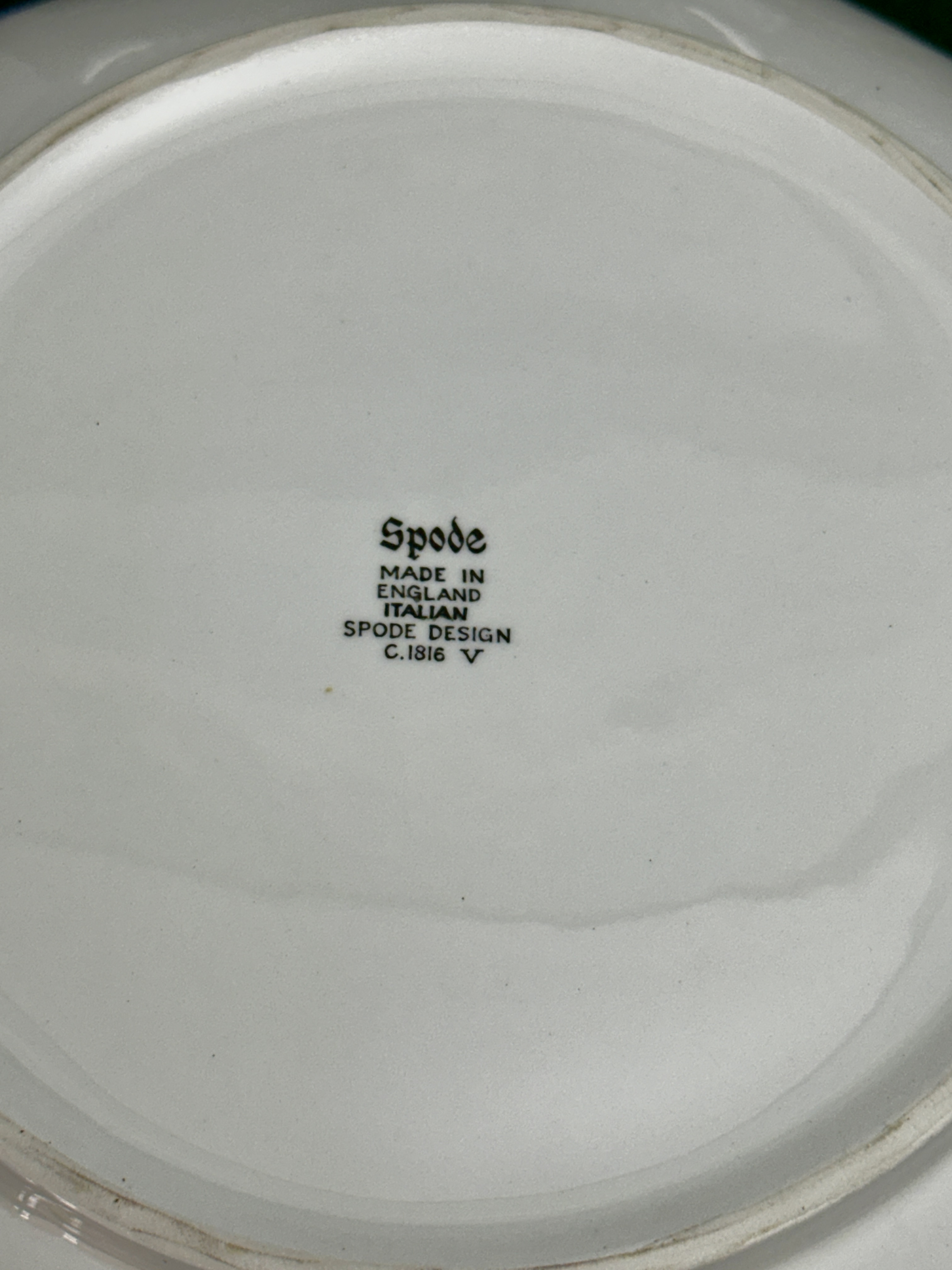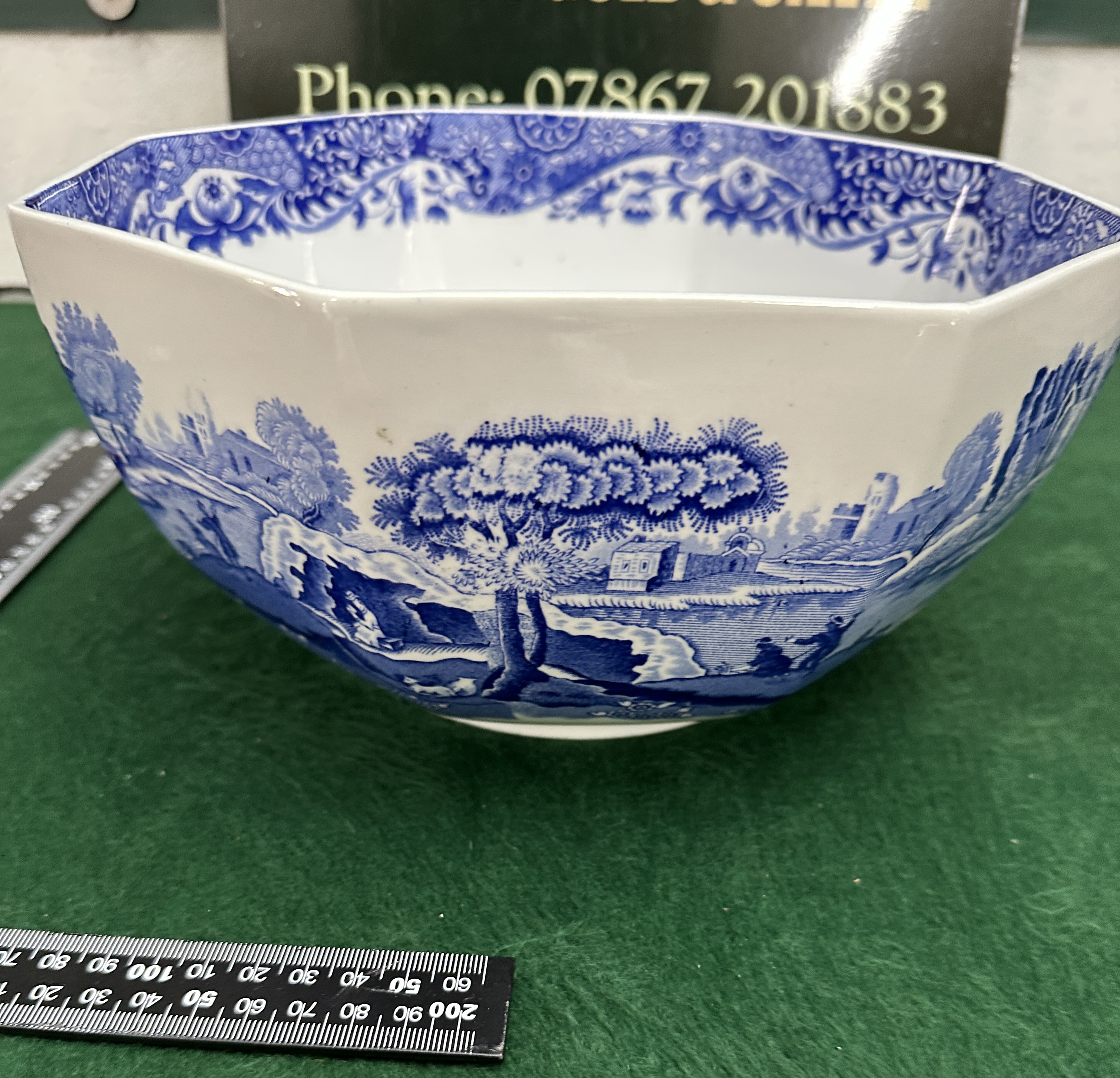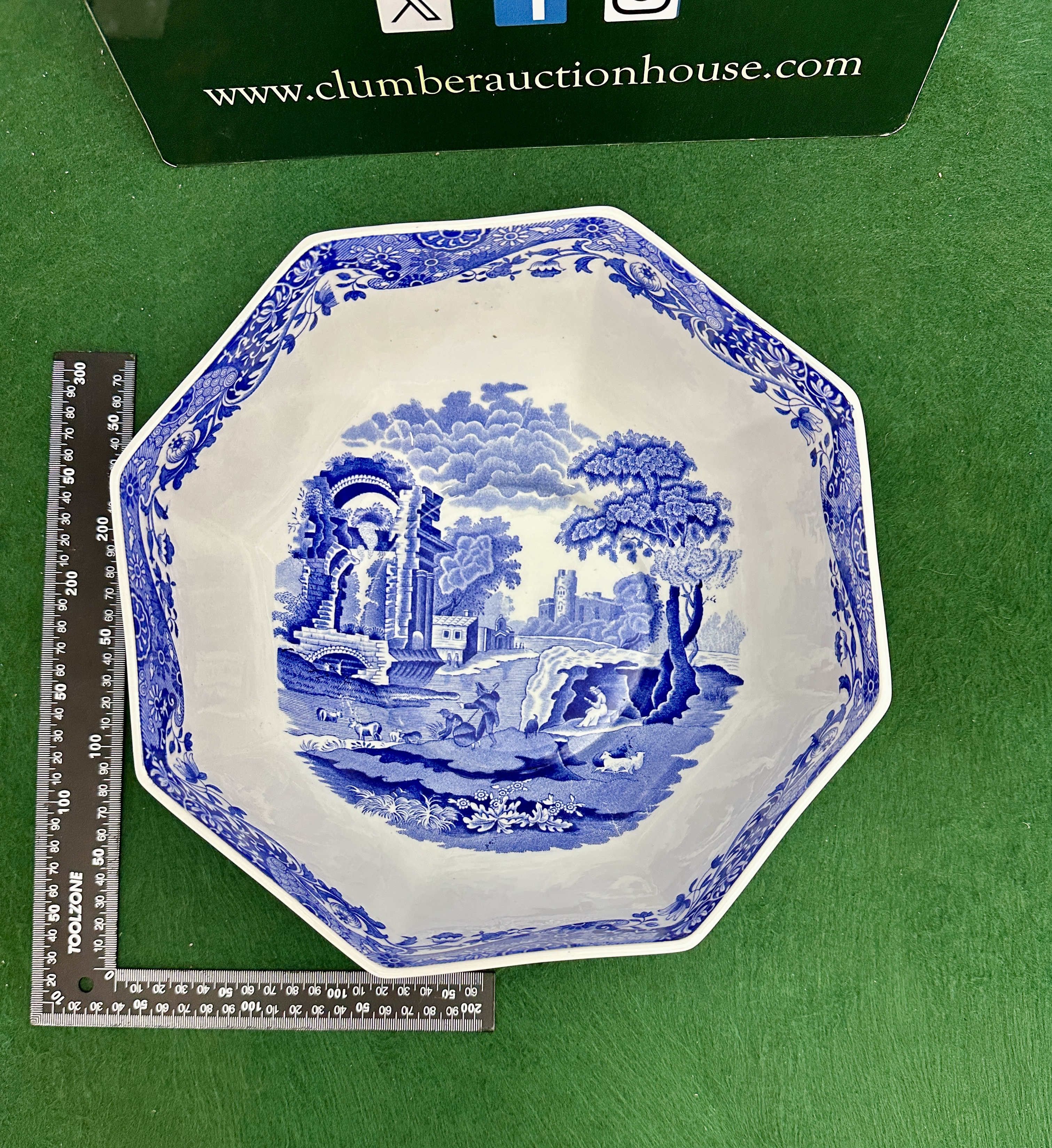 A Spode Blue Italian pattern octagonal serving bowl. The earthenware bowl features underglaze blue transfer-printed decoration. The central interior depicts a pastoral landscape with classical ruins, figures, and animals, surrounded by a repeating floral and foliate border at the rim. The exterior facets of the bowl are decorated with continuous landscape scenes. The underside features a black printed factory mark with Spode in Gothic script, Made in England, Italian, Spode Design, C.1816, and the letter V.