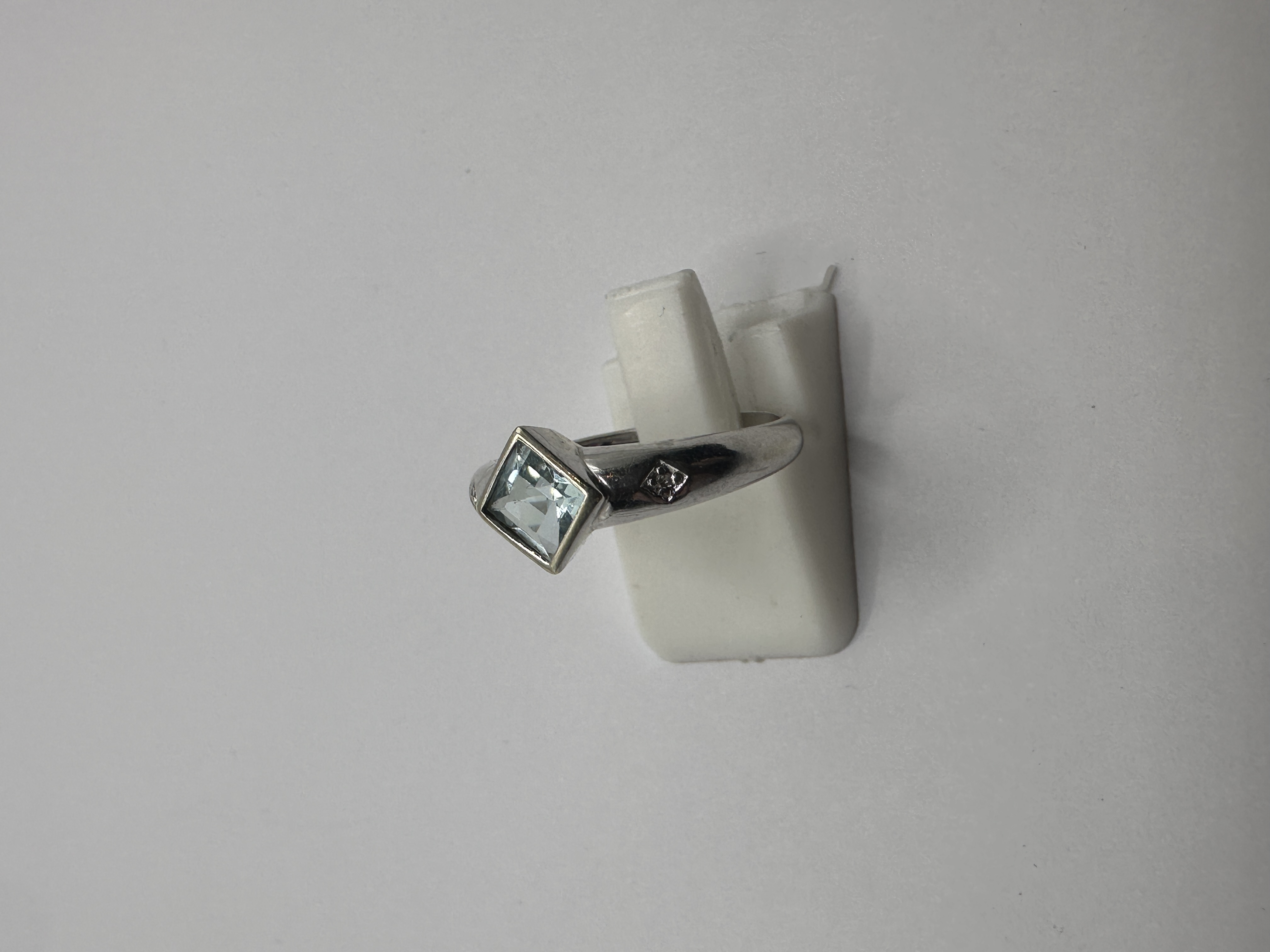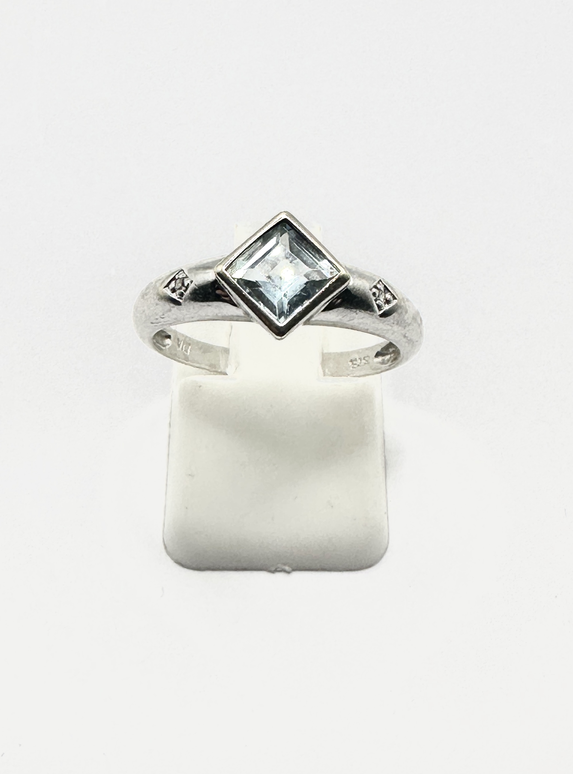 A 9 carat gold dress ring featuring a central square-cut light blue gemstone held in a bezel setting. The tapering shoulders are each accented with a single small circular-cut colourless stone grain-set into a diamond-shaped recess. The interior of the band is stamped 925 and VIA.