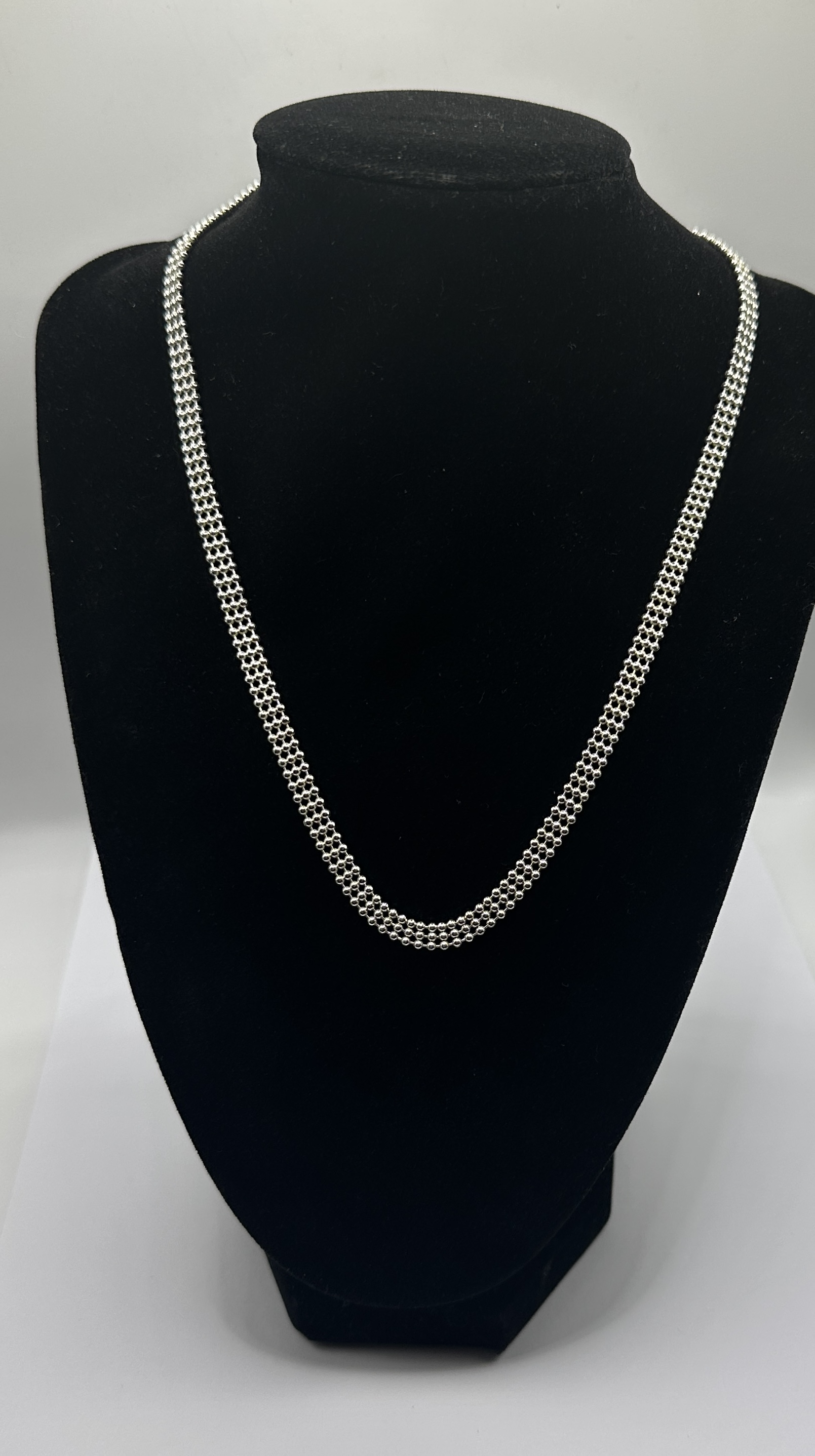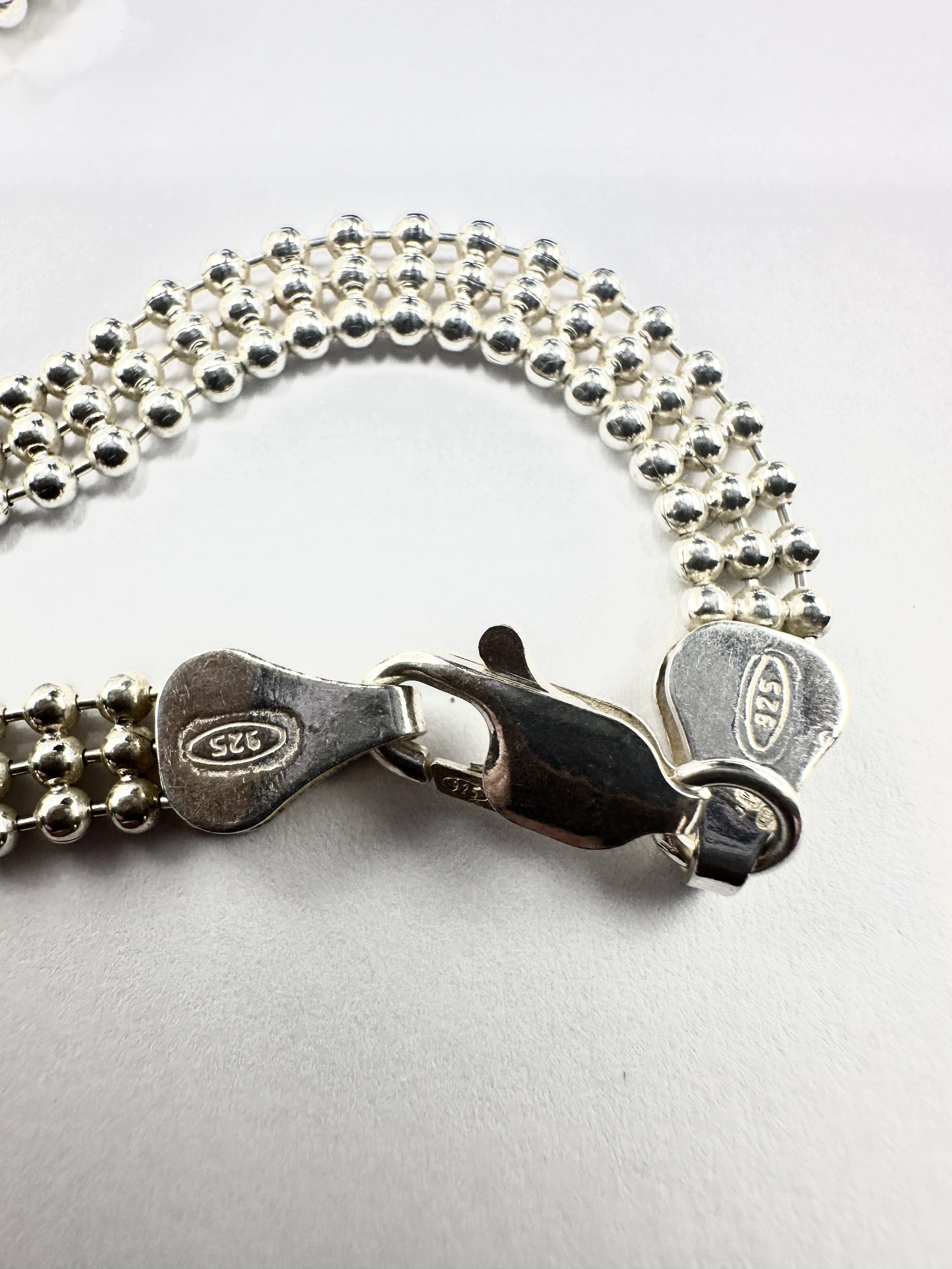 A 925 silver necklace featuring a triple-strand ball chain design. The piece is constructed from three parallel rows of polished spherical beads. These strands are gathered at each end by flattened, fan-shaped terminals that transition into a lobster claw clasp. Both the end caps and the side of the clasp are stamped with the 925 hallmark, confirming the metal as sterling silver.