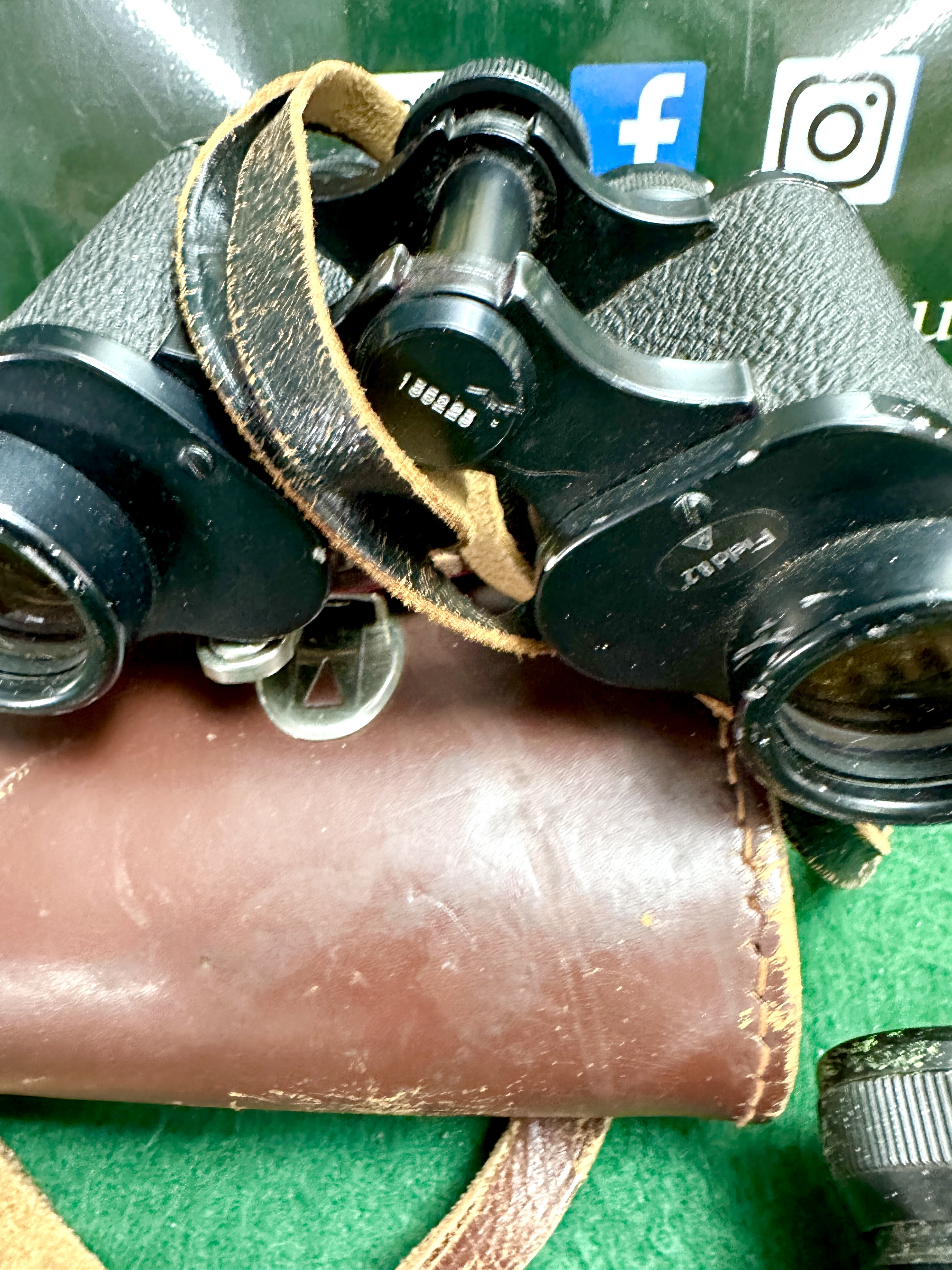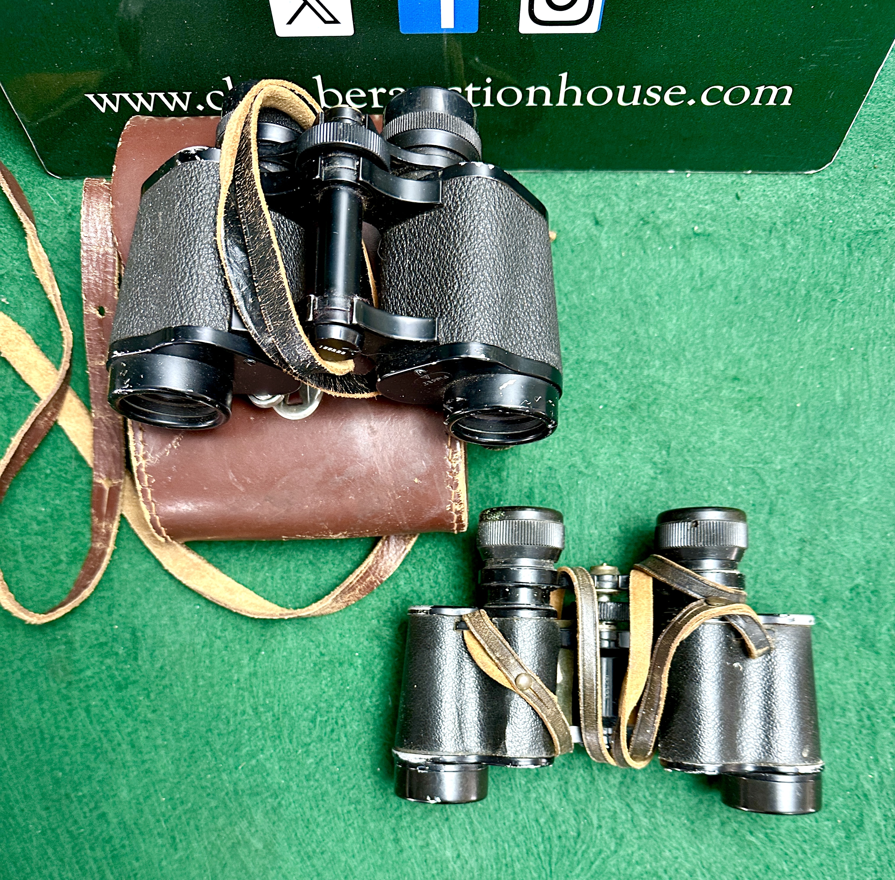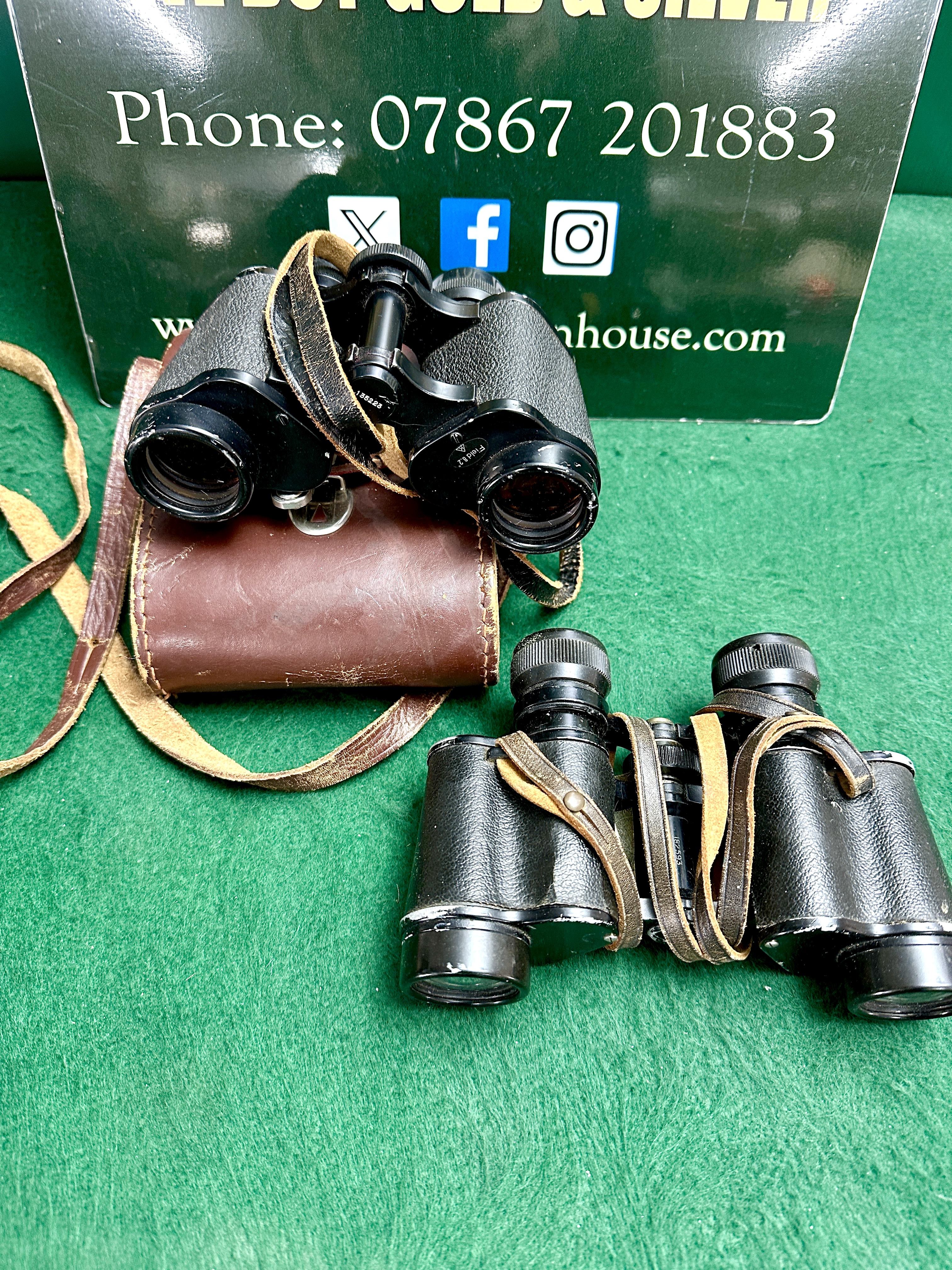 This lot comprises two pairs of vintage British military-issue field binoculars. The first pair is manufactured by Wray, London, featuring a porro-prism design with a metal body and black-textured vulcanite-style grips. The right-hand shoulder plate is engraved with a broad arrow symbol above the text Field 8.2 degrees and a circular logo containing a stylized letter W. The centre hinge cap is stamped with the serial number 135228. This instrument is accompanied by a stitched brown leather carry case with a silver-tone latch bearing a red triangle emblem. The second pair is a Bino. Prism No. 2 Mark III pattern, featuring a metal body with black-textured grips and a leather neck strap. The central hinge is marked with the serial number 152495, and a broad arrow symbol is visible on the right barrel near the eyepiece. The left shoulder plate is incised with the designation Bino. Prism No. 2 Mk. III. Both instruments are of porro-prism construction and include leather neck straps.