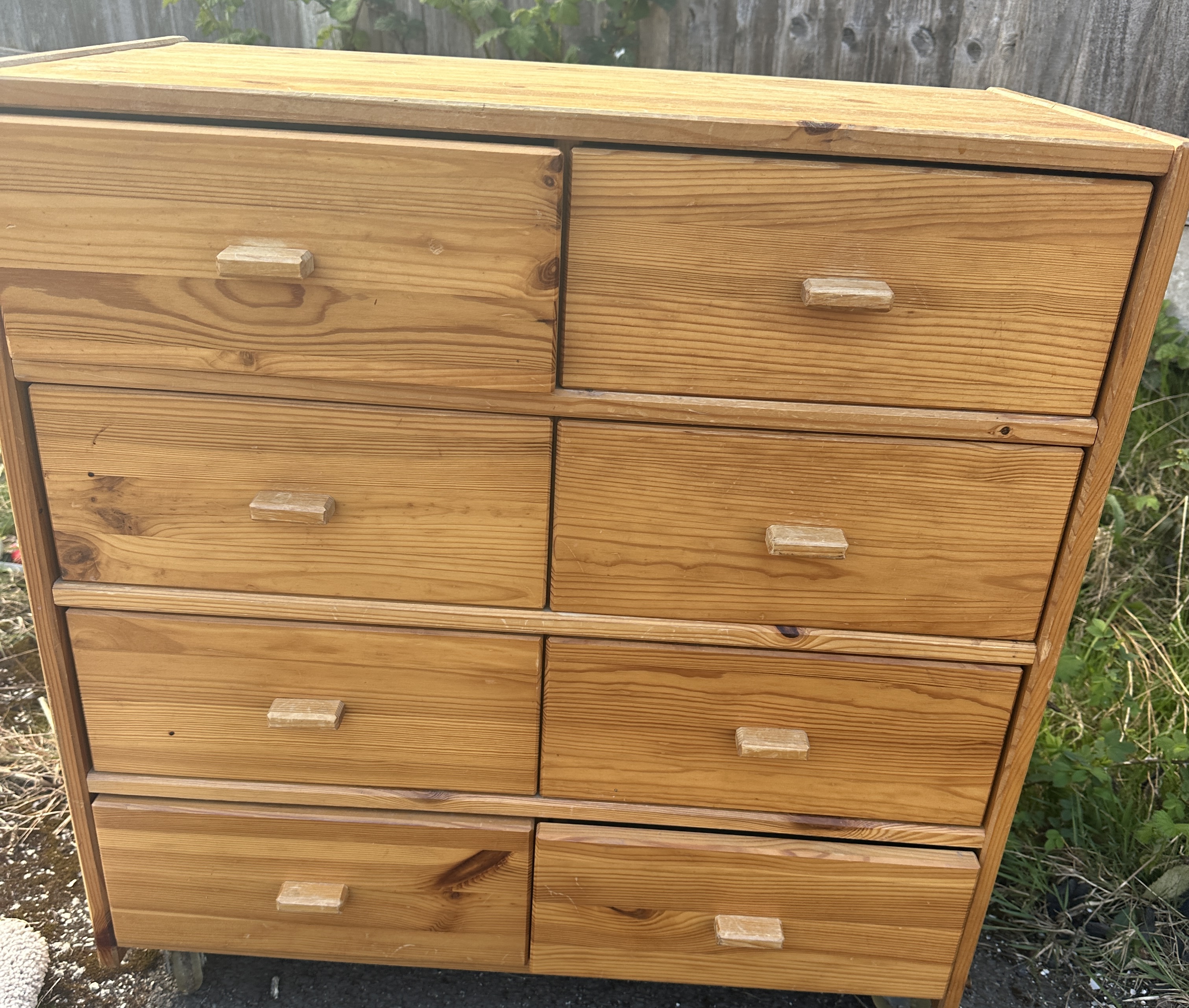 The item is in fair used condition. There are visible surface scratches, scuffs, and minor indentations to the top and side panels consistent with domestic use. The top-right drawer appears slightly misaligned on its runners. The castors are likely an aftermarket addition.