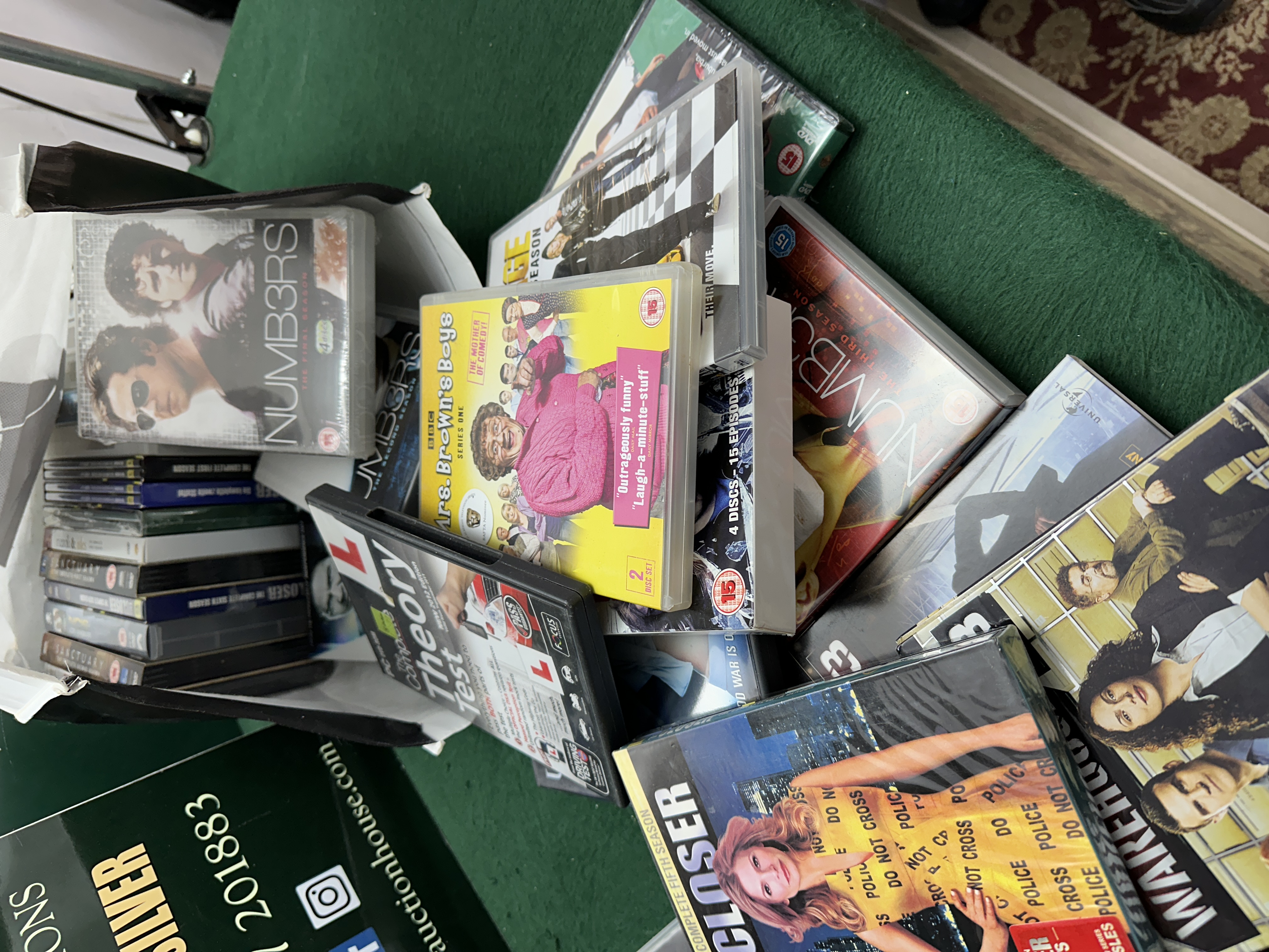 This collection consists of several television series DVD box sets and individual season releases, primarily within the crime drama and comedy genres. The lot is produced for the United Kingdom market (PAL Region 2), indicated by the presence of British Board of Film Classification (BBFC) age rating symbols on the covers. Identifiable titles include Mrs. Brown’s Boys: Series One, The Closer: The Complete Fifth Season and The Complete Sixth Season, Numb3rs: The Final Season and Season 5, Warehouse 13: Season 3, Rizzoli & Isles: The Complete First Season, Sanctuary: Complete First Season, NCIS: Los Angeles: The Second Season, and Men At Work: Season 3. The collection also includes a Theory Test driving preparation DVD. The discs are housed in standard plastic amaray cases, with some featuring additional cardboard outer slipcases. Visible markings include the red BBFC 15 rating symbols and various series titles and production credits.