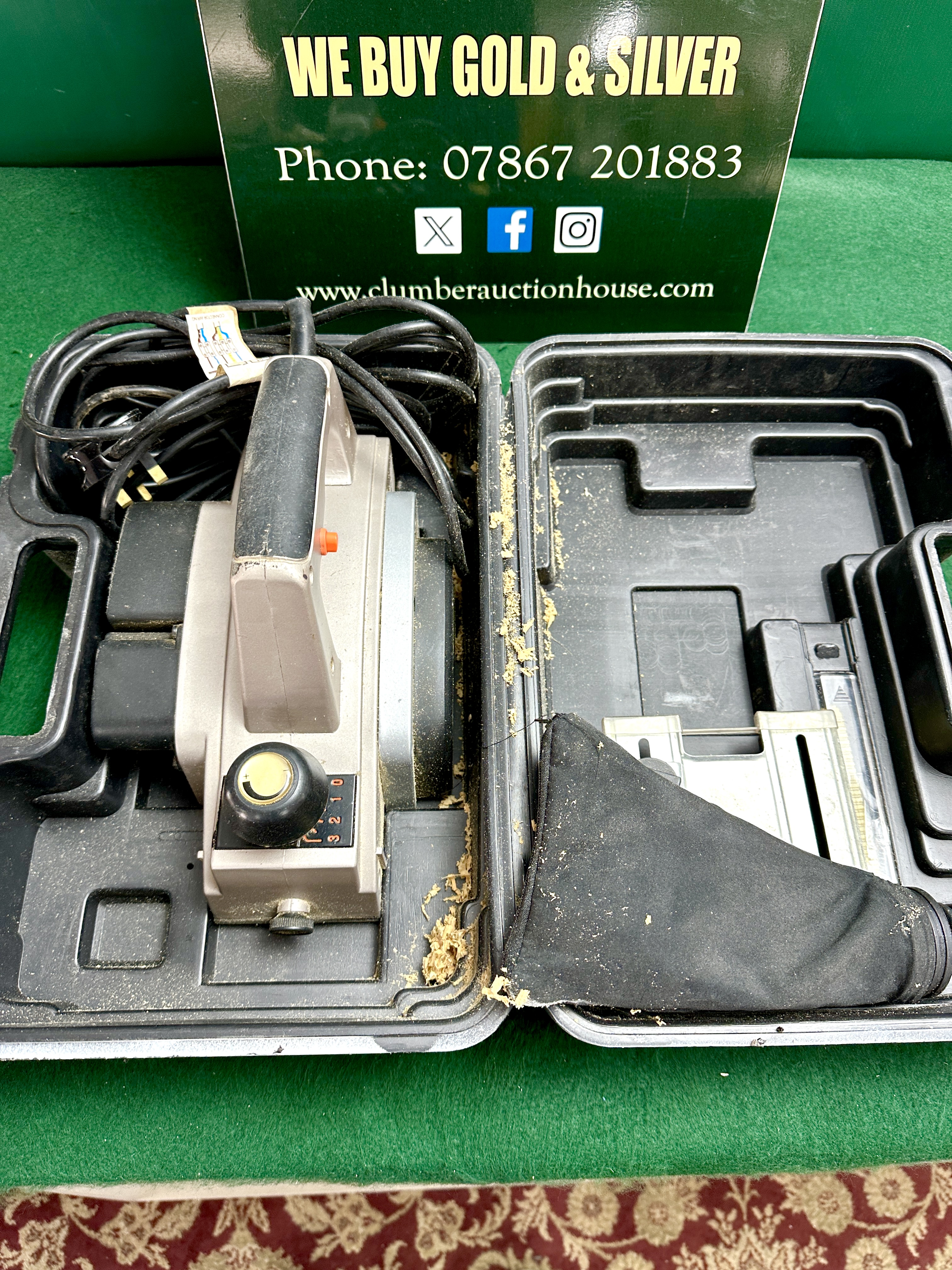 The item is in used condition with significant residues of wood shavings and sawdust within the tool housing and the carrying case. There is visible surface oxidation and rust to the cutting blades and minor wear to the metal base plates. The tool is untested for working order.