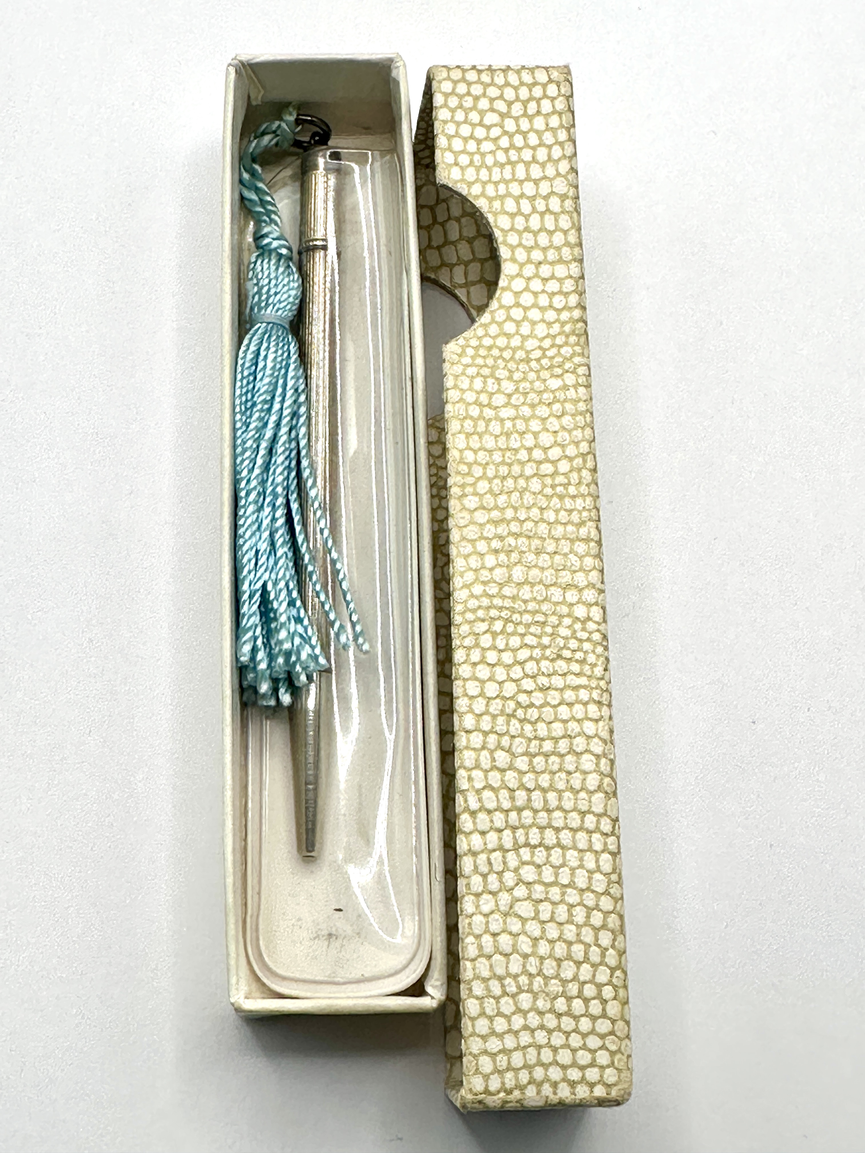 A vintage 925 silver miniature propelling pencil of a type traditionally used for chatelaines or dance cards. The cylindrical barrel is decorated with a linear engine-turned guilloché pattern. A suspension ring is attached to the top, which holds a pale blue corded textile tassel. The pencil has a smooth, tapered point and operates via a twist-action propelling mechanism. Small markings are visible on the barrel near the suspension ring. The item is presented in its original fitted box, which has a cream-coloured textured snakeskin-effect exterior and a contoured interior tray.