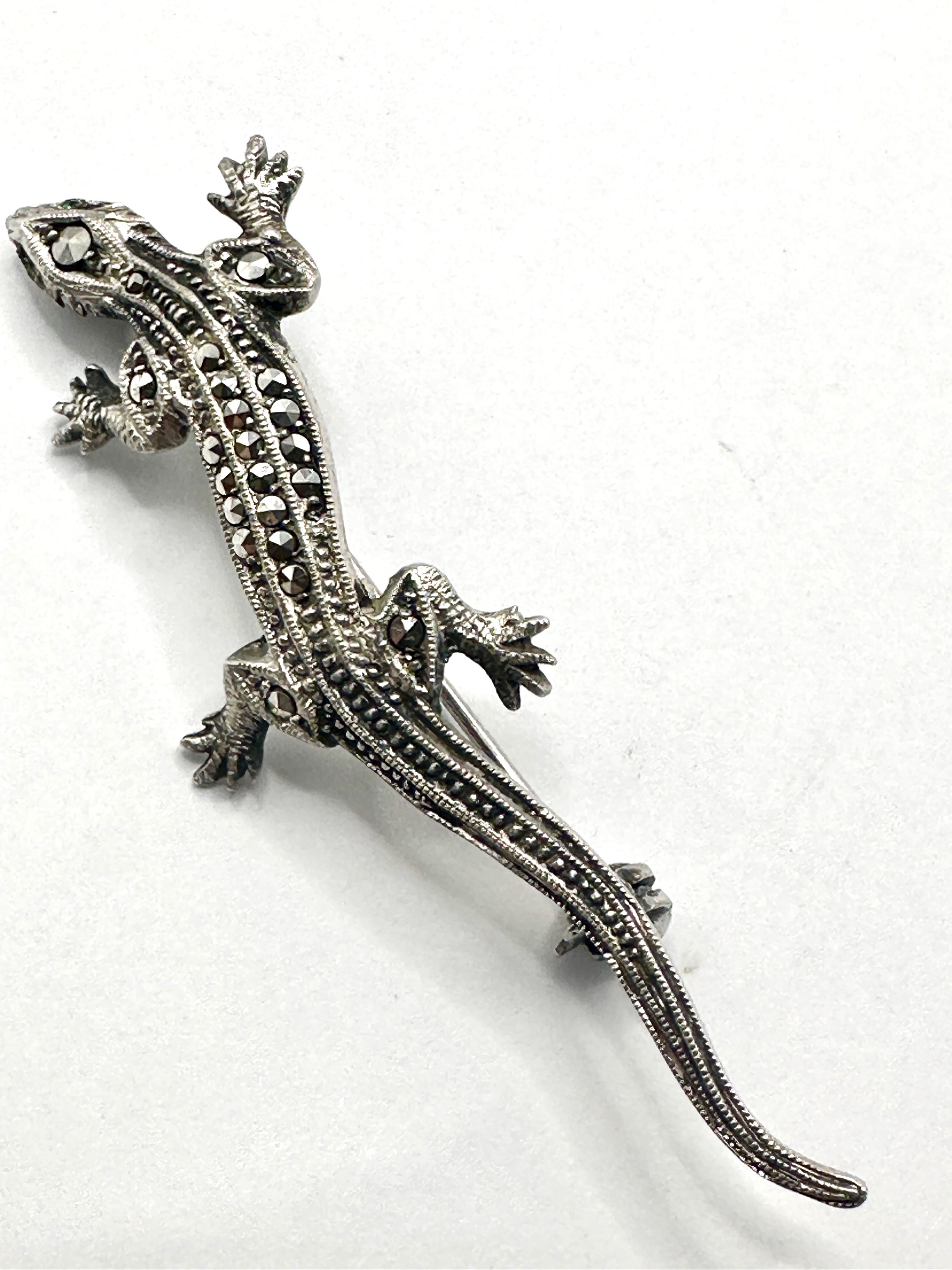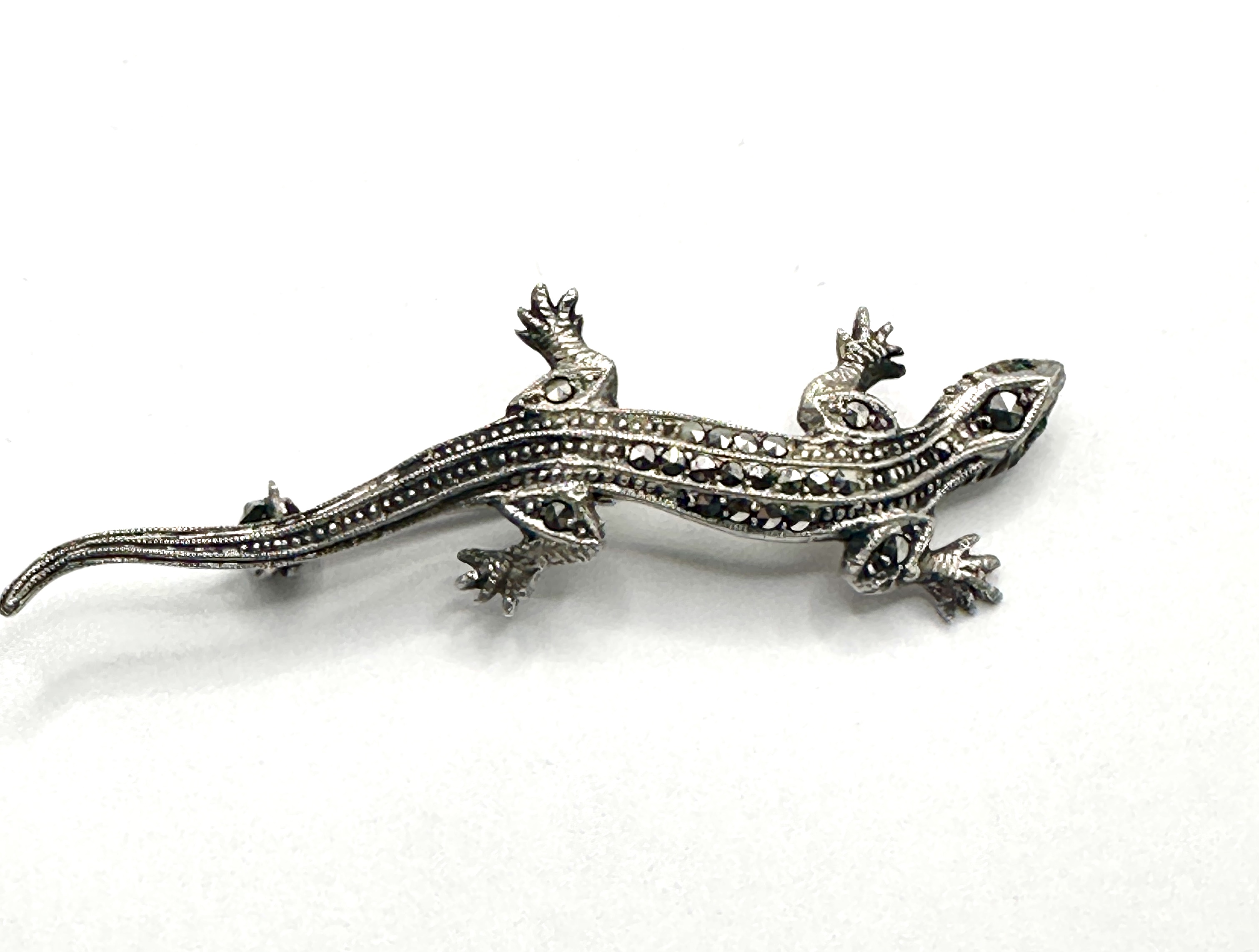A vintage figural brooch in the form of a lizard or gecko with a curved, articulated-style body. The piece is crafted from 925 silver and is pavé-set throughout the head, body, and limbs with rose-cut marcasites. The eyes are accented with two small round-cut green stones. The reverse of the brooch is fitted with a horizontal pin and a roll-over safety clasp. No maker’s marks are visible on the piece.