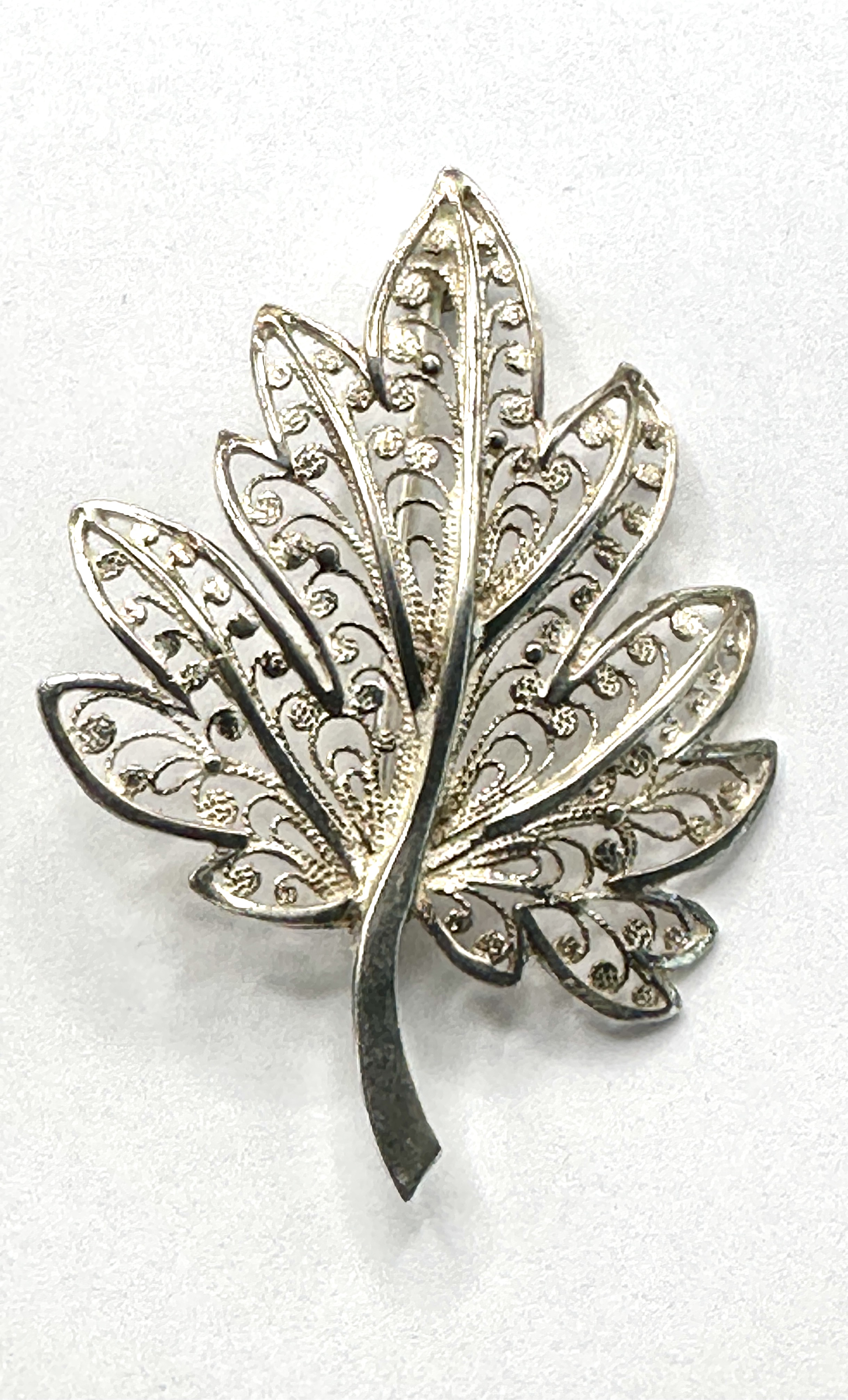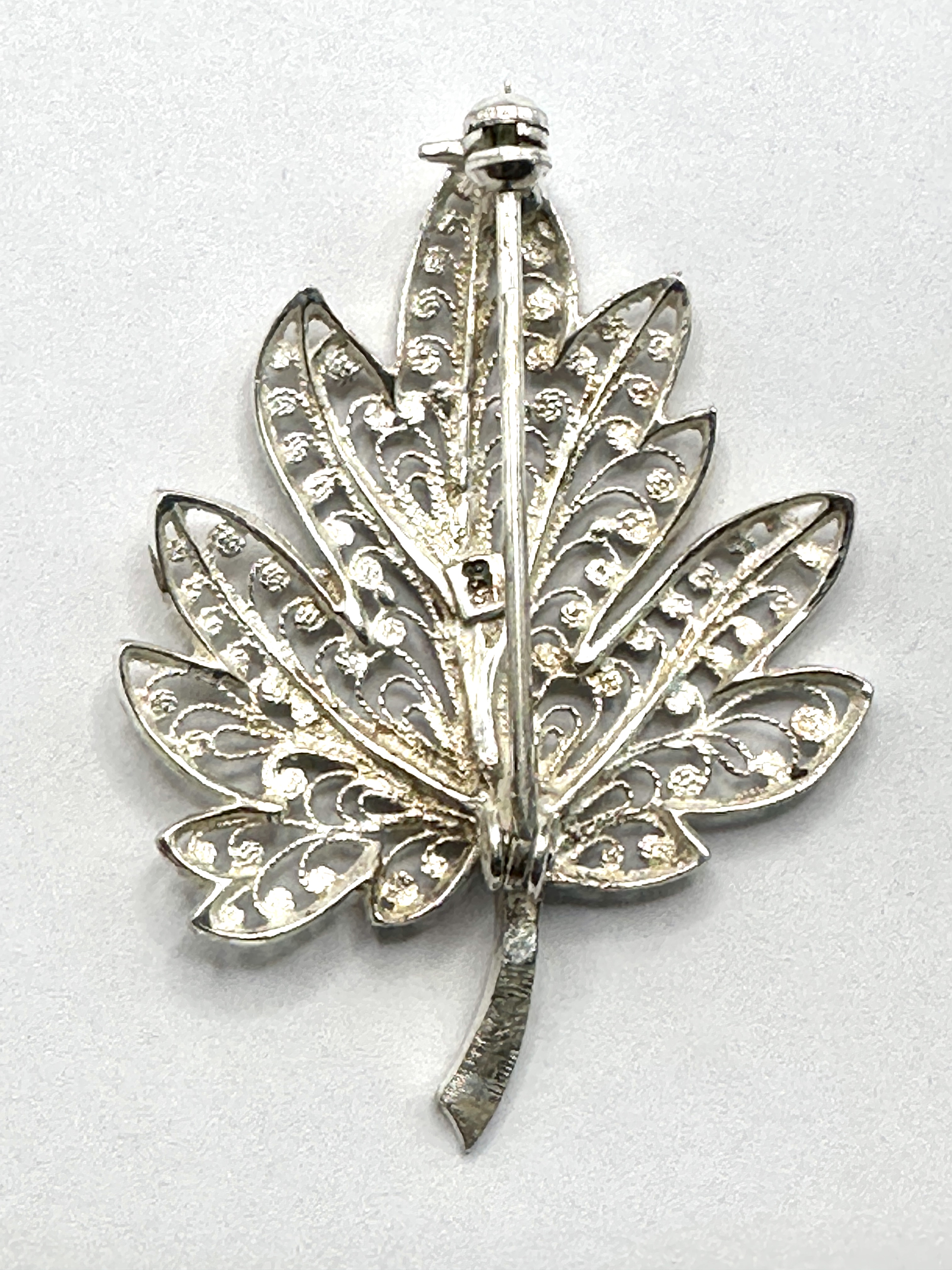 A 925 silver filigree brooch designed in the form of a five-lobed maple leaf. The piece features intricate openwork wire filigree panels within a solid outer frame, further decorated with small granulated silver spheres. The central vein and stem are made of solid silver. The reverse is fitted with a vertical hinged pin and a rolling safety clasp. A small rectangular hallmark is located on the back of the central vein.