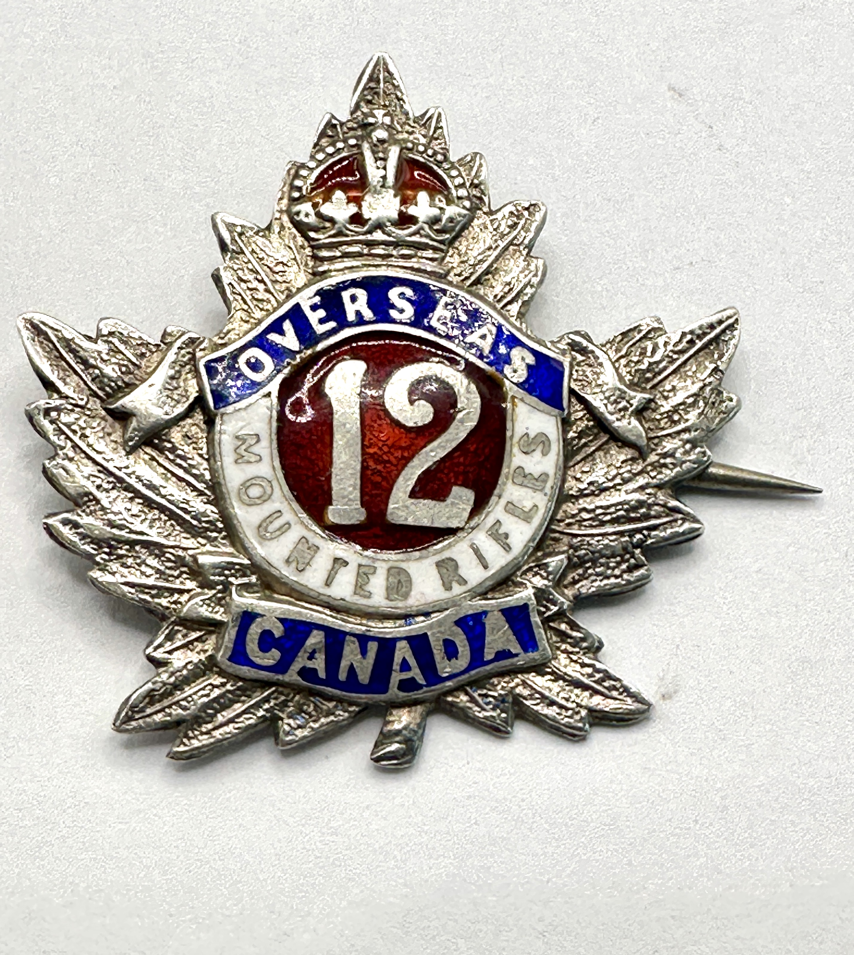 A First World War period enamelled sweetheart badge for the 12th Canadian Mounted Rifles (CMR), an overseas unit of the Canadian Expeditionary Force. The badge is constructed from 925 silver in the form of a maple leaf. It is surmounted by a Tudor Crown featuring red enamel detail. The central circular device consists of a translucent red enameled ground with the number 12 in relief, surrounded by a white enameled ring inscribed MOUNTED RIFLES. This is flanked by two blue enameled scrolls inscribed OVERSEAS to the top and CANADA to the bottom. The reverse is fitted with a horizontal pin and C-clasp fastening.