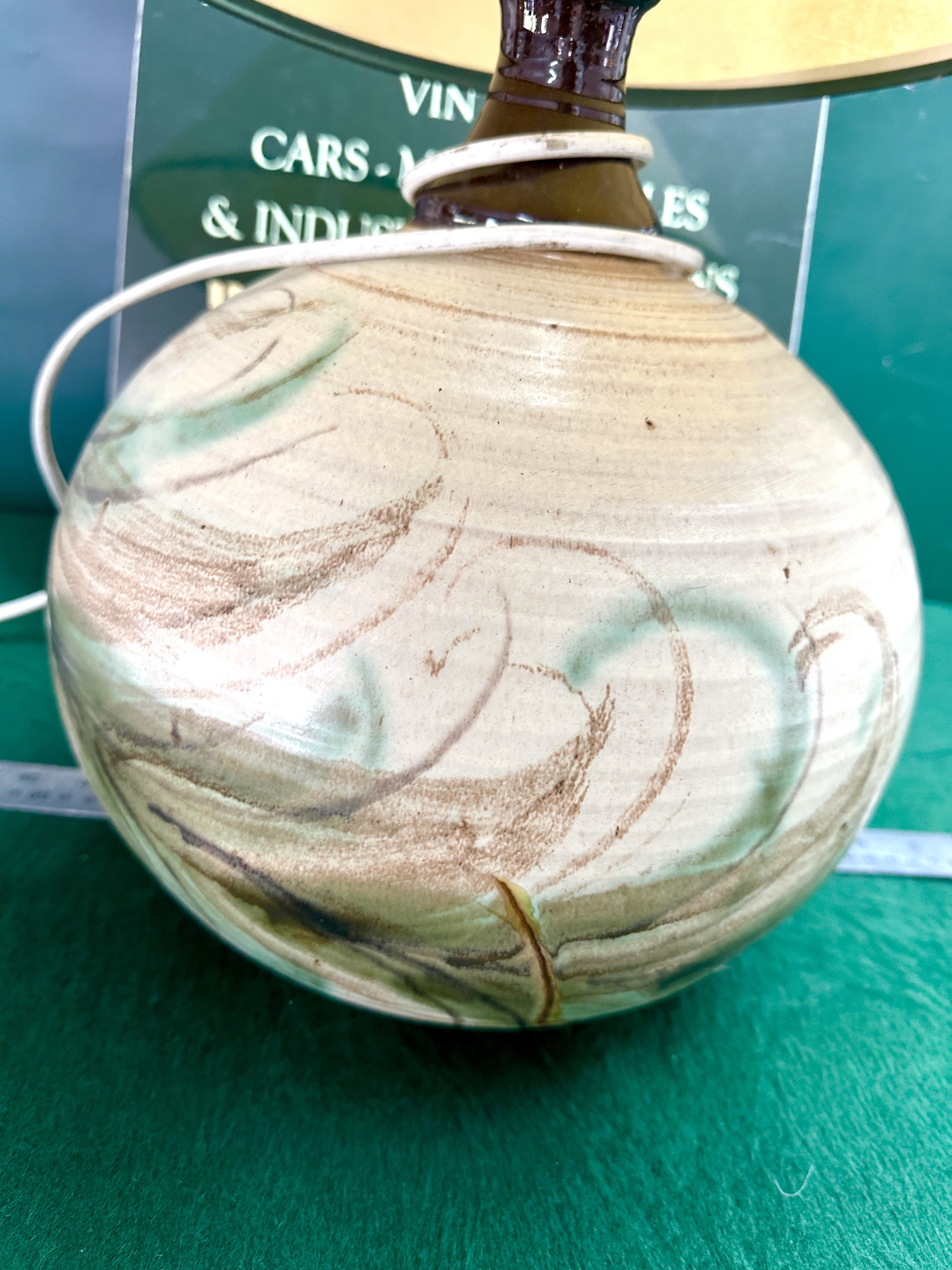 A large studio pottery style table lamp of ceramic and . The lamp features a globular, onion-shaped base with a subtle ribbed texture, hand-painted with large, sweeping abstract swirls in shades of moss green and earthy brown over a neutral cream-coloured glaze. The tapered neck of the base is finished with a dark brown glaze. The lamp is paired with a large conical fabric shade in cream, finished with dark green piping at the upper and lower rims. It is fitted with a white flex and a modern UK 3-pin plug.