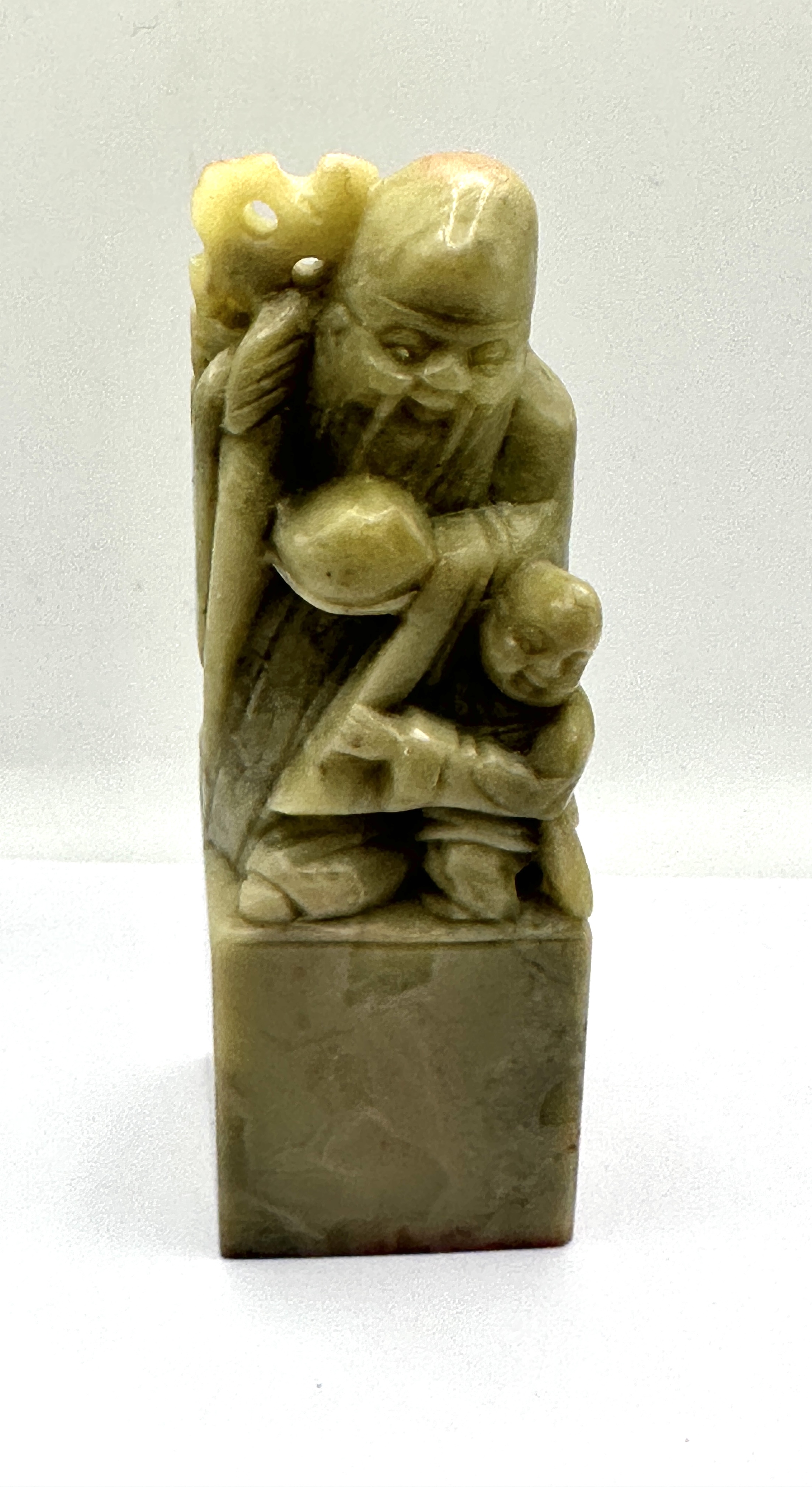 A carved soapstone name seal of square-sectioned form. The seal is surmounted by a figurative group featuring Shoulao, the Chinese God of Longevity, identifiable by his prominent cranium and long beard. He is shown holding a gnarled staff and is accompanied by a small child or acolyte. The piece is fashioned from a mottled greenish-yellow stone with natural variegation. The base is incised with the name DAVID in Latin characters and the Chinese transliteration 大卫 (Dawei). Red cinnabar ink residue is present on the underside.