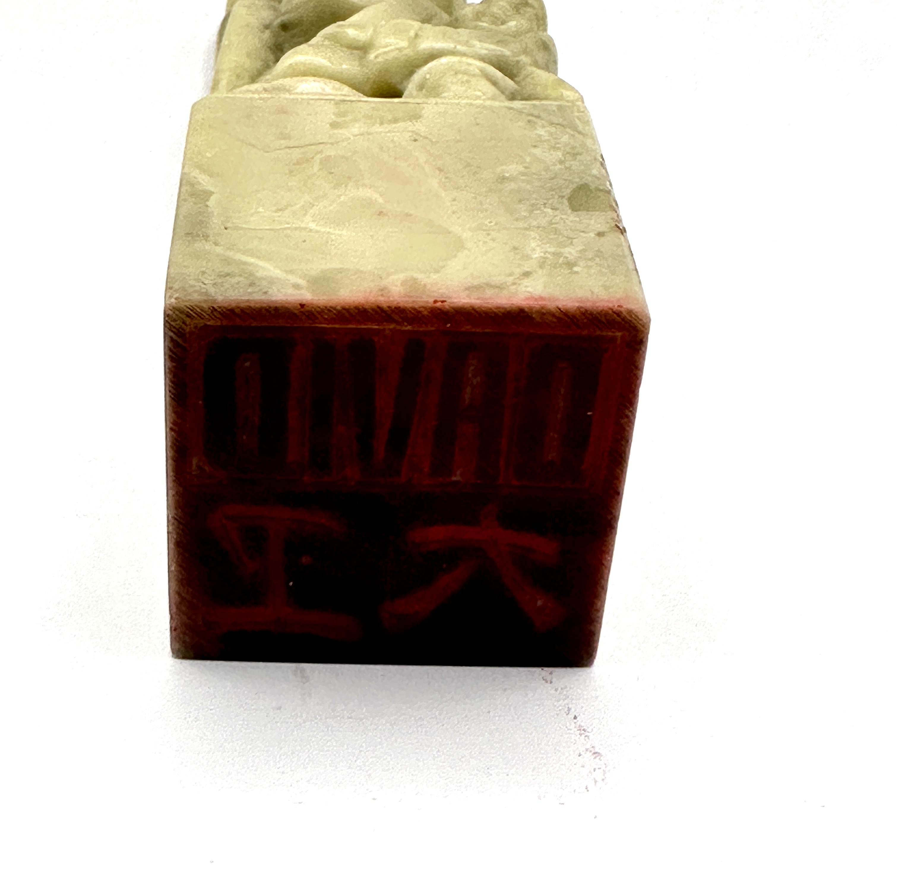 The item displays minor surface wear, small abrasions, and tiny chips to the edges of the plinth and the carved figures. There is heavy residue of red seal paste on the stamping surface.
