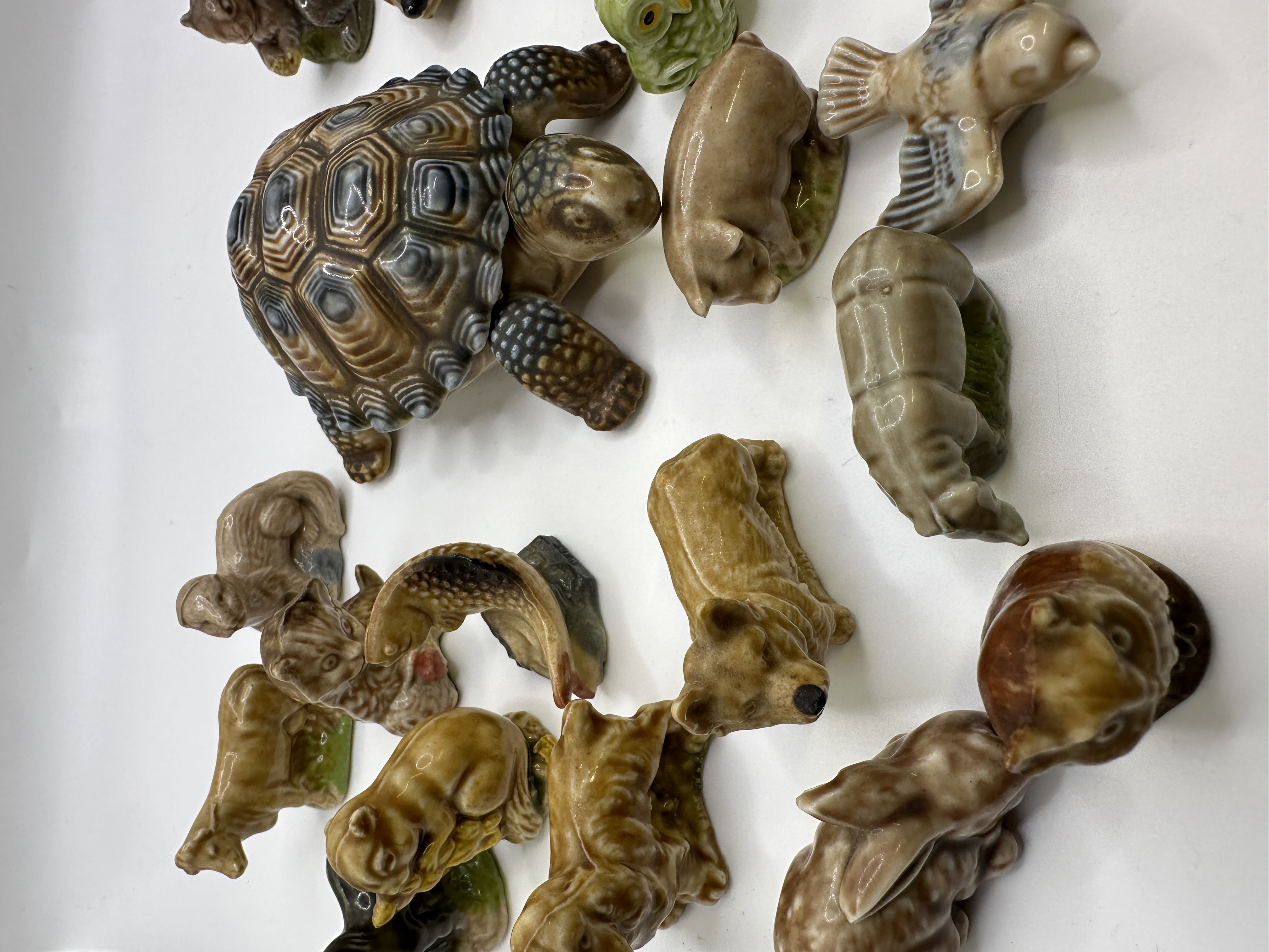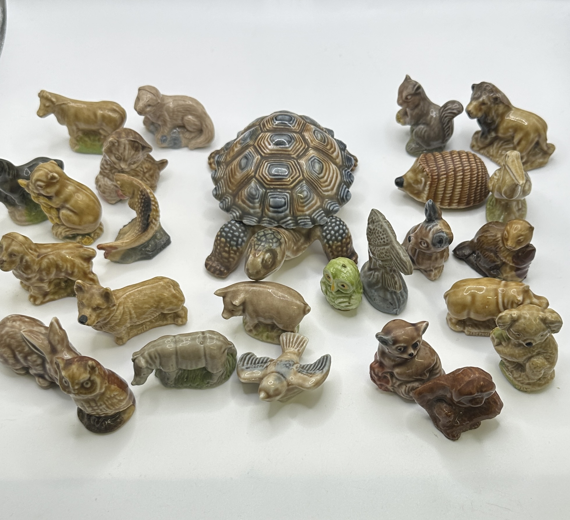 A collection of miniature glazed ceramic animal figurines produced by Wade Ceramics in England. This group includes a diverse range of animals from the popular Whimsies and Red Rose Tea series. The lot is anchored by a large tortoise with a detailed, segmented shell in various brown and grey glazes. The assortment features mammals including a cow, lion, squirrel, hedgehog, pig, Corgi-style dog, rabbit, koala, bear cub, rhinoceros, bison, and a monkey. Avian figures are represented by a brown owl, a small green owl, and a bird in flight. Marine life is depicted through fish figurines. Each item is constructed from moulded ceramic and finished with a high-gloss, multi-toned glaze. Several pieces bear the embossed Wade England mark on their bases.
