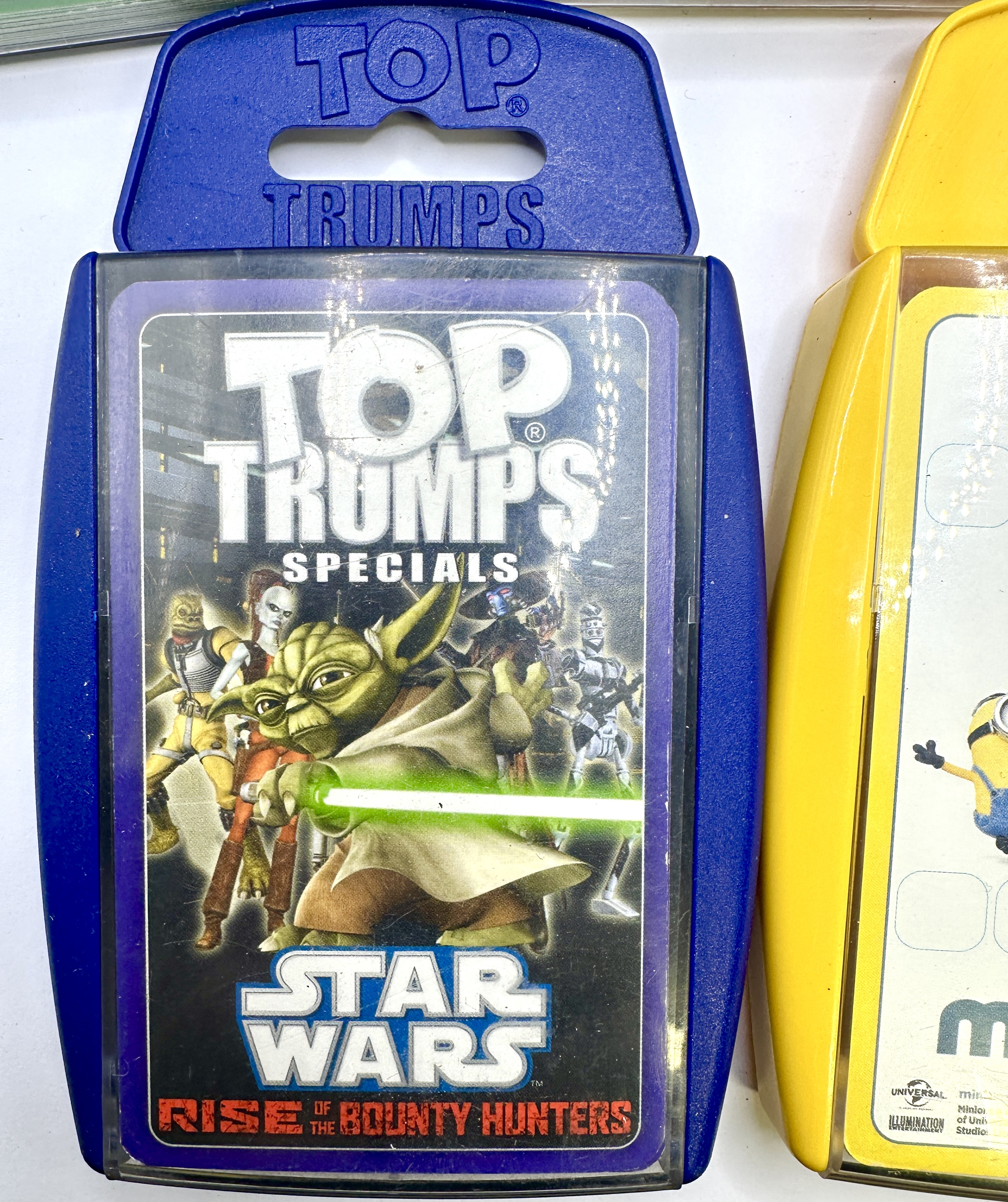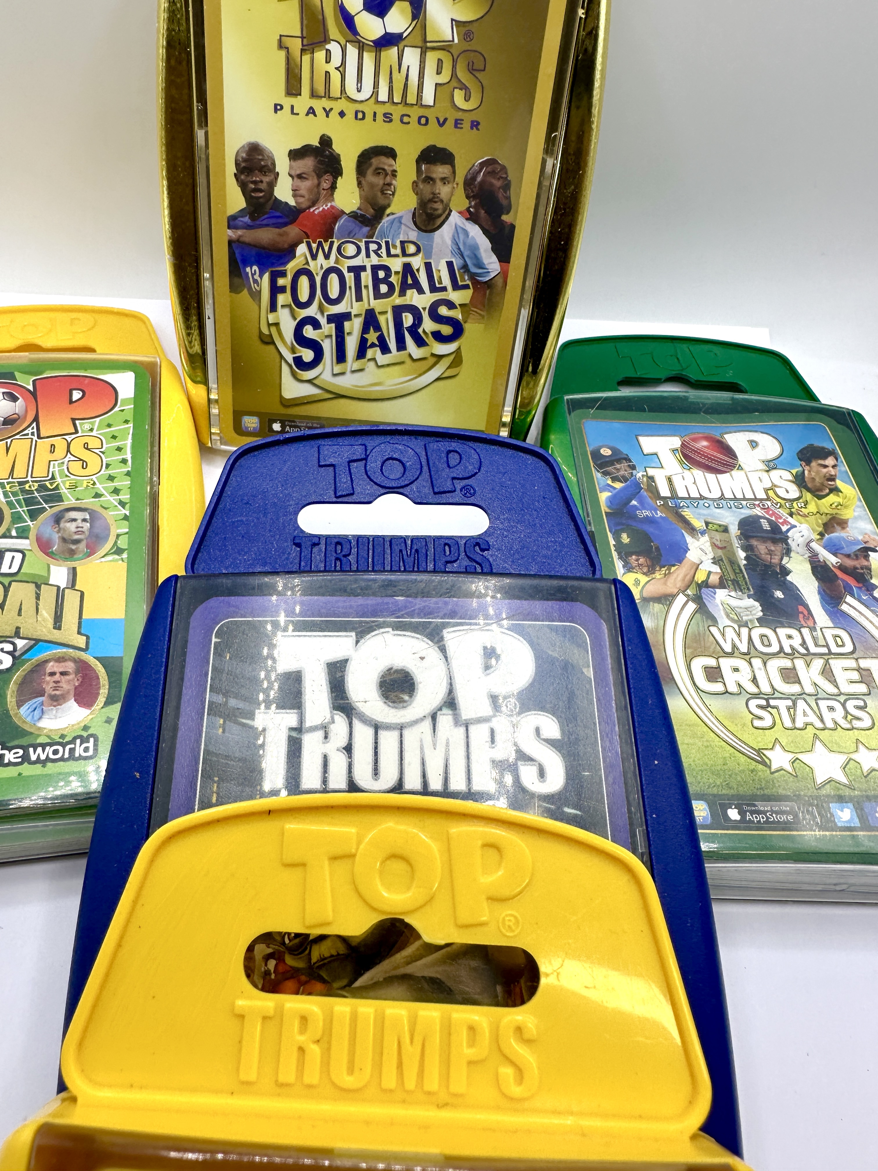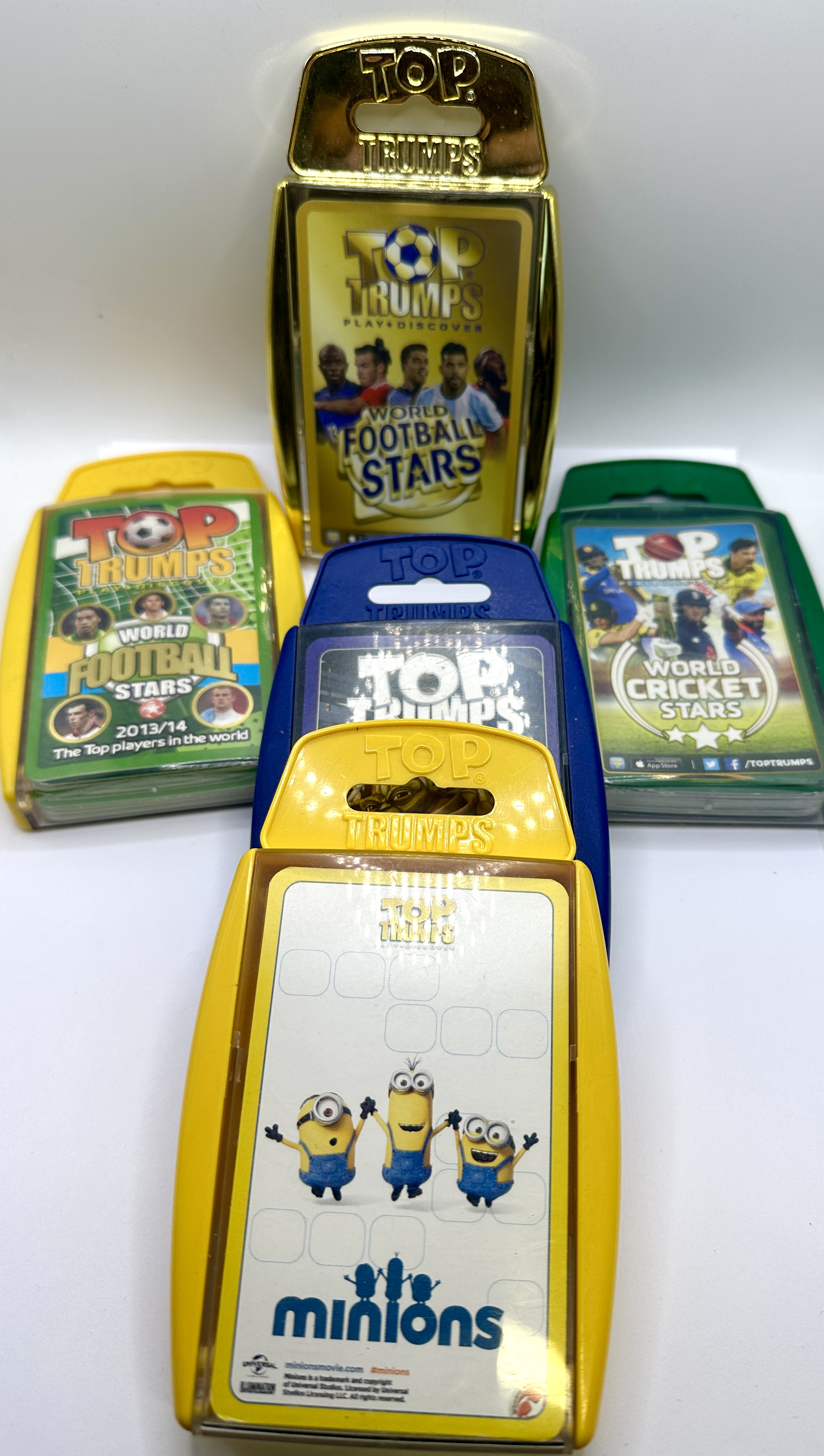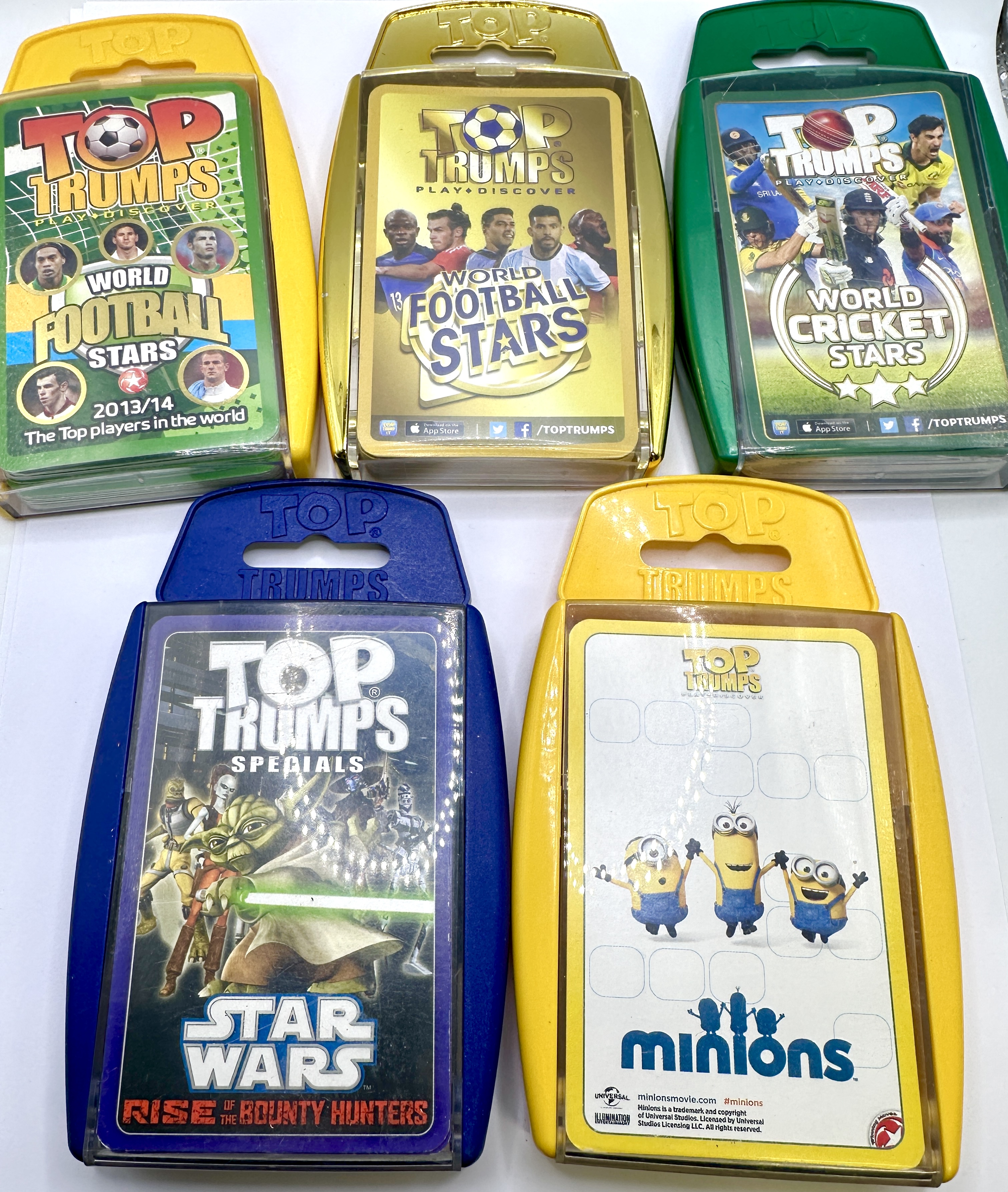 A collection of themed card game decks from the Top Trumps series produced by Winning Moves. Each deck is contained within its original proprietary plastic hardshell carrying case with a transparent front cover. The collection includes a World Football Stars Gold Edition set in a metallic gold-toned case featuring players N’Golo Kanté, Gareth Bale, Luis Suárez, Sergio Agüero, and Paul Pogba. Also included is a World Football Stars 2013/14 set in a yellow case featuring circular portraits of players including Cristiano Ronaldo, and a World Cricket Stars set in a green case. The collection further contains a Star Wars: Rise of the Bounty Hunters set from the Specials series in a blue case featuring Yoda with a green lightsaber, and a Minions themed deck in a yellow case featuring the characters Kevin, Stuart, and Bob. The items feature official branding for Top Trumps, Universal Studios, and Illumination Entertainment where applicable.