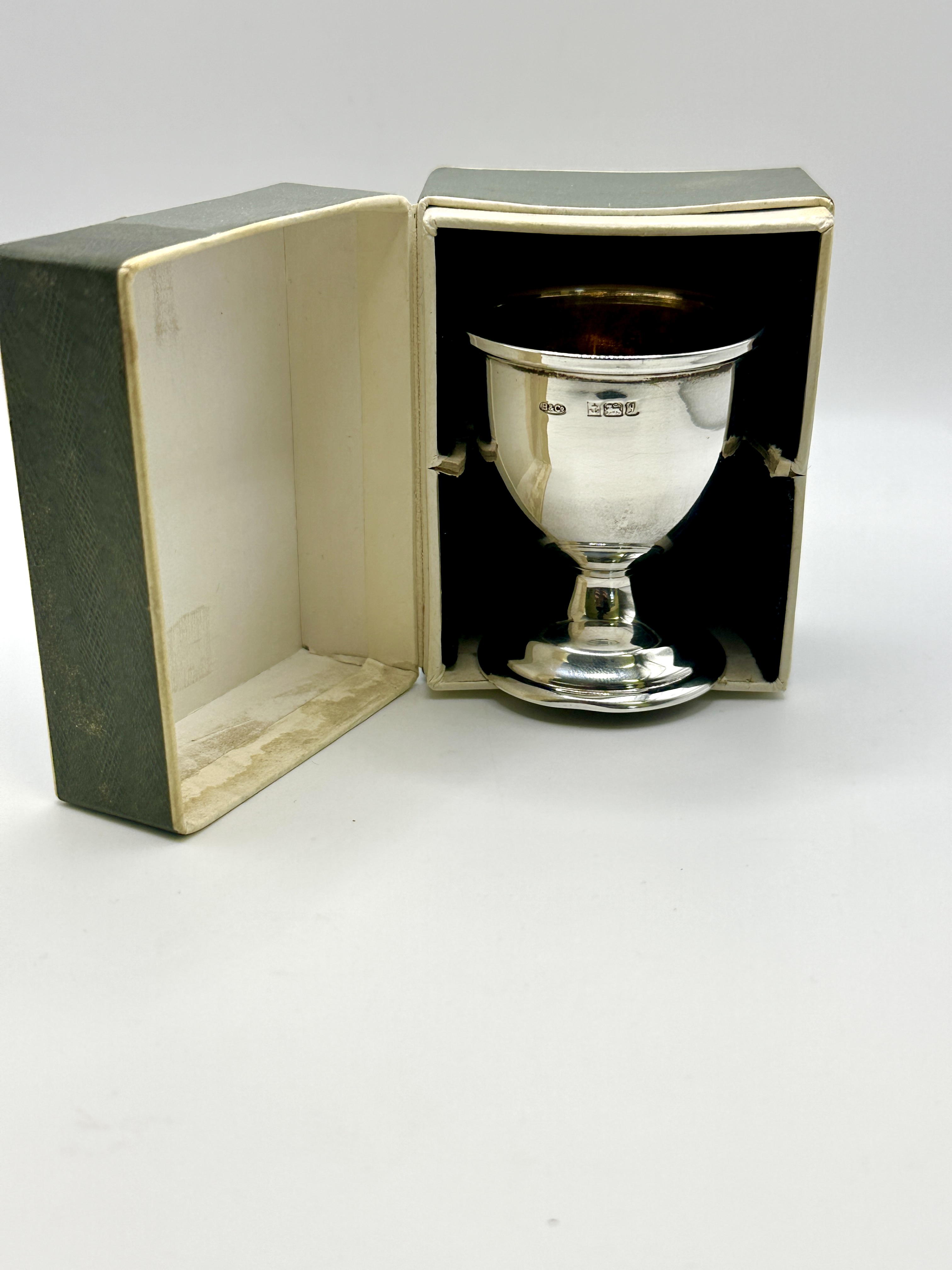 This Edwardian egg cup is crafted from 925 silver and features a classic pedestal form with a circular spreading foot and a slightly flared rim. Both the rim and the base are decorated with a subtle reeded border. The interior retains a visible gold-wash gilt finish. The item bears the maker mark E and Co in an oval cartouche for Elkington and Co. Adjacent hallmarks include an anchor for the Birmingham assay office, a lion passant confirming the use of 925 silver, and the lowercase date letter l for the year 1910. The egg cup is housed in its original green fitted presentation box, with the interior lid gold-stamped for the retailer H. L. Brown and Son, Jewellers by Appointment, 70, Fargate, Sheffield.