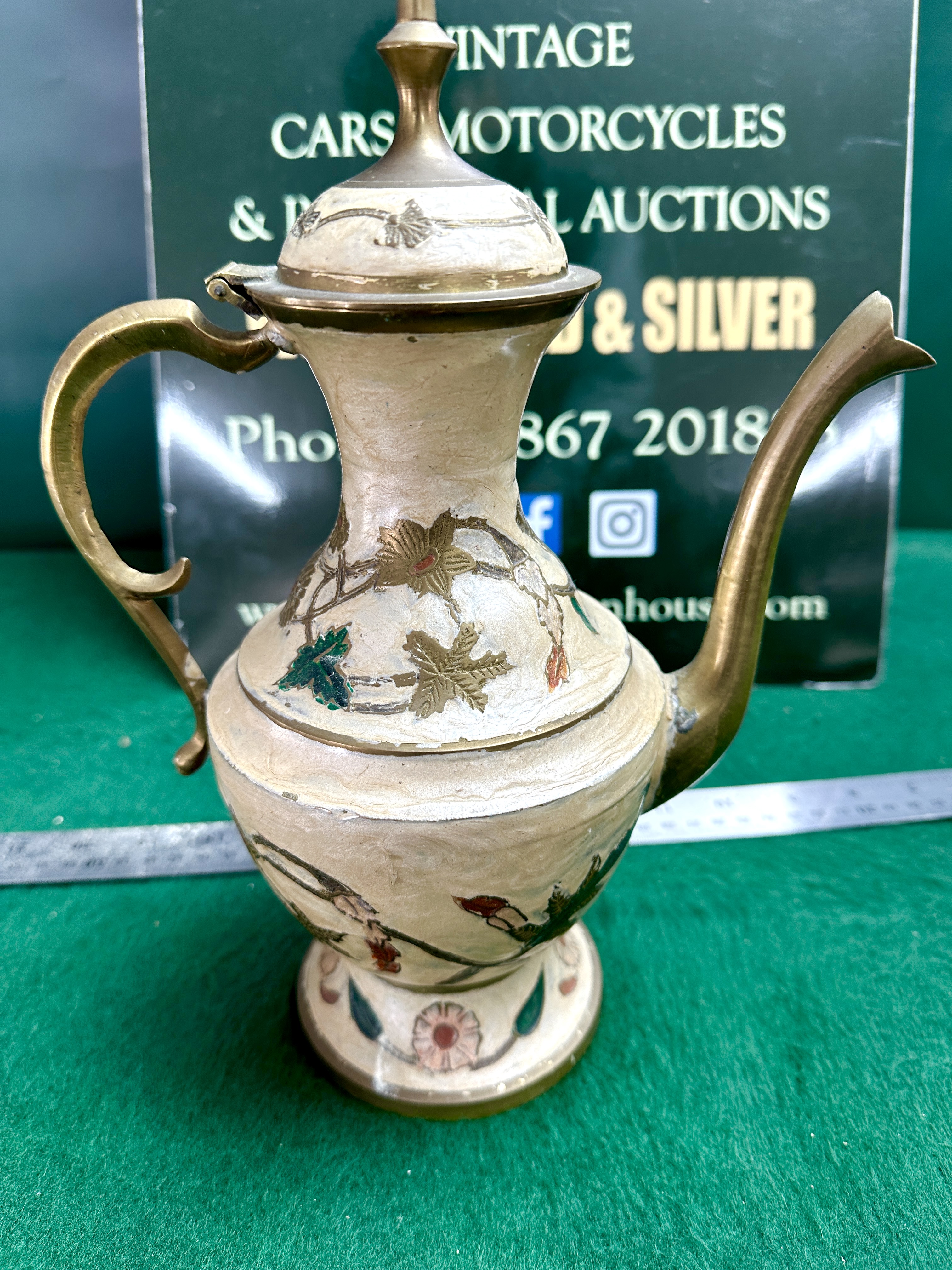 A small decorative lidded brass ewer or coffee pot, designed in an Orientalist style reminiscent of a traditional Middle Eastern dallah. The piece features a bulbous body supported by a pedestal base, a curved handle, and a tapered spout. The central body and lid are finished with a white lacquer or enamel coating, decorated with hand-painted floral and foliate motifs in green, red, and gold tones. The handle, spout, lid finial, and base are constructed from cast brass. The lid is attached via a simple hinge and features a pointed finial. No maker marks or signatures are visible. Items of this type were frequently produced in regions such as India or North Africa for the export and souvenir markets during the mid-20th century.