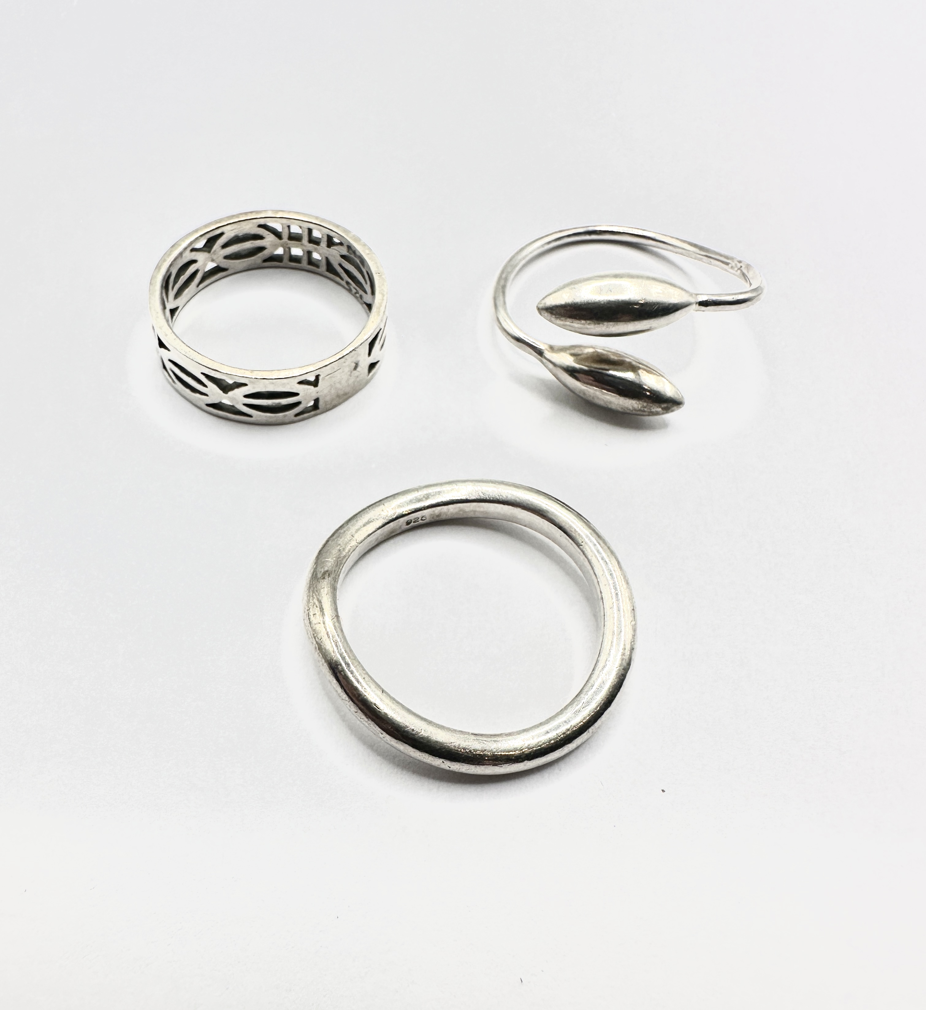 A collection of three contemporary 925 sterling silver rings. The first is a wide band featuring an openwork geometric cutout pattern around the circumference. The second is a bypass style wrap-around ring terminating in two polished navette or seed-shaped finials. The third is a plain, heavy-gauge band with a rounded, organic profile. Both the geometric band and the plain band are stamped 925.