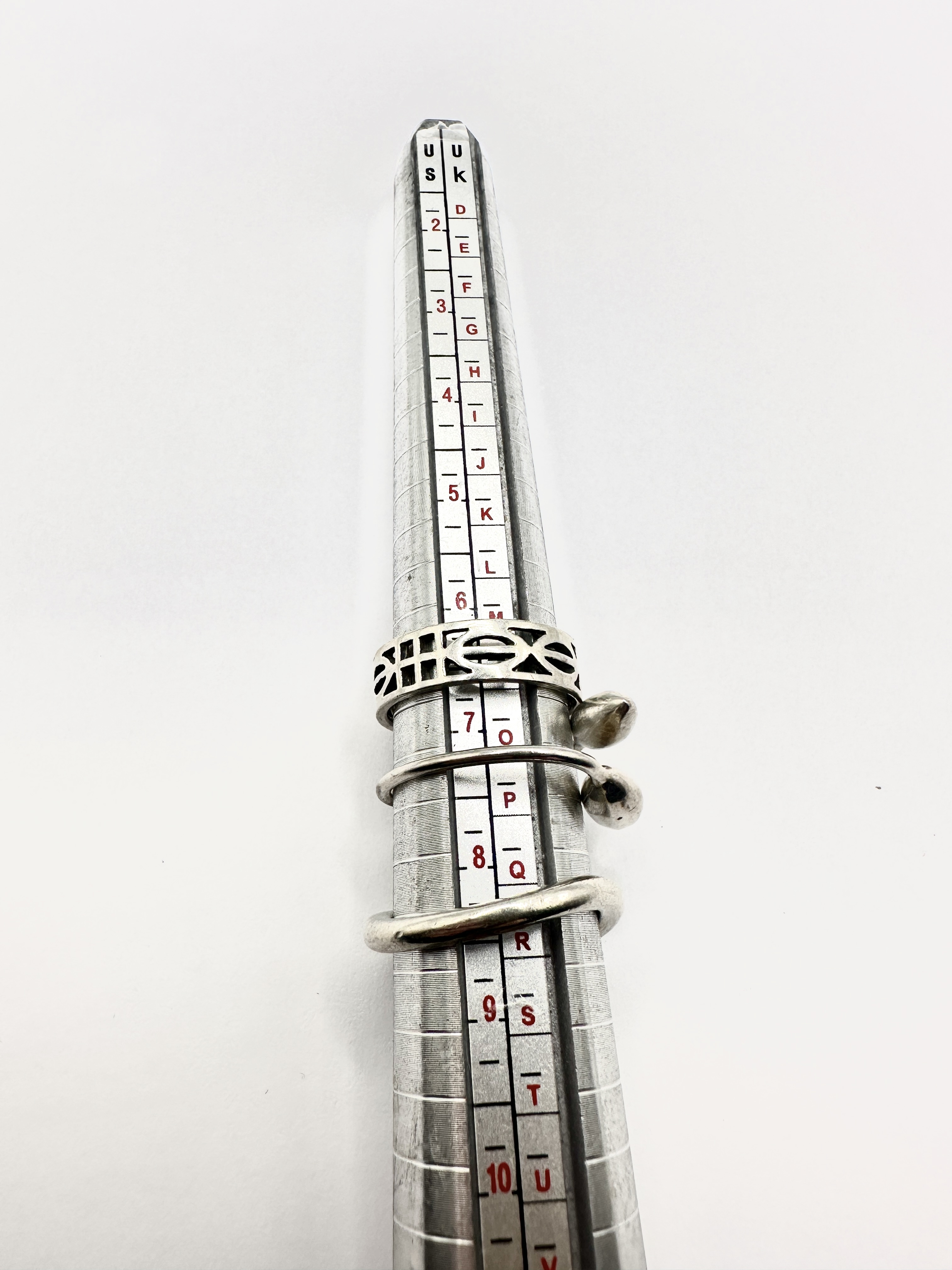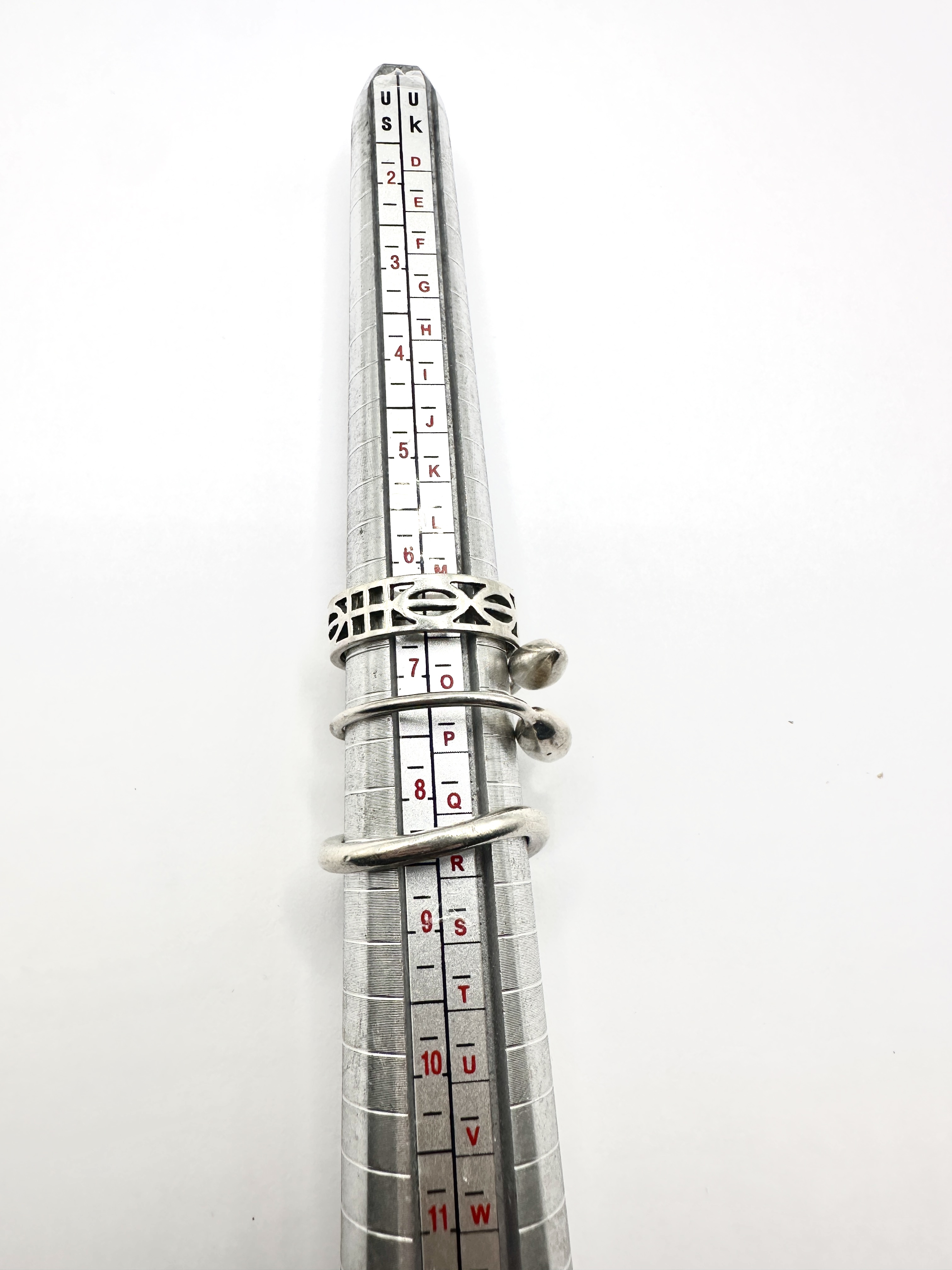 The rings are in good auctionable condition, showing minor surface scratches and light tarnish consistent with moderate use.