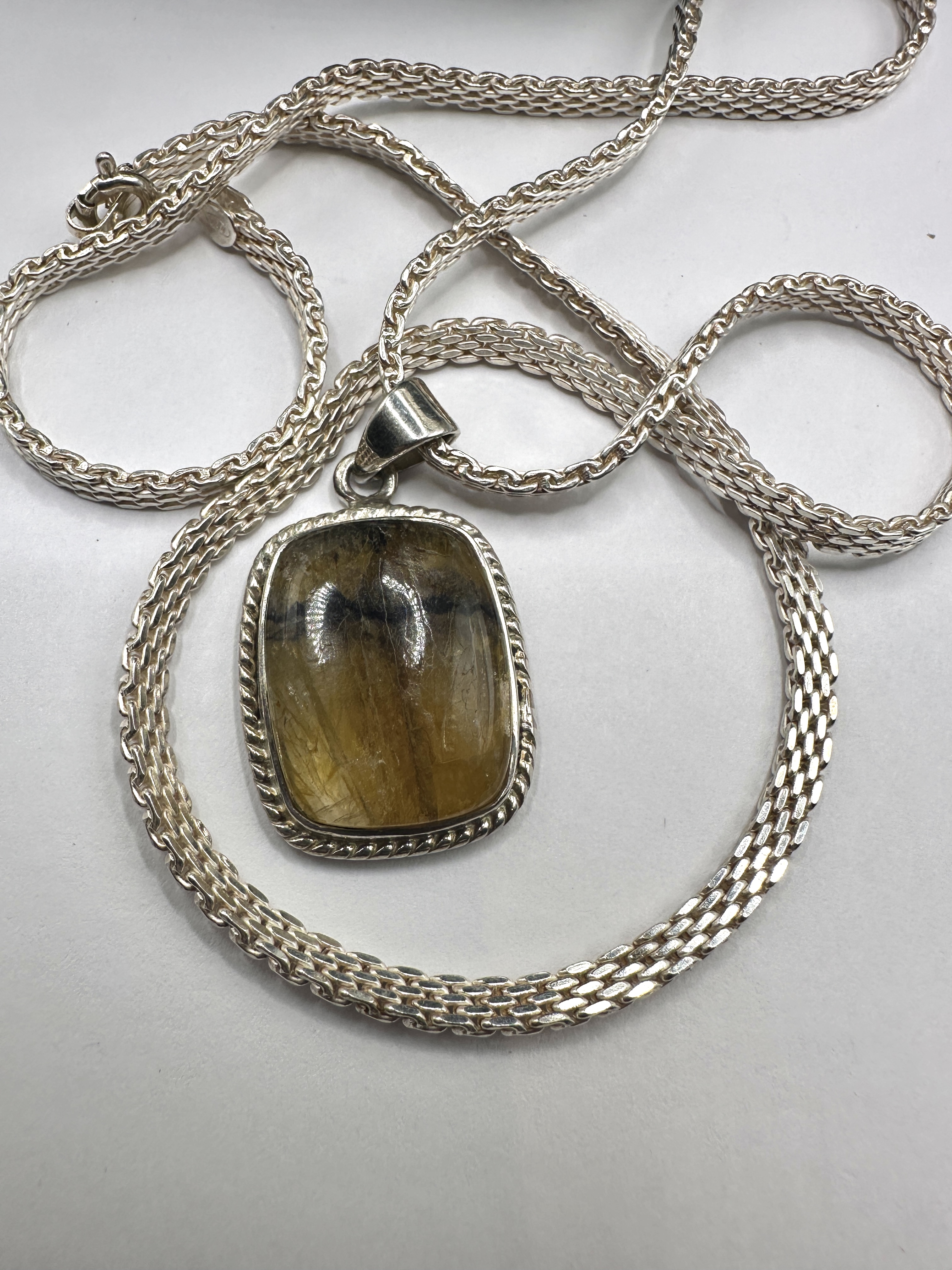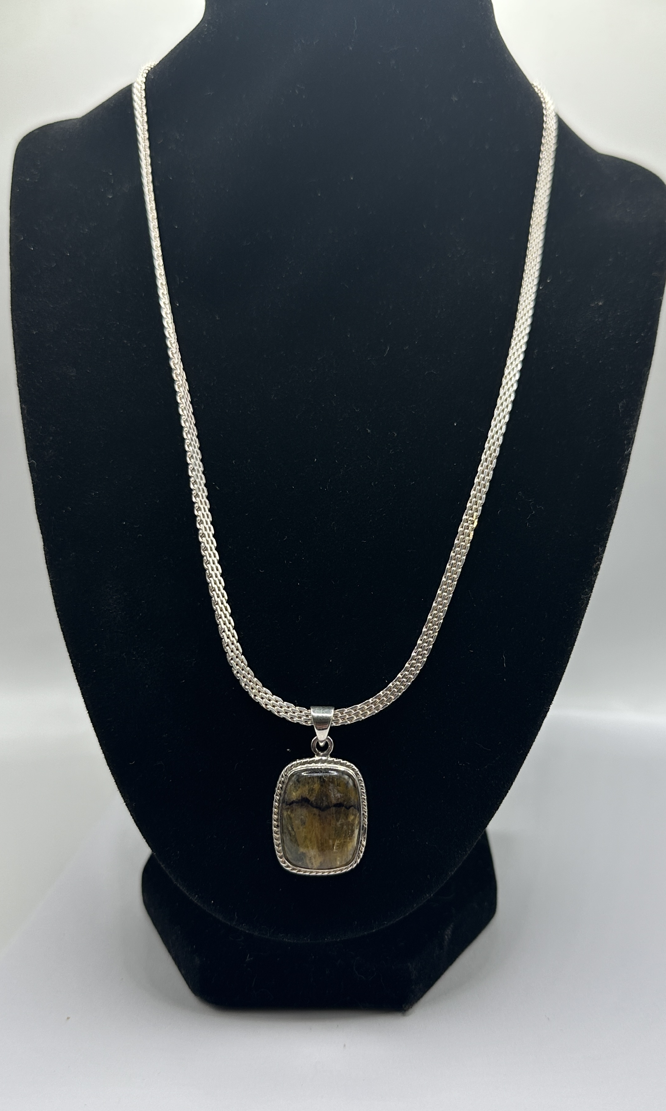 A 925 silver pendant necklace featuring a large Derbyshire Blue John specimen stone. The rectangular cushion-cut stone displays the characteristic translucent yellowish-brown hues and dark purple-black banding typical of fluorite sourced from the Castleton area. The stone is bezel-set within a 925 silver frame featuring a decorative twisted rope-style border and is suspended from a polished, tapering silver bail. The pendant is presented on a substantial woven silver chain of Spiga or wheat link construction, secured with a lobster claw clasp. A small metal tag near the clasp is marked 925.