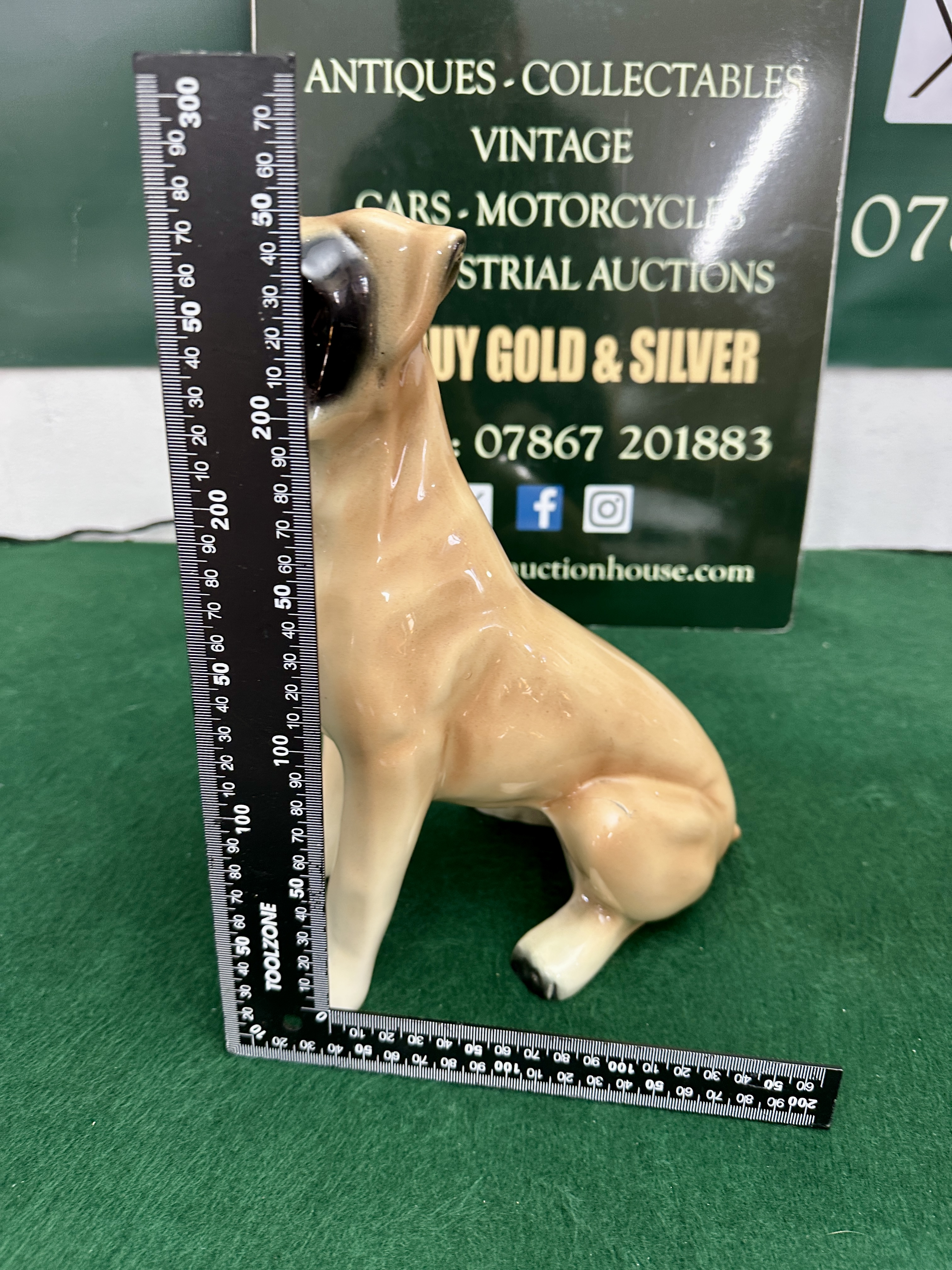 A glazed ceramic figurine of a Boxer dog, attributed to Jema Holland, model number 138. The dog is modelled in a seated pose with a naturalistic fawn-coloured coat, featuring a characteristic black mask around the eyes and muzzle, and white detailing on the chest and lower face. The piece is finished with a high-gloss glaze and features painted eyes. There are no visible maker marks on the exterior body of the figurine.