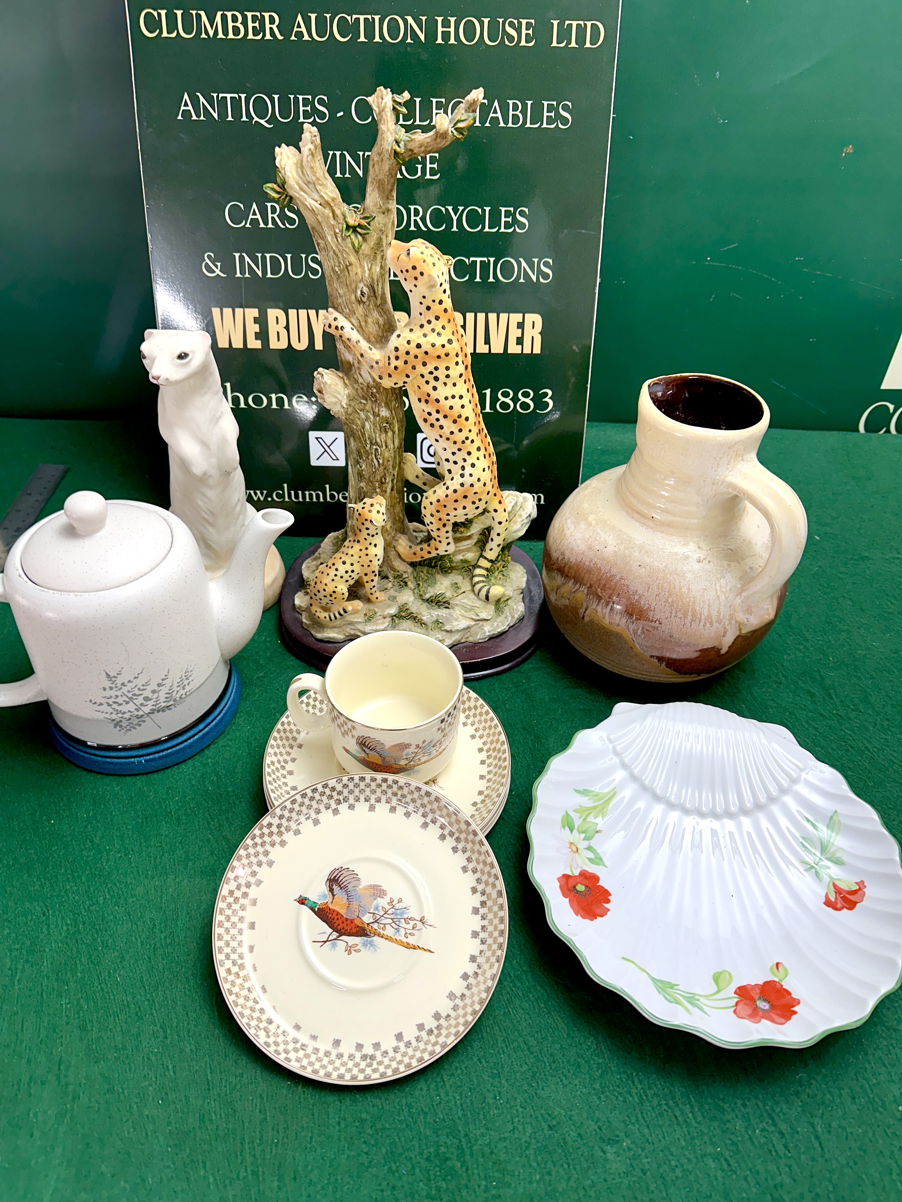 The collection is in generally good condition. No significant chips, cracks, or restorations are visible to the cheetah figurine or the ferret. The teapot, shell dish, and stoneware jug appear sound. Minor surface wear and fine glaze crazing are present on the pheasant patterned tea ware consistent with age and use.