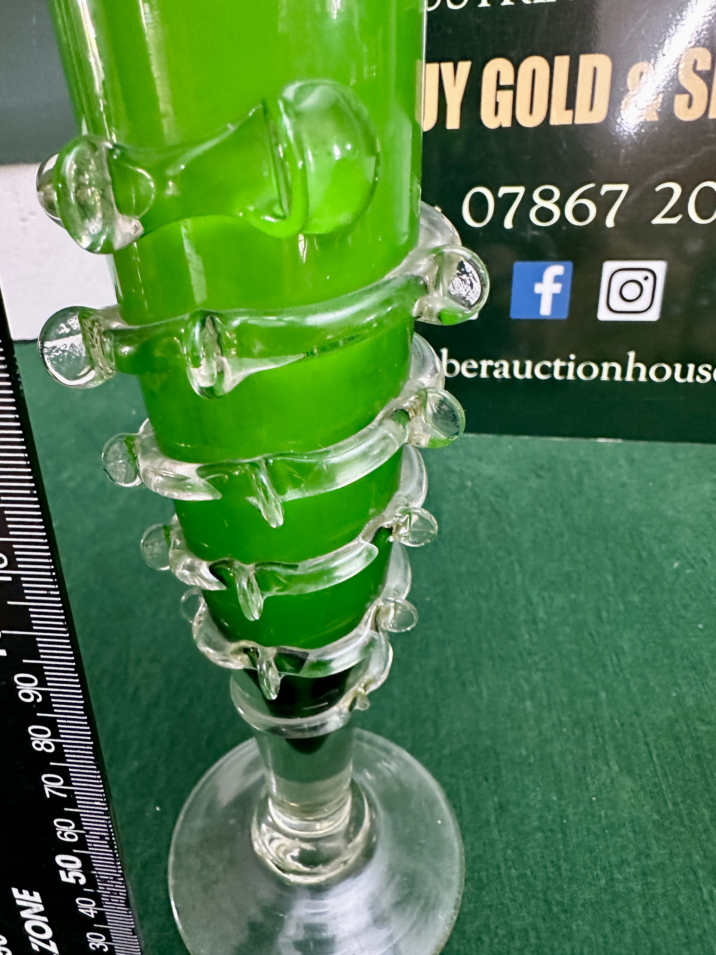 The vase is in good antique condition. There is light surface wear to the underside of the base consistent with age. The delicate applied rigaree is largely intact, though there are several minor flea-bite nicks to the sharp projections. No significant chips, cracks, or restorations are visible to the main body or rim.