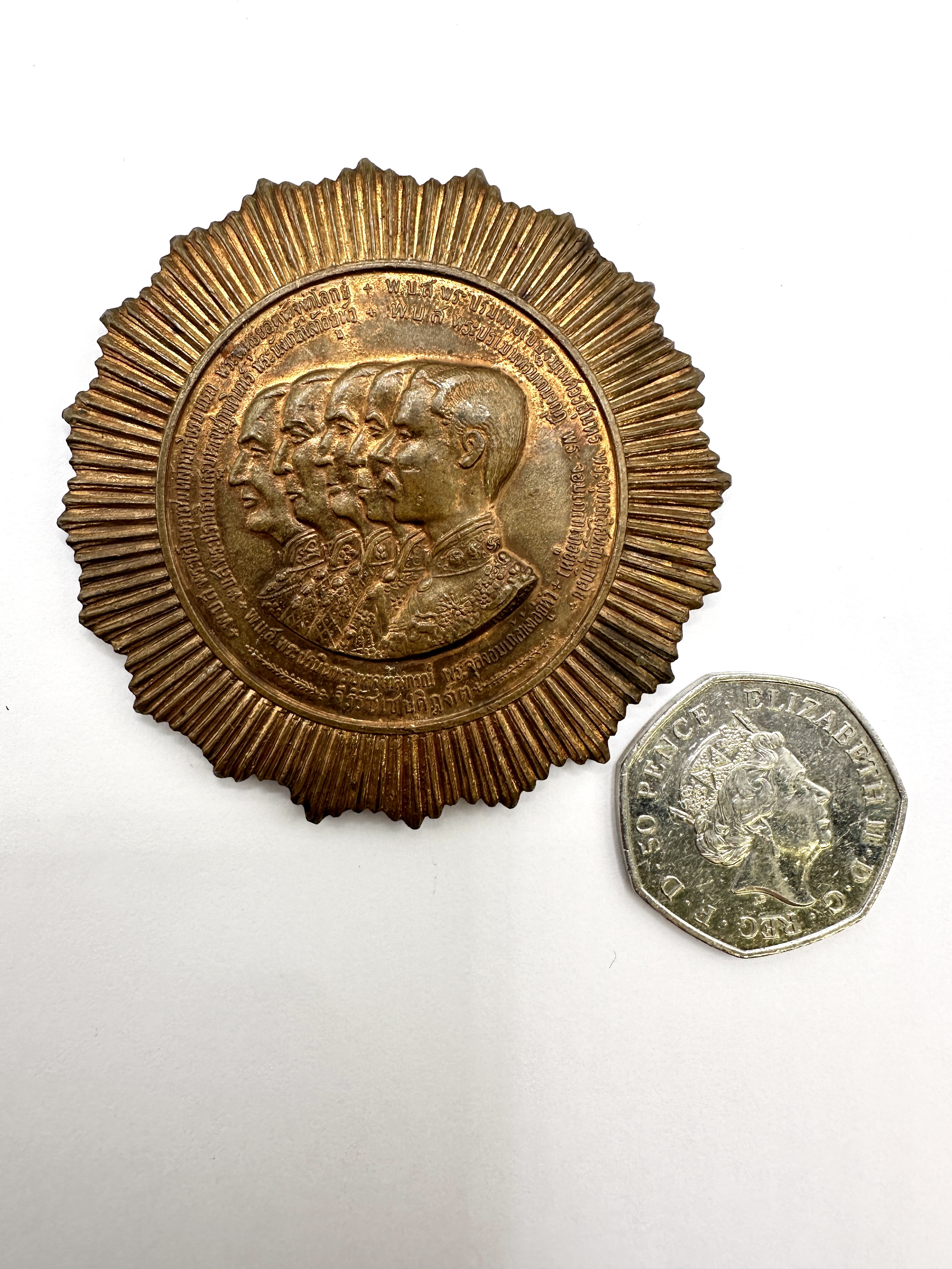 A large commemorative medallion struck in a copper-based alloy with a bronze or gilded finish. The obverse features the overlapping profile portraits of five monarchs from the Thai Chakri Dynasty facing left, set within a central circular panel. This central panel is surrounded by a broad border consisting of radiating rays in a sunburst pattern. Encircling the portraits is a band of Thai script. The reverse displays a central royal emblem above several lines of Thai text, similarly framed by a sunburst border and an outer band of Thai inscriptions. The piece is constructed as a solid, struck medal.